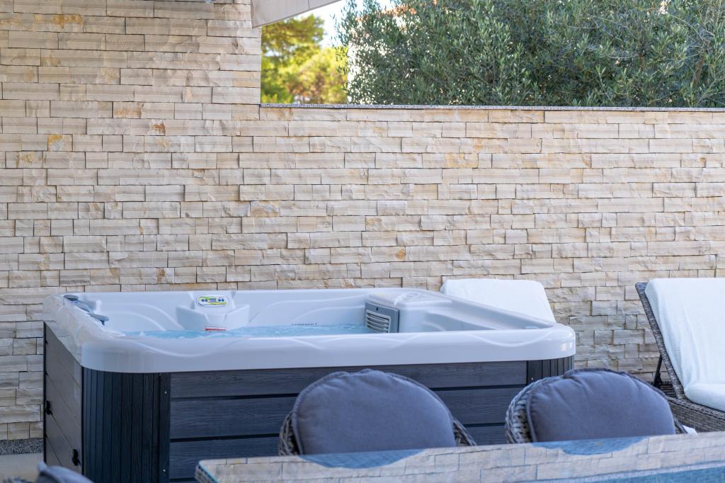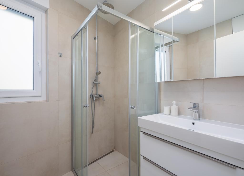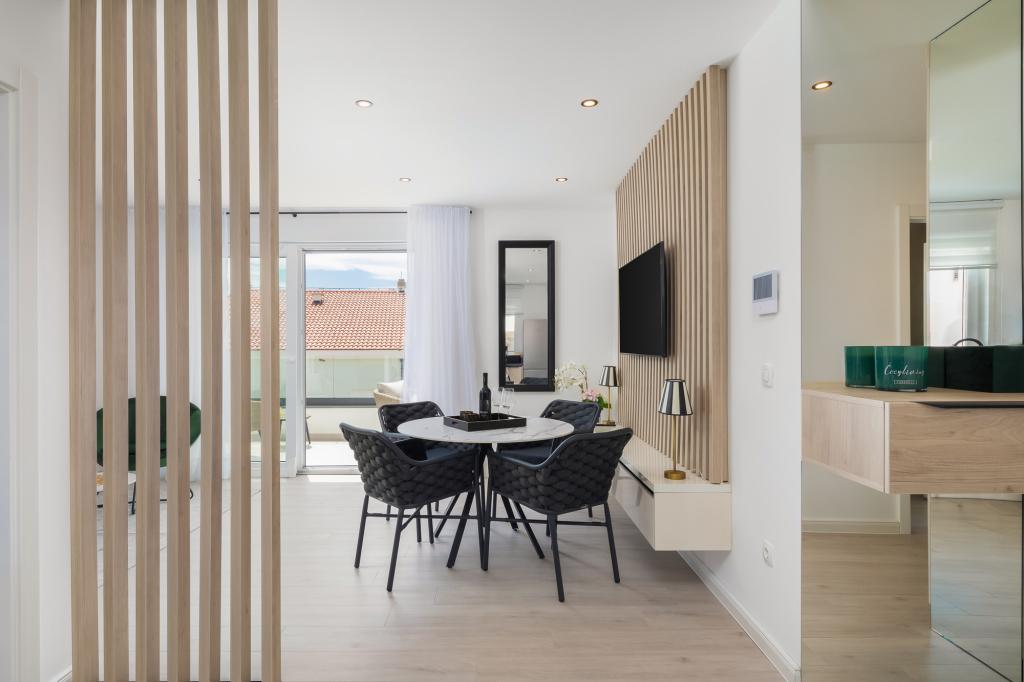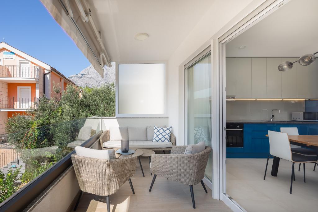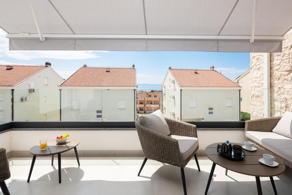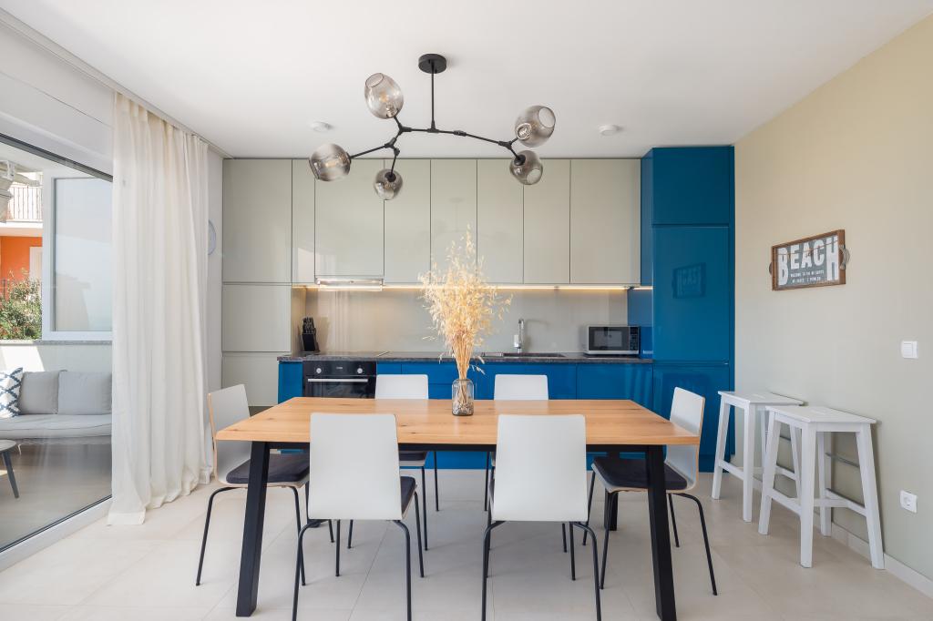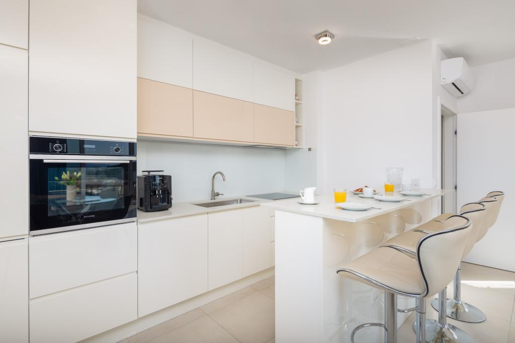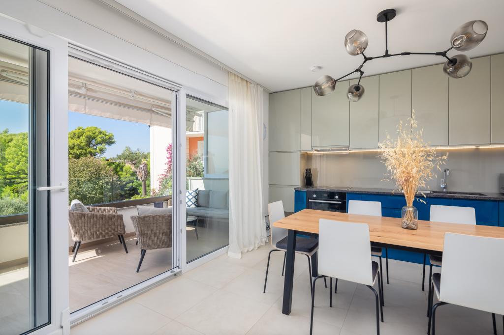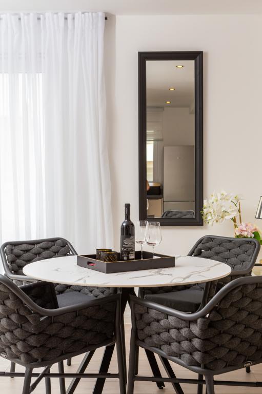 Apartman su opremljeni vrhunskim namještajem i uređajima. Apartman u prizemlju ima elektroničku tendu i dodatni vanjski tuš.