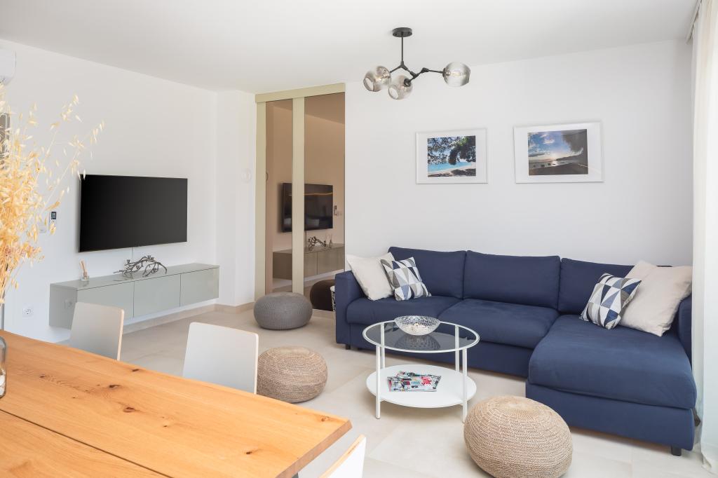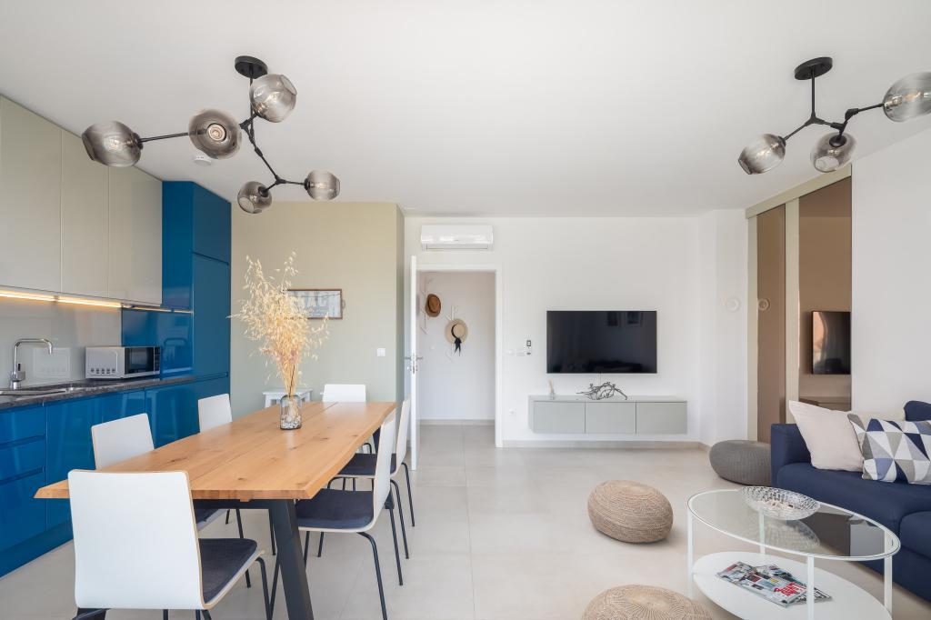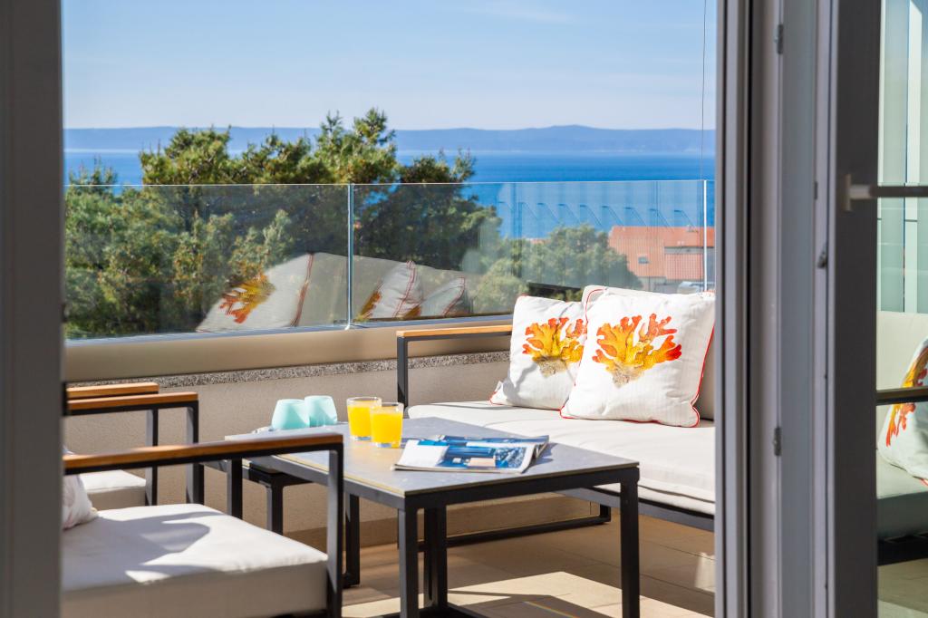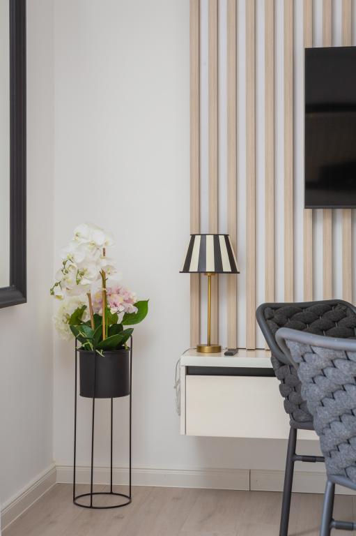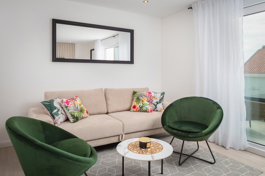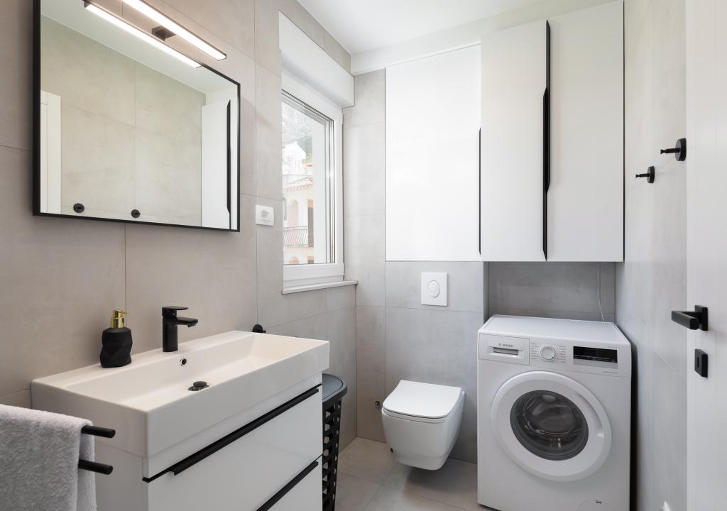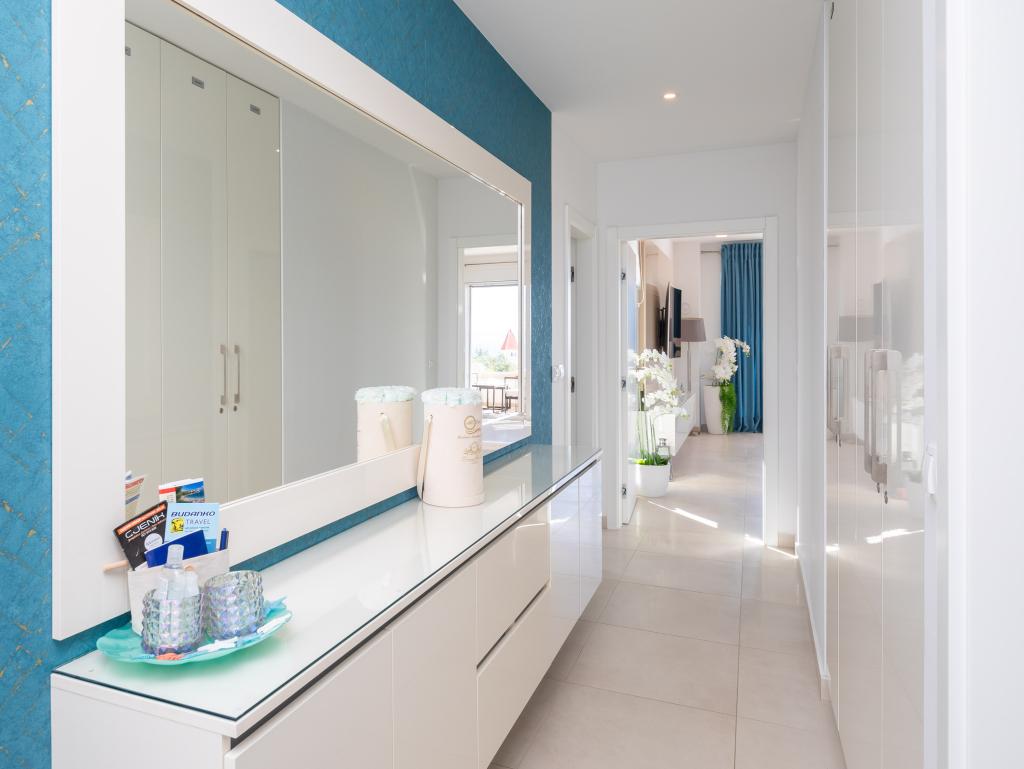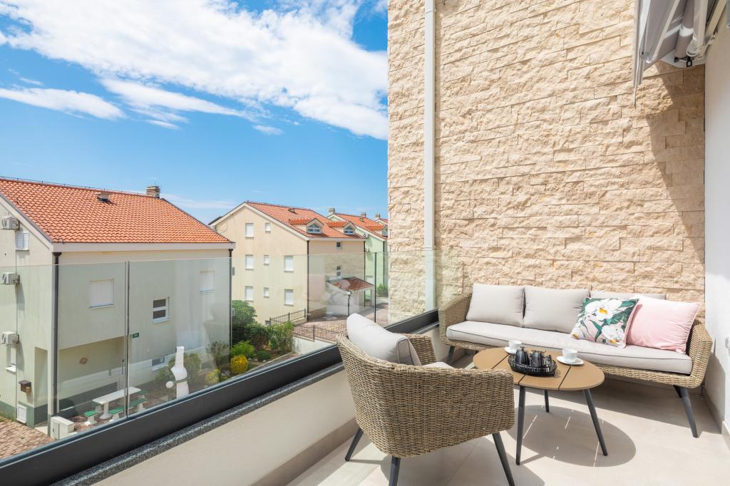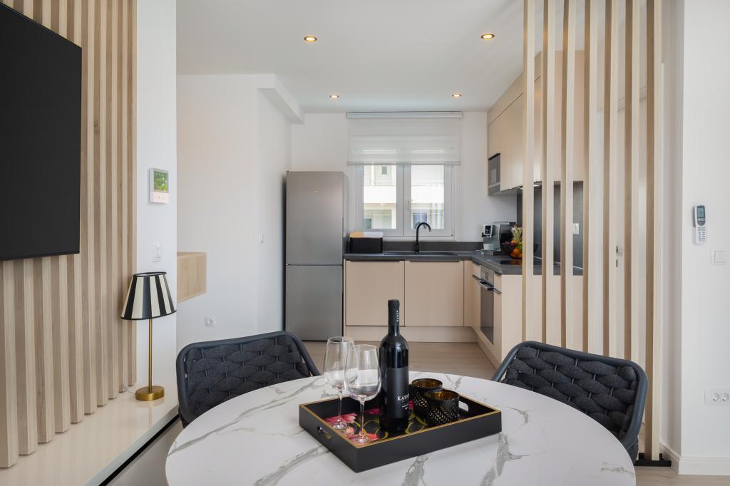 Apartman su opremljeni vrhunskim namještajem i uređajima. Apartman u prizemlju ima elektroničku tendu i dodatni vanjski tuš.