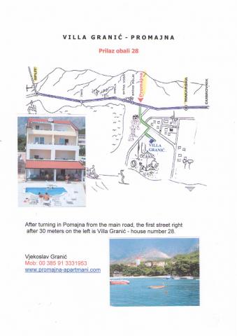 Vila Granić smještena je u turističkom mjestu Promajna u lijepo uređenom okolišu svega 100 metara do pješčane plaže sa borovom šumom te je povoljna za smještaj obitelji sa djecom. Vila ima vlastiti bazen,veliko dvorište i zatvoreni parking. Svaki apartman ima veliku terasu sa pogledom na more na kojoj je prostrani stol i stolice. U blizini su 6 restorana,trgovine i dječija igrališta. Pored kuće je sportski teren za košarku i mini nogomet čije je korištenje besplatno.