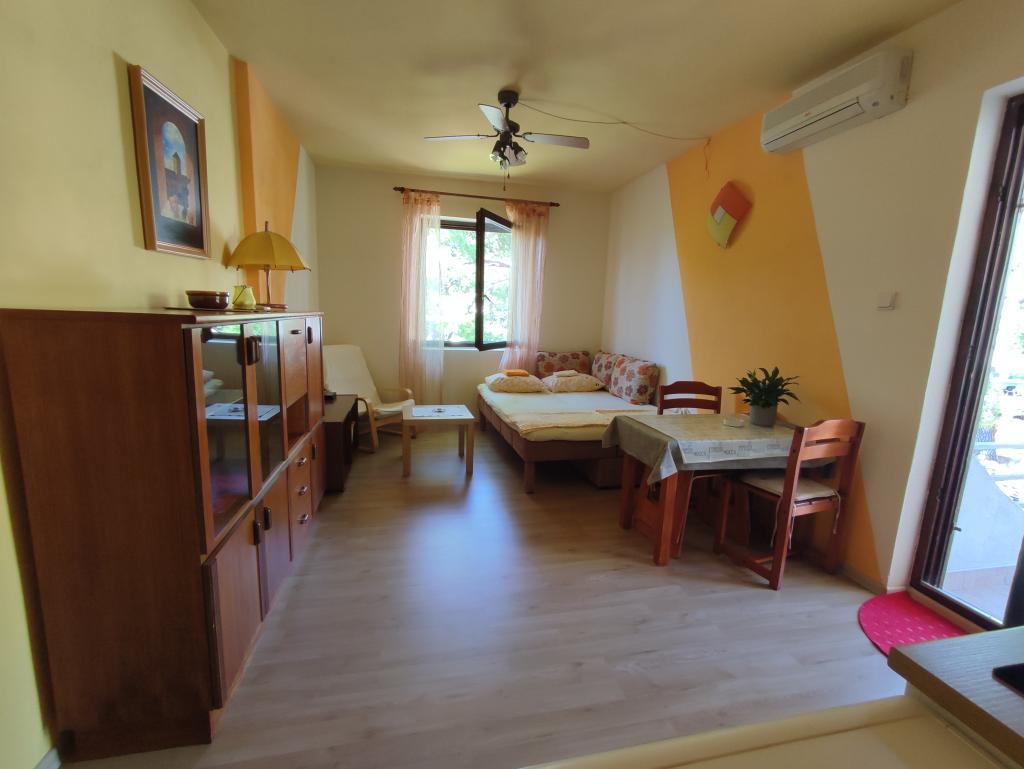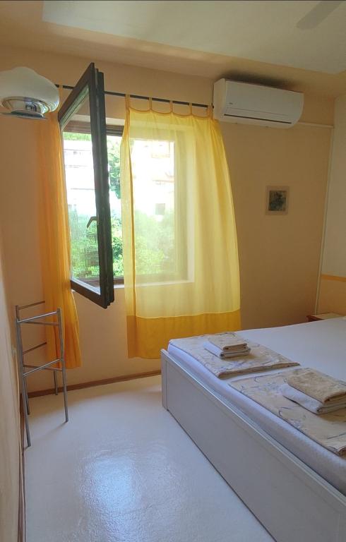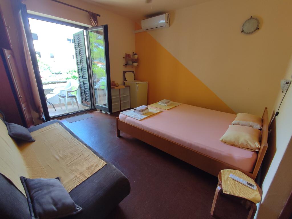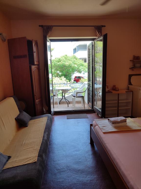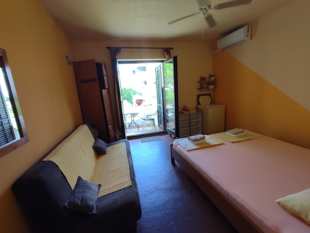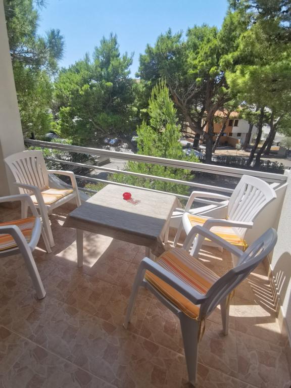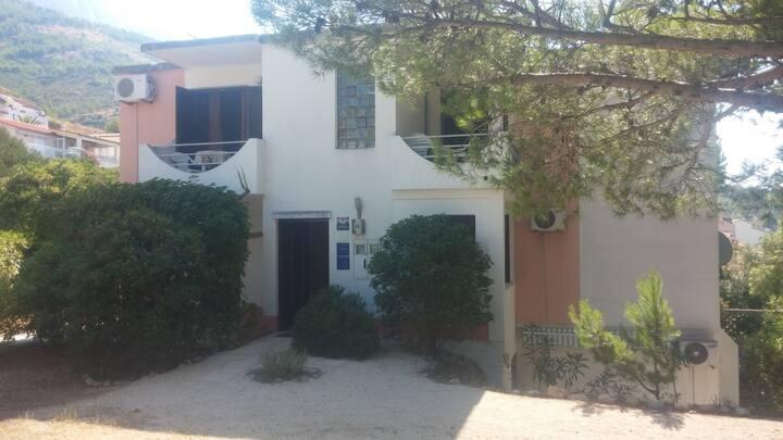 Smjestaj za odmor na prvom katu kuce okruzene velikim dvoristem s borovima. Parking je u sklopu dvorista, centar i plaza s kaficima udaljeni su oko 350m, a prvi restoran i trgovina 150m. U ponudi su 3 smjestajne jedinice: spavaca soba za dvoje, spavaca soba za dvoje s balkonom te dvosobni apartman za dvoje s pomocnim lezajem za trecu odraslu osobu ili dvoje djece. Svaka spavaca soba ima vlastito kupatilo. Obe prostorije apartmana imaju balkon s pogledom na dvoriste. Moguce je iznajmiti cijelu etazu (1. kat) za 6 odraslih i 1-2 djece. Za sve ostale informacije, vlasnik je na raspolaganju od 08:00 do 20:00 (Saša mob: +385 98 493 101).