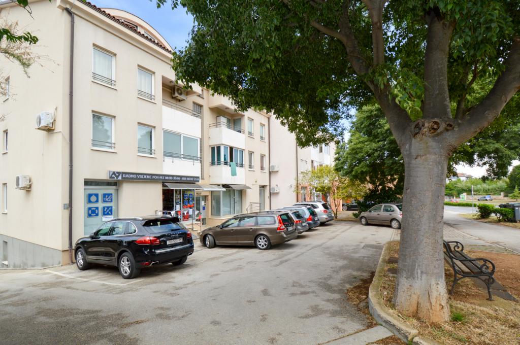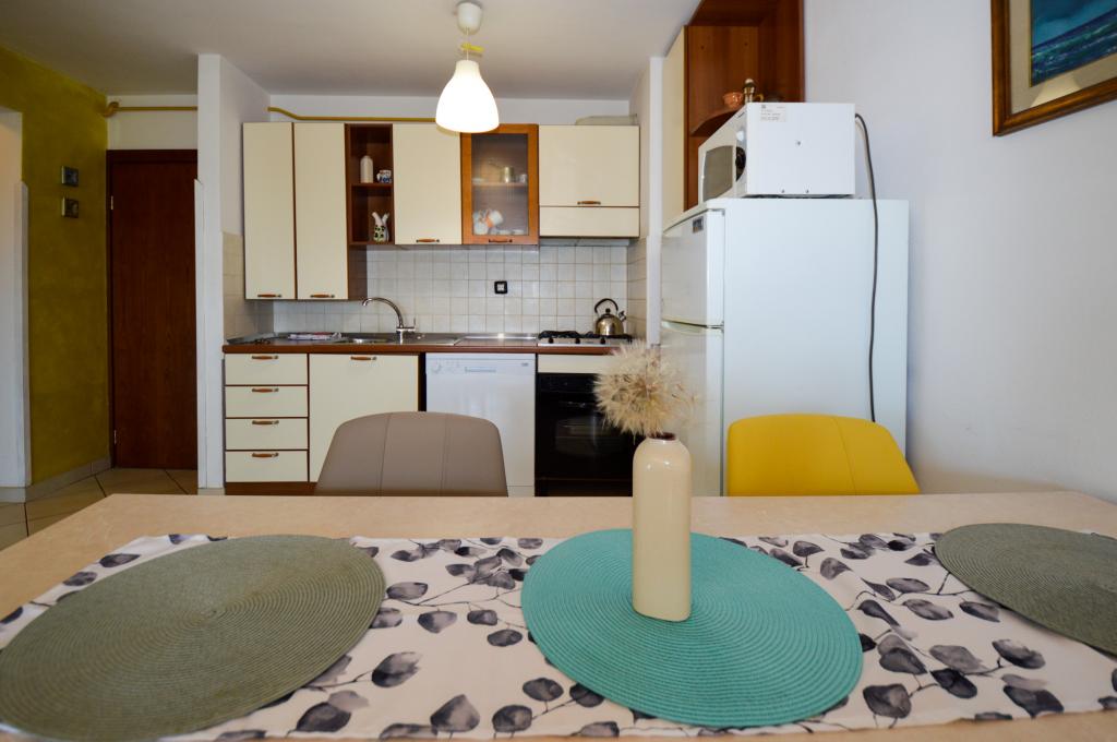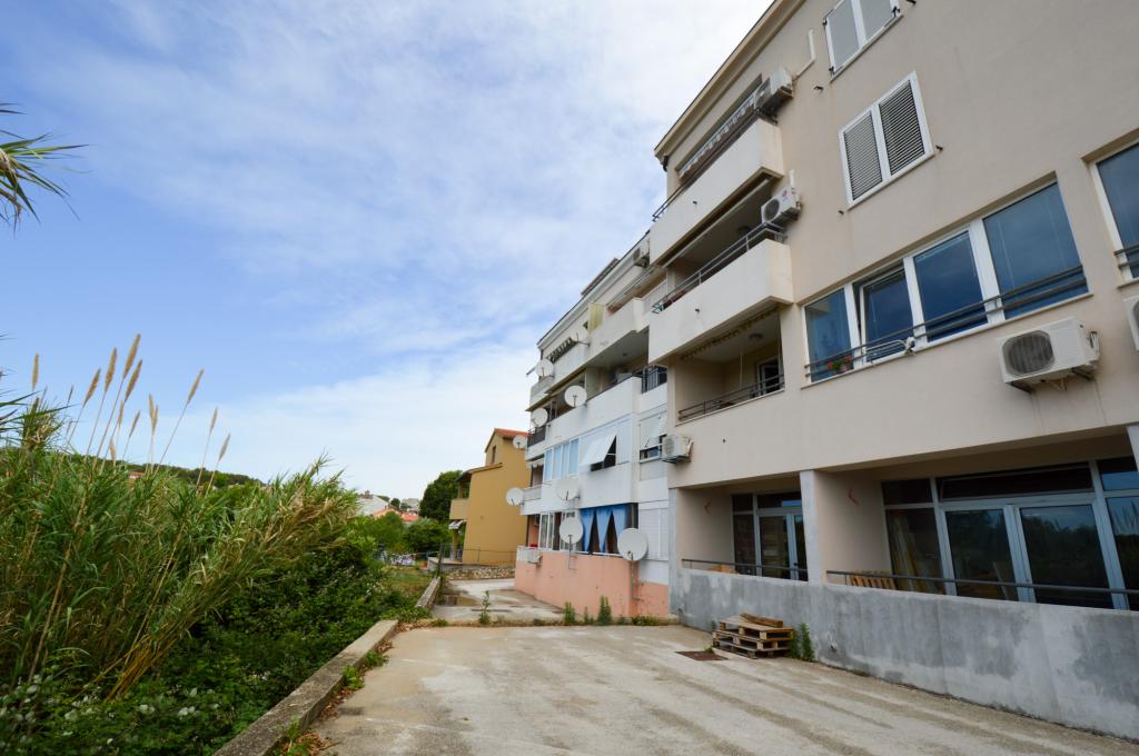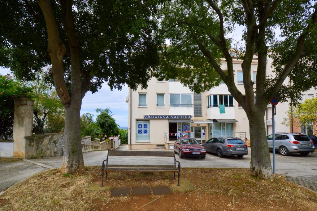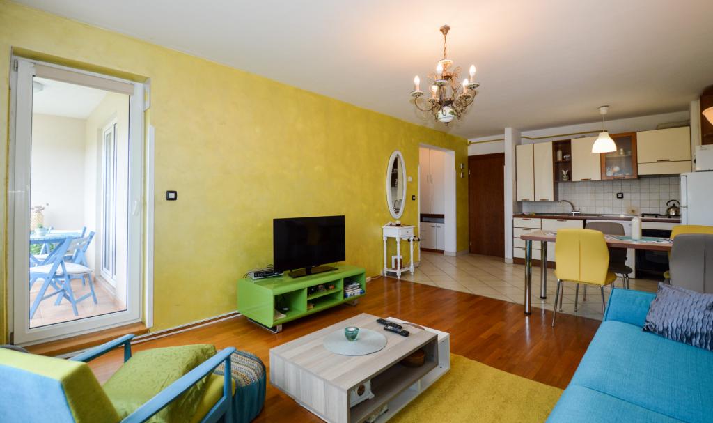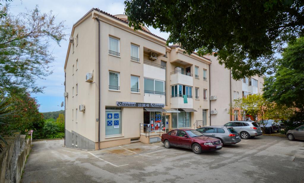 Apartman se nalazi u stambenoj zgradi, na 1. katu. U blizini se nalazi teretana i unutarnji bazen, nogometni stadion i sportski centar, jedriličarski i ronilački klub, market, resorani i kafići. Blizina mora i šume je ono što ovoj lokaciji apartmana daje veliku prednost. Apartman je prilagođen za četiri osobe, komotan je i prozračan. Ima dovoljno veliku terasu (7 m2) sa pogledom na more koja pruža poseban odmor. Ispred apartmana osiguran je parking.