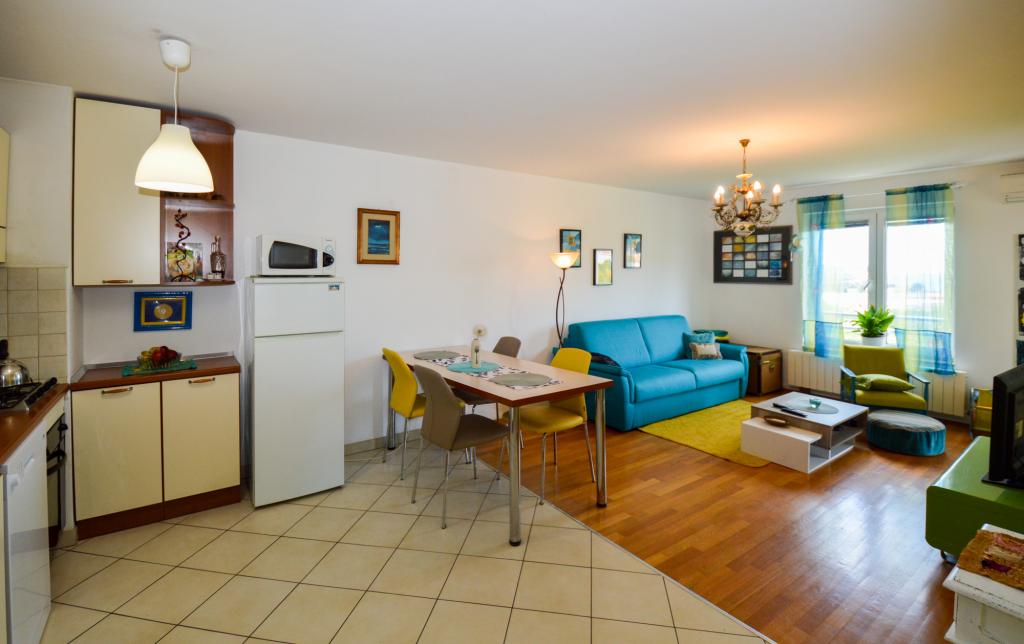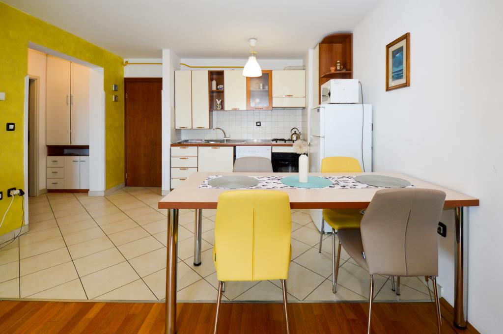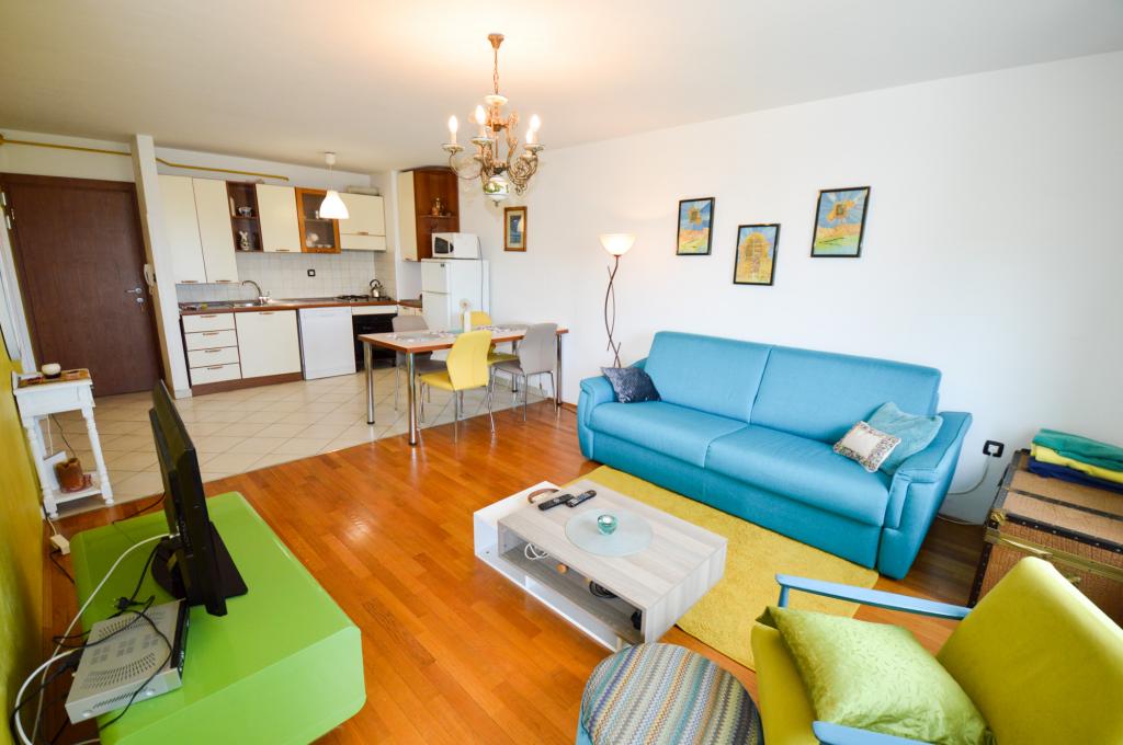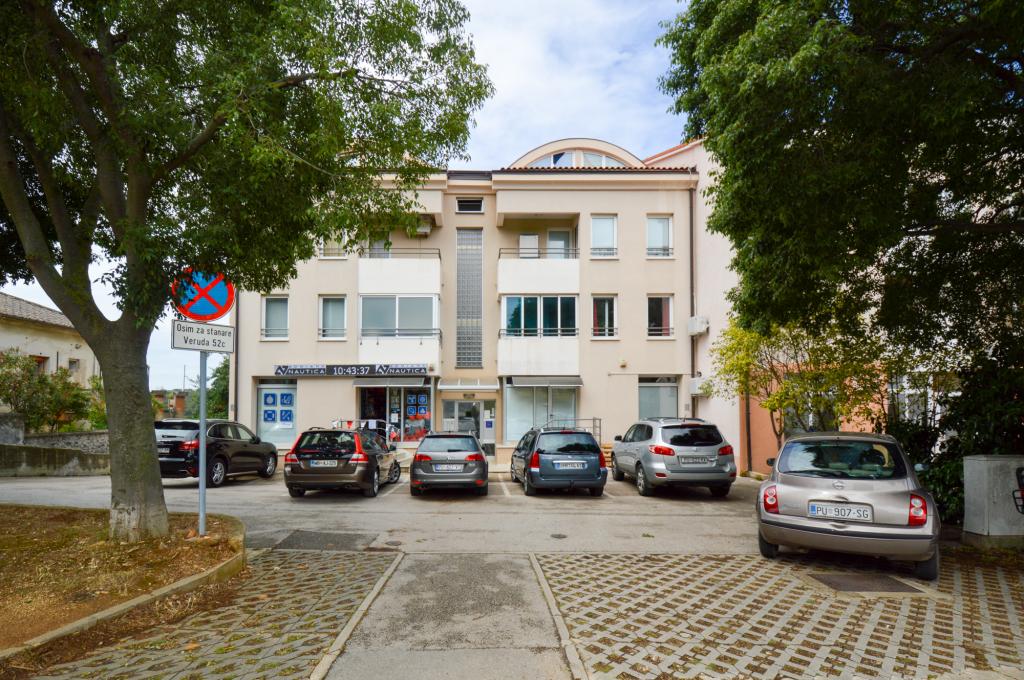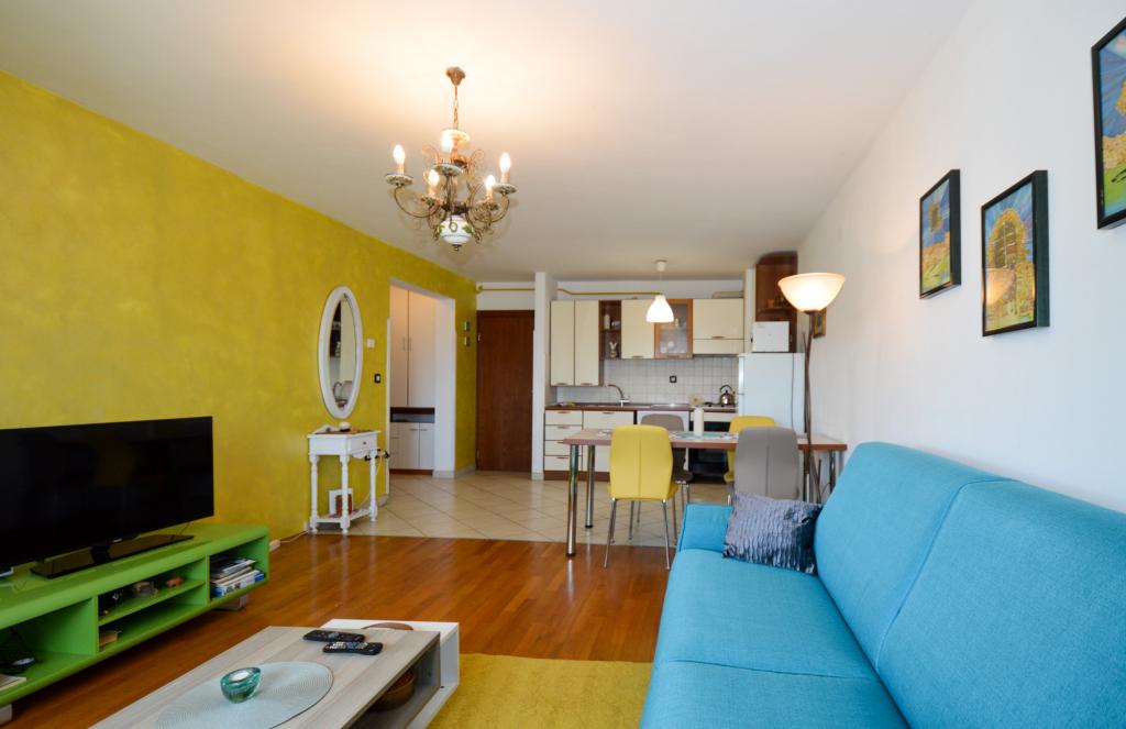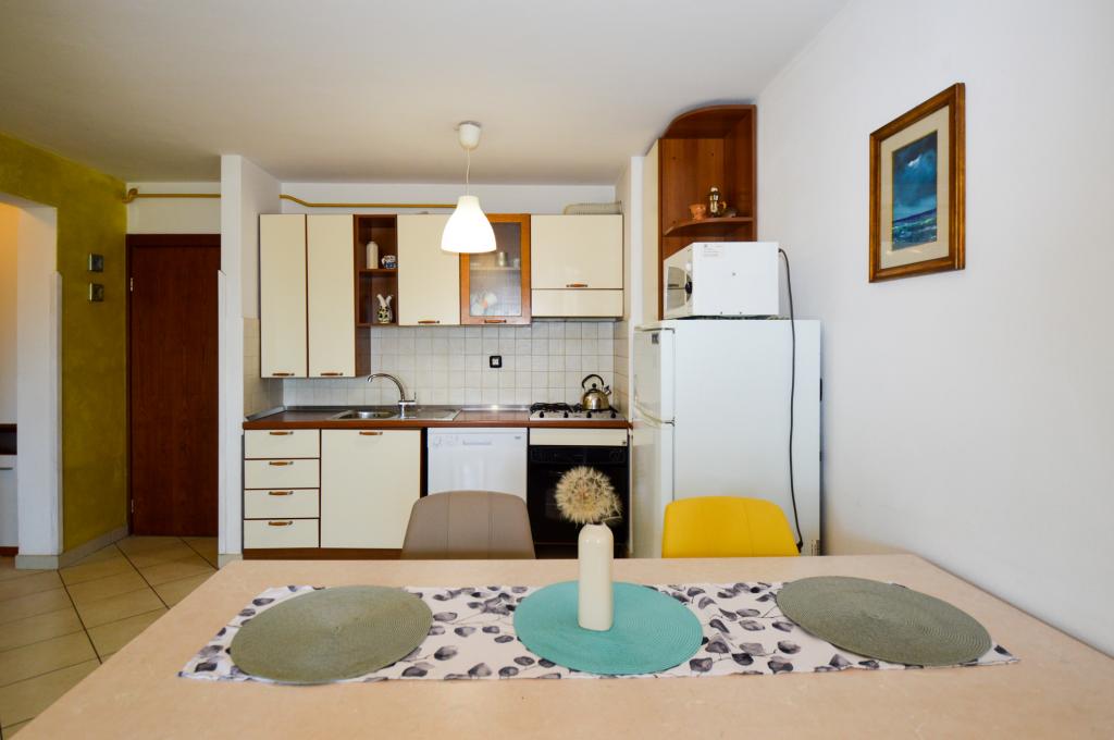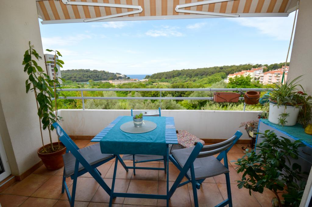 Apartman se nalazi u stambenoj zgradi, na 1. katu. U blizini se nalazi teretana i unutarnji bazen, nogometni stadion i sportski centar, jedriličarski i ronilački klub, market, resorani i kafići. Blizina mora i šume je ono što ovoj lokaciji apartmana daje veliku prednost. Apartman je prilagođen za četiri osobe, komotan je i prozračan. Ima dovoljno veliku terasu (7 m2) sa pogledom na more koja pruža poseban odmor. Ispred apartmana osiguran je parking.