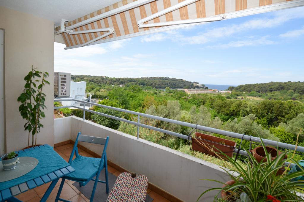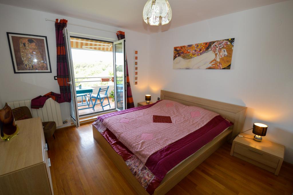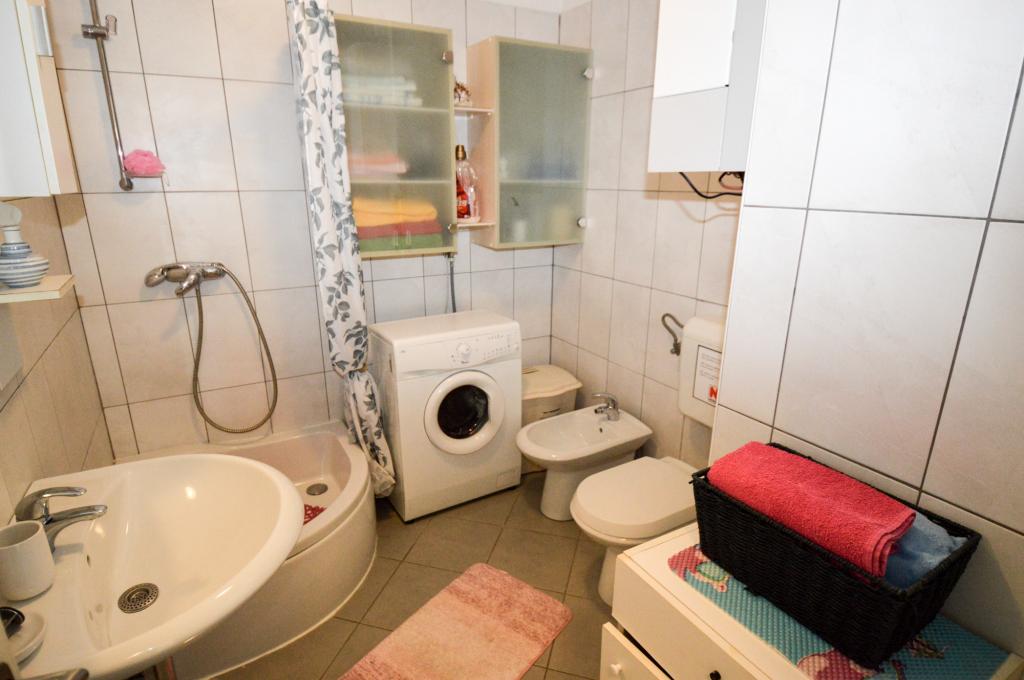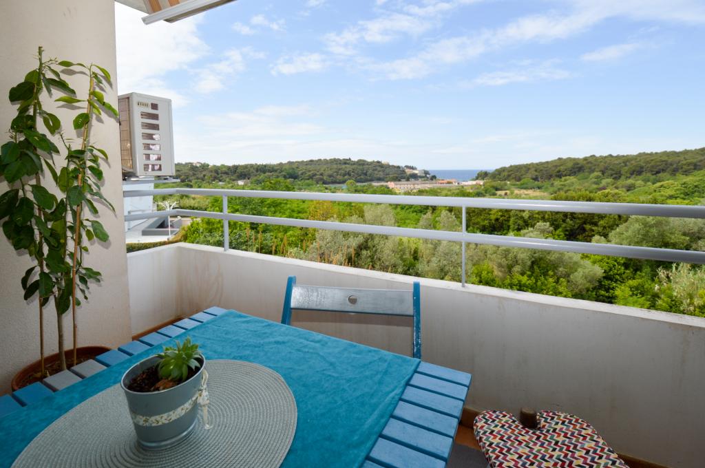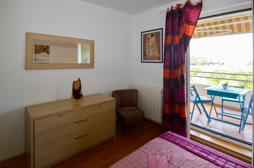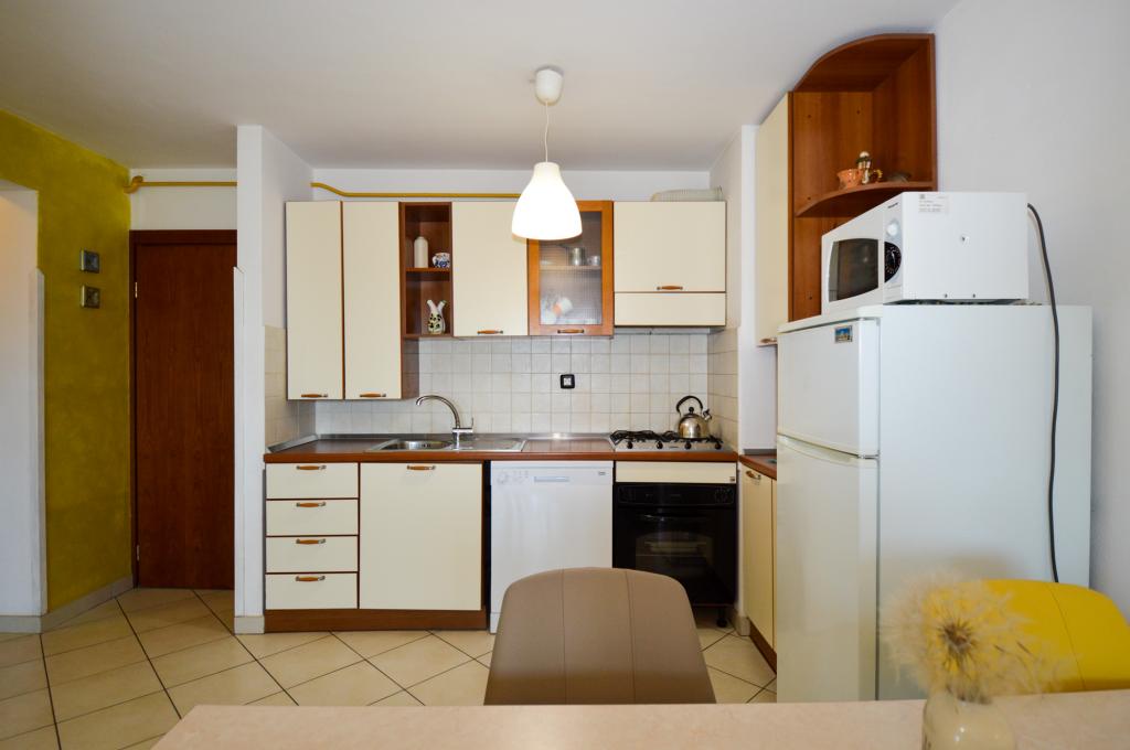 Apartman se nalazi u stambenoj zgradi, na 1. katu. U blizini se nalazi teretana i unutarnji bazen, nogometni stadion i sportski centar, jedriličarski i ronilački klub, market, resorani i kafići. Blizina mora i šume je ono što ovoj lokaciji apartmana daje veliku prednost. Apartman je prilagođen za četiri osobe, komotan je i prozračan. Ima dovoljno veliku terasu (7 m2) sa pogledom na more koja pruža poseban odmor. Ispred apartmana osiguran je parking.