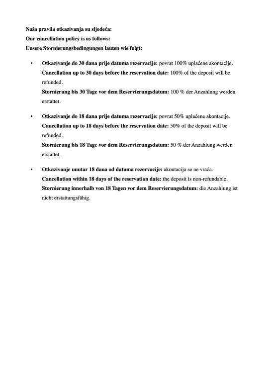 Turistička pristojba je uključena u cijenu. Šaljemo pismenu potvrdu rezervacije (voucher)Otkazivanje 30 dana prije dana rezervacije - vraća se 100% iznosa akontacije. Otkazivanje 18 dana prije rezervacije - vraća se 50% iznosa akontacije. Nakon toga nema povrata akontacije.