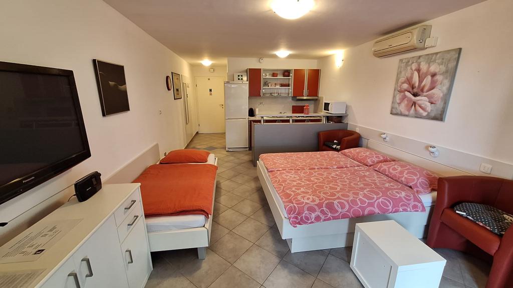 Smještaj je vrlo lijep i čist sa svom opremom.Idealan za malu obitelj, a dopada nam se da je šetnica sve uz plažu, a tamo se i nalaze restorani,slastičarne, igrališta i animatori za djecu,Mjesto super za obitelj s djecom, a k tome ne moraš cijeli odmor auto voziti.
