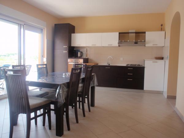 Novosagrađen apartman sa tri sobe, svaka ima kupaonicu i terasu, kuhinja, blagovaonica, dnevni boravak sa velikom terasom s pogledom na more. Smješten je prvi red do mora, 10 m od plaže, blizina trgovine, restorana.