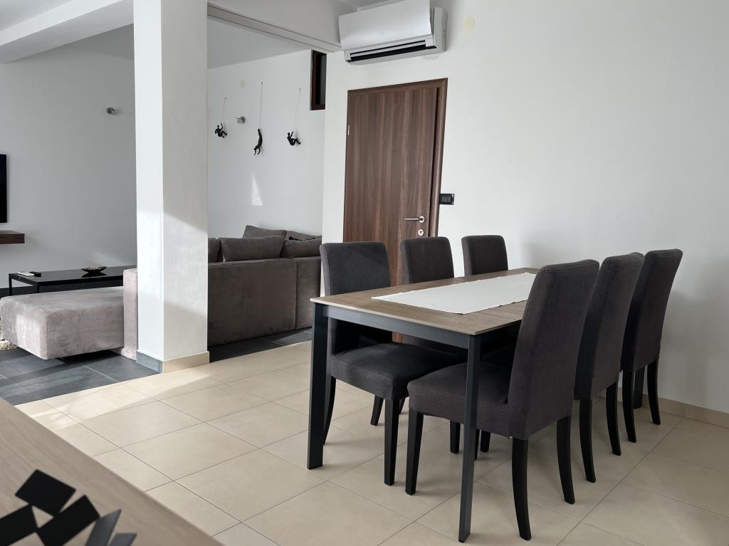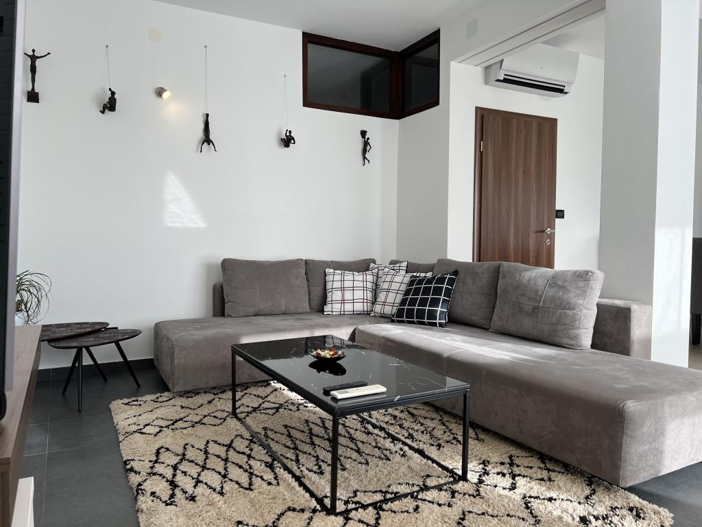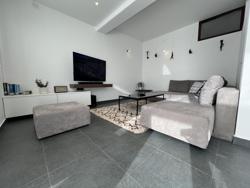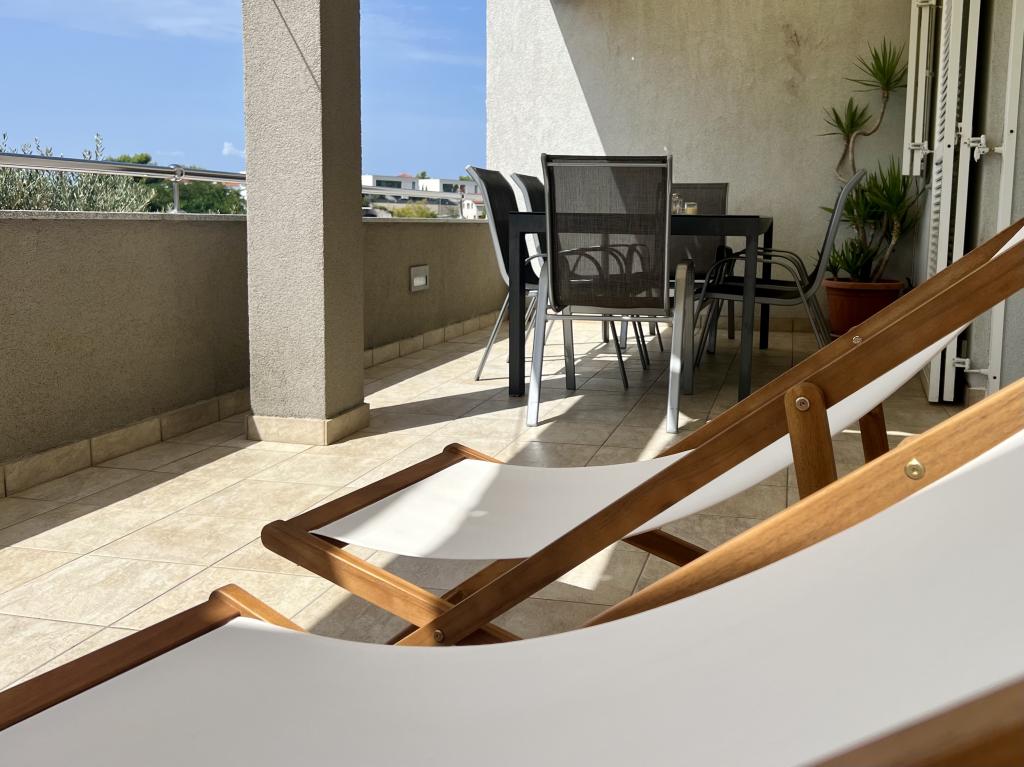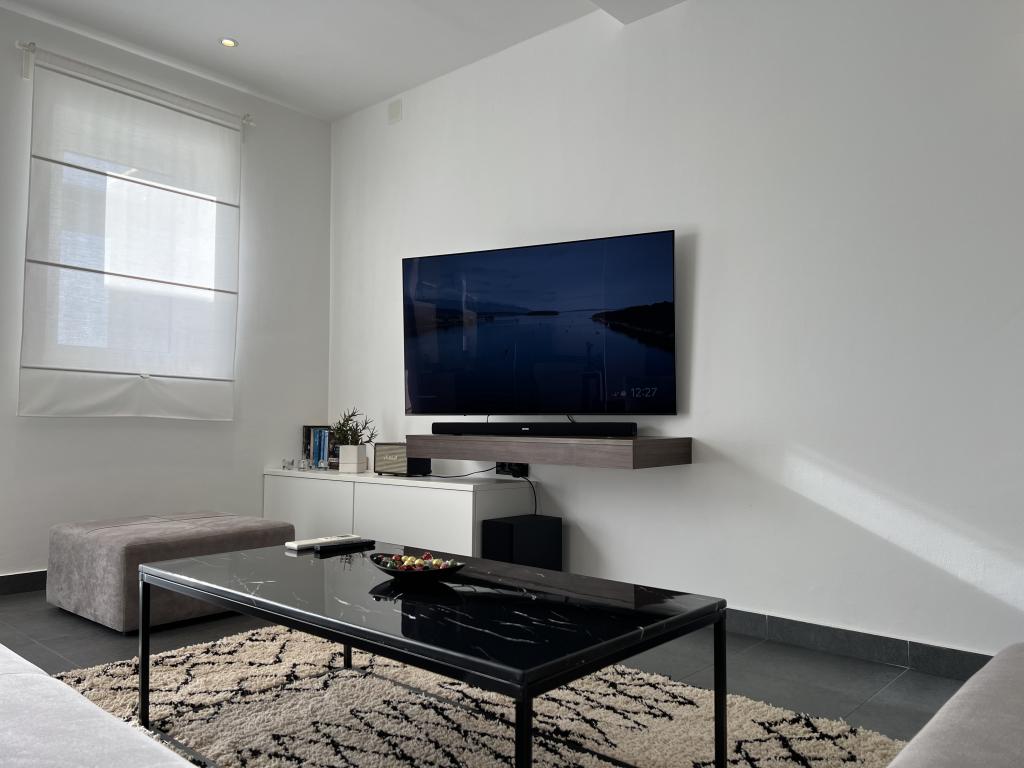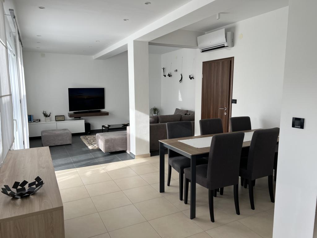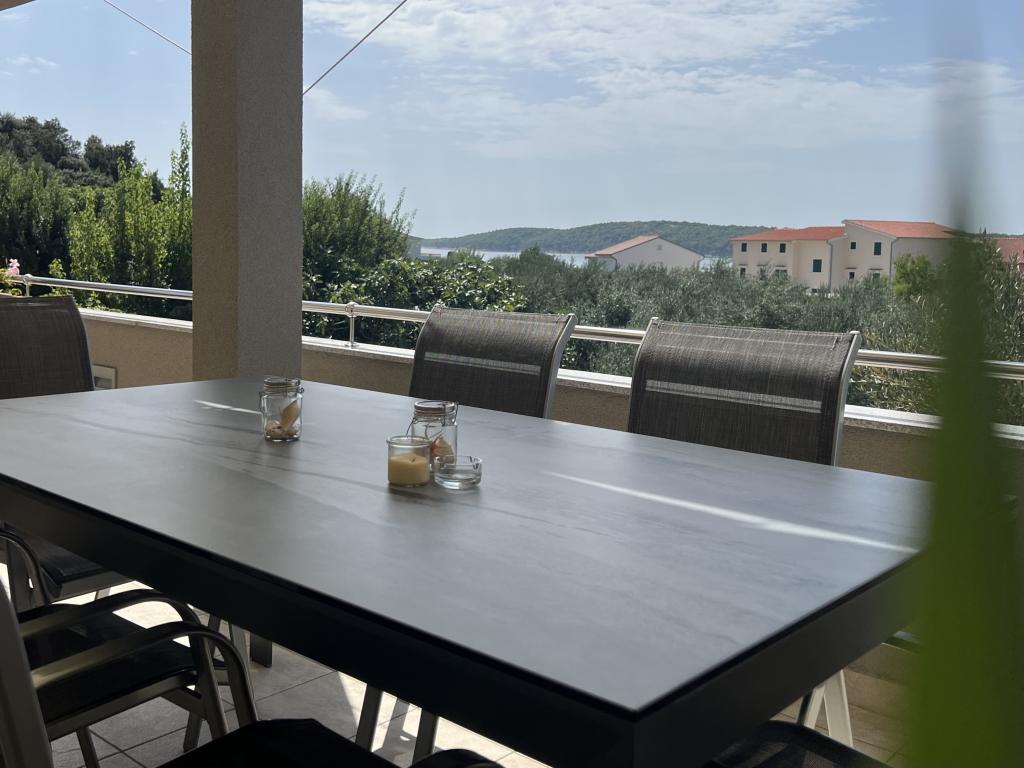 Moderan prostrani obiteljski apartman. Potpuno namješten prema visokim standardima. S kuhinjom blagovaonicom, dnevnim boravkom, TV, WiFi, te vanjskim prostorom za sjedenje s pogledom na maslinik i more. Idealno za doručak ili uživanje u večeri.