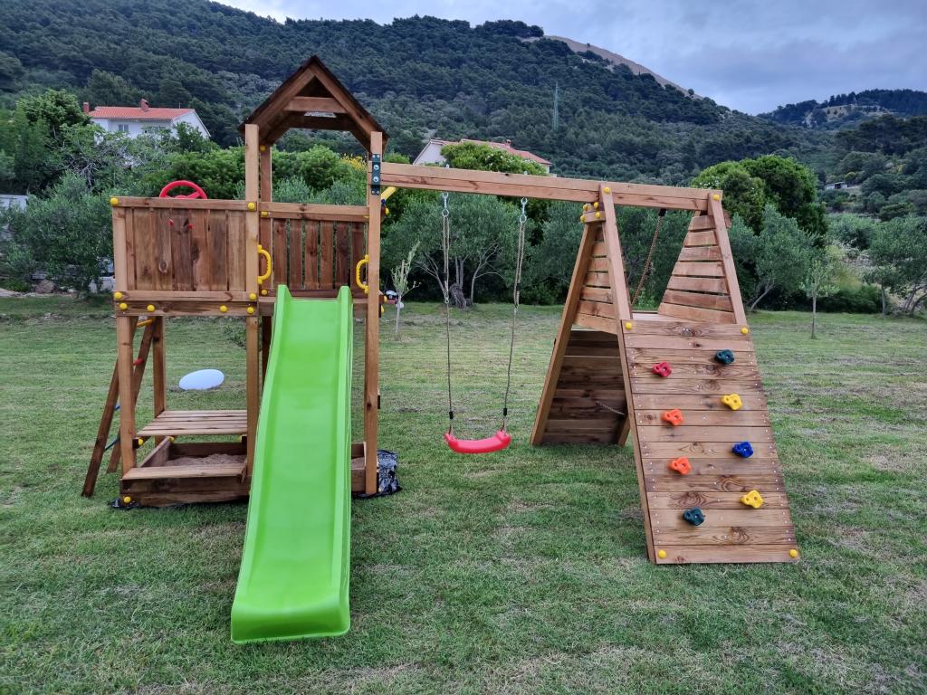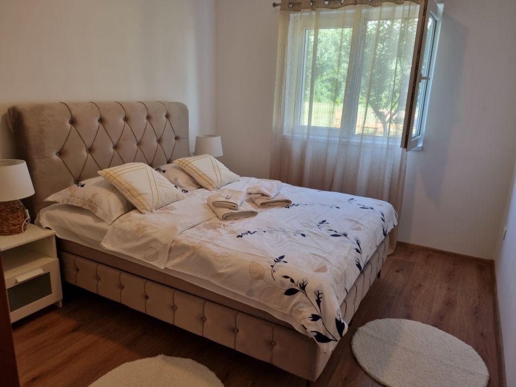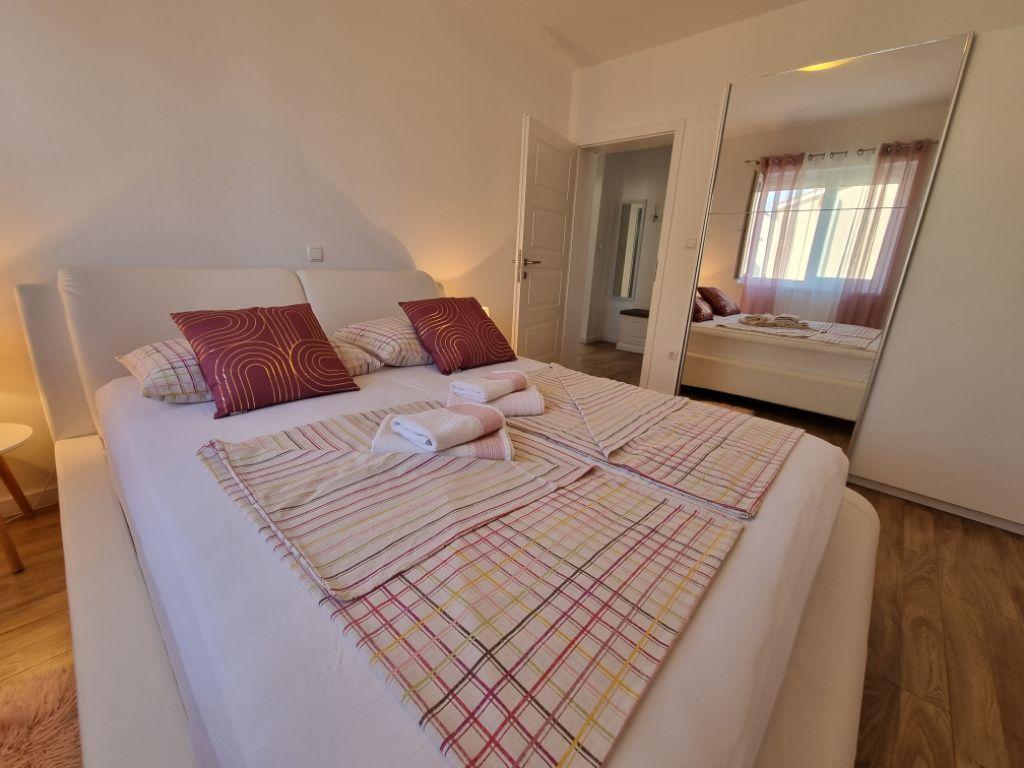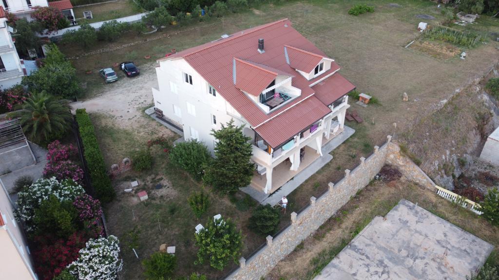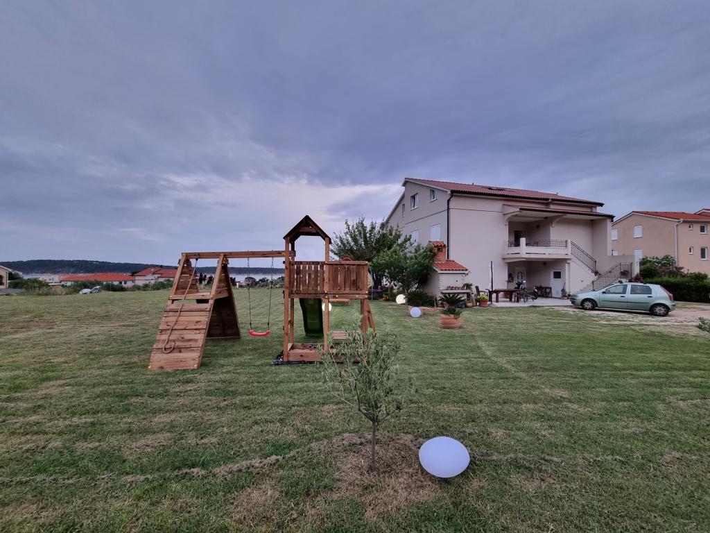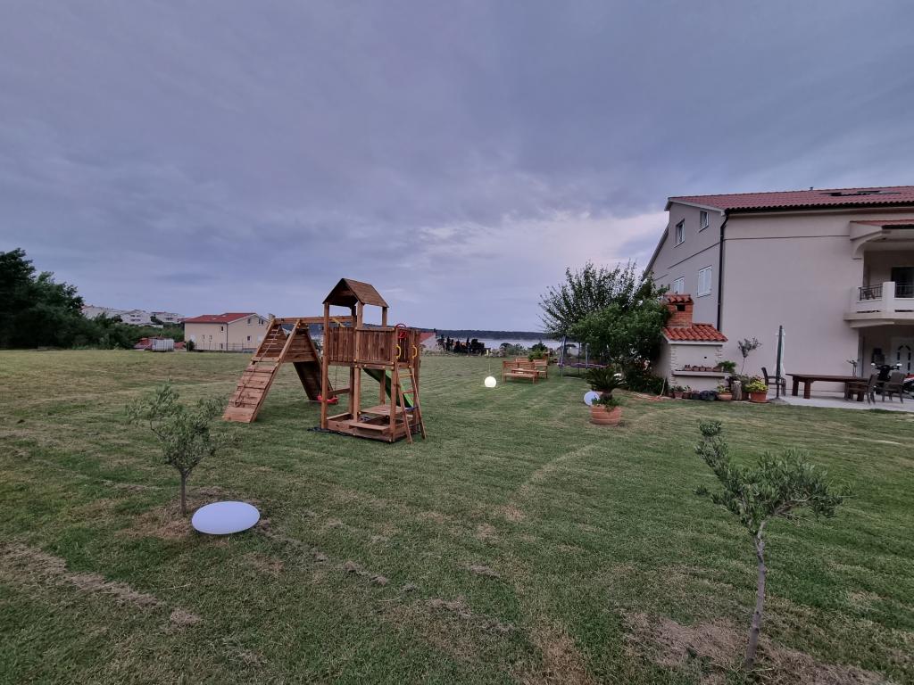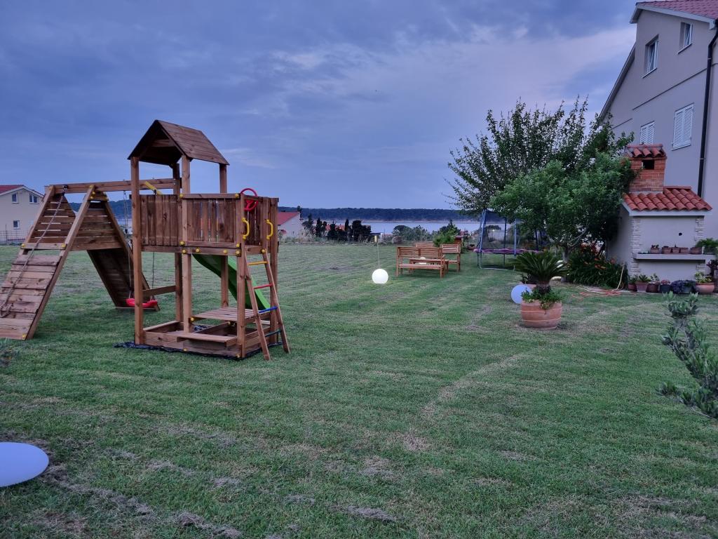 Lijepo uredeni apartmani sa svom opremom za olaksavanje vaseg odmora. Kuca je okruzena velikim vrtom u kojem su djecje igraliste i grill. Svaki apartman ima zasebnu terasu s pogledom na more. Kuca je udaljena 400 m od mora i najblize plaže.