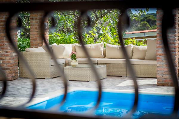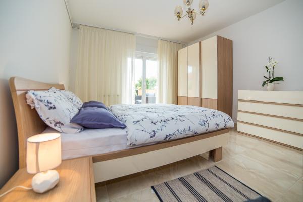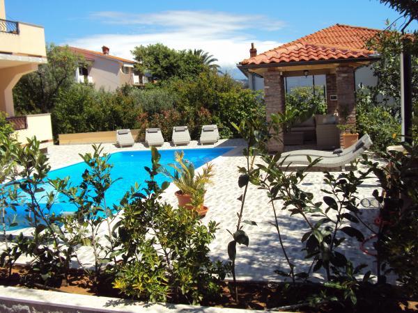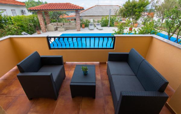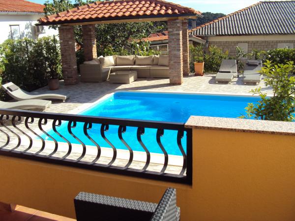 Moderno preuređena kuća u mirnom predjelu, 10-15 min udaljenost od mora i centra, bazen sa sjenicom, vanjski kamin sa terasom, te ugodno uređena konoba, veliki vrt. Apartman komforan, moderno uređen, poseban ulaz, veliki balkon. Veoma ugodna atmosfera.