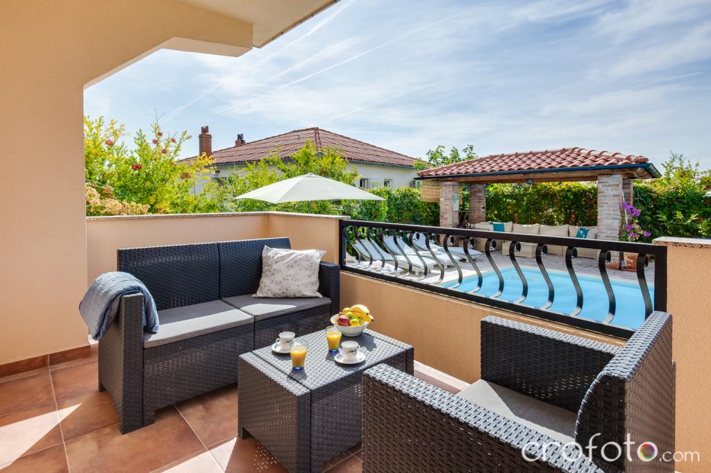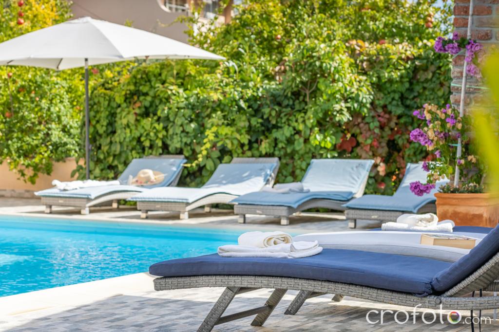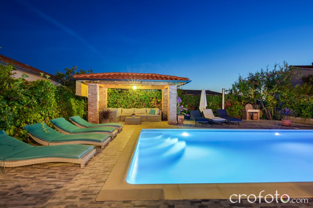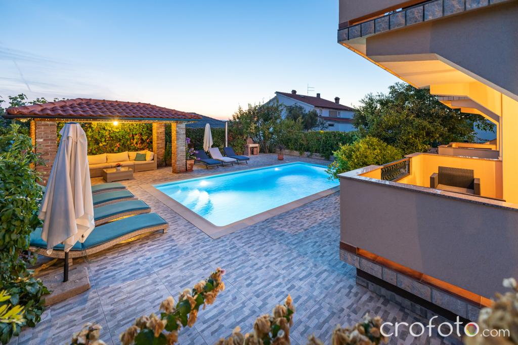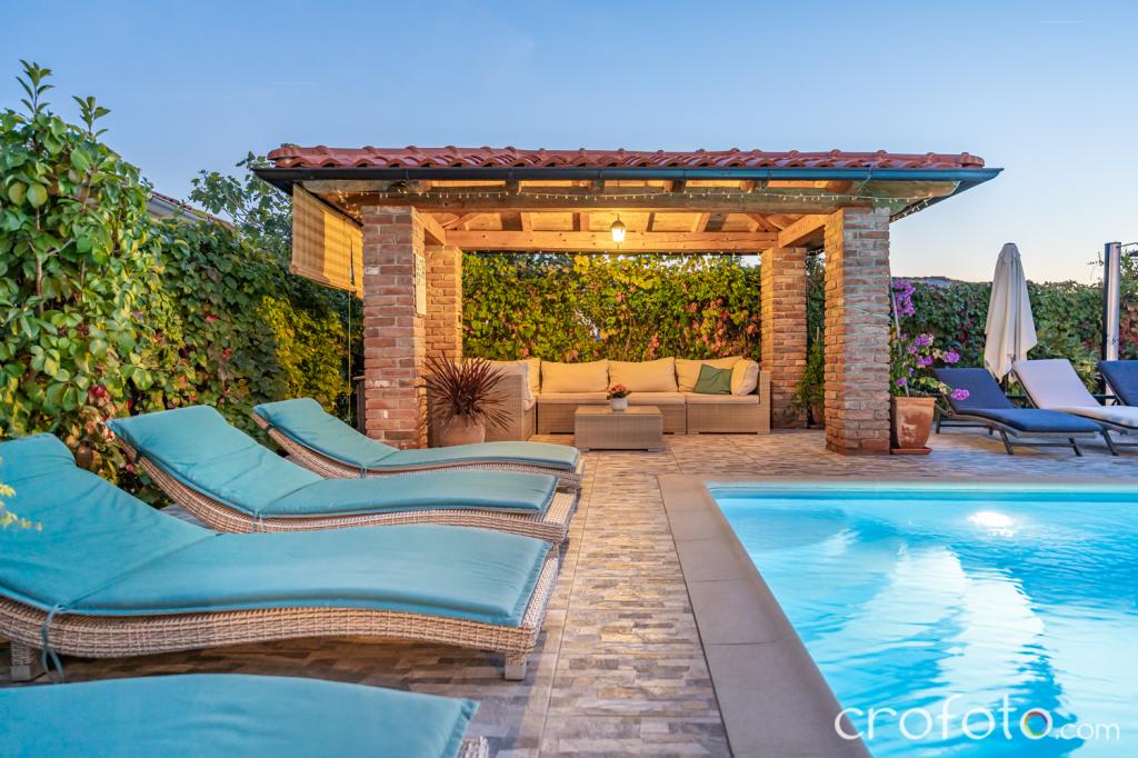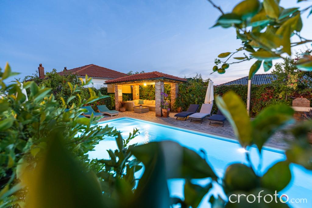 Obavezno piće dobrodošlice. Prekrasan, redovito održavan bazen, okružen raskošnom sjedećom garniturom, udobnim ležaljkama, suncobranima, okružen zelenilom, zen-zona za opuštanje. Veliki stol za druženje ispod sjenice u vrtu sa grilom, to su dodatni aduti ovog smještajnog objekta. Osigurano parkirno mjesto.