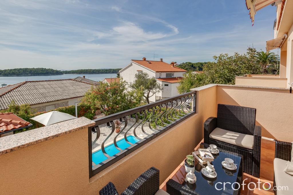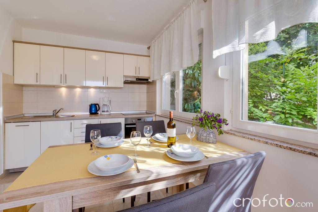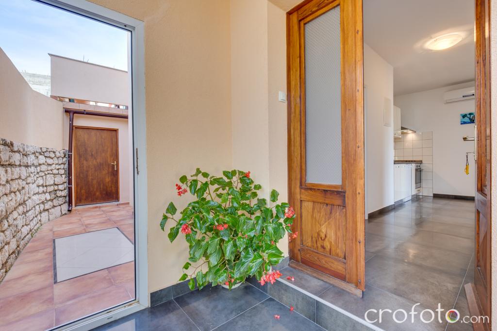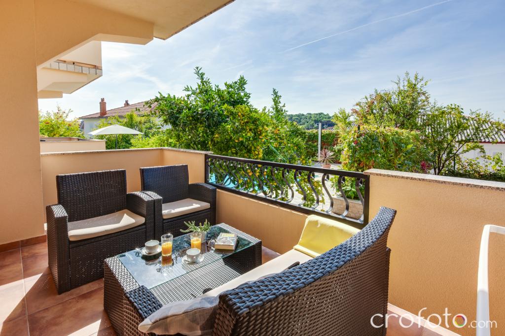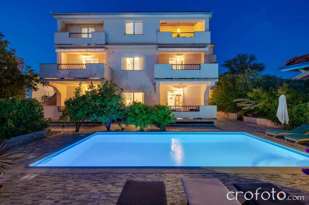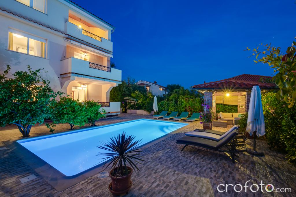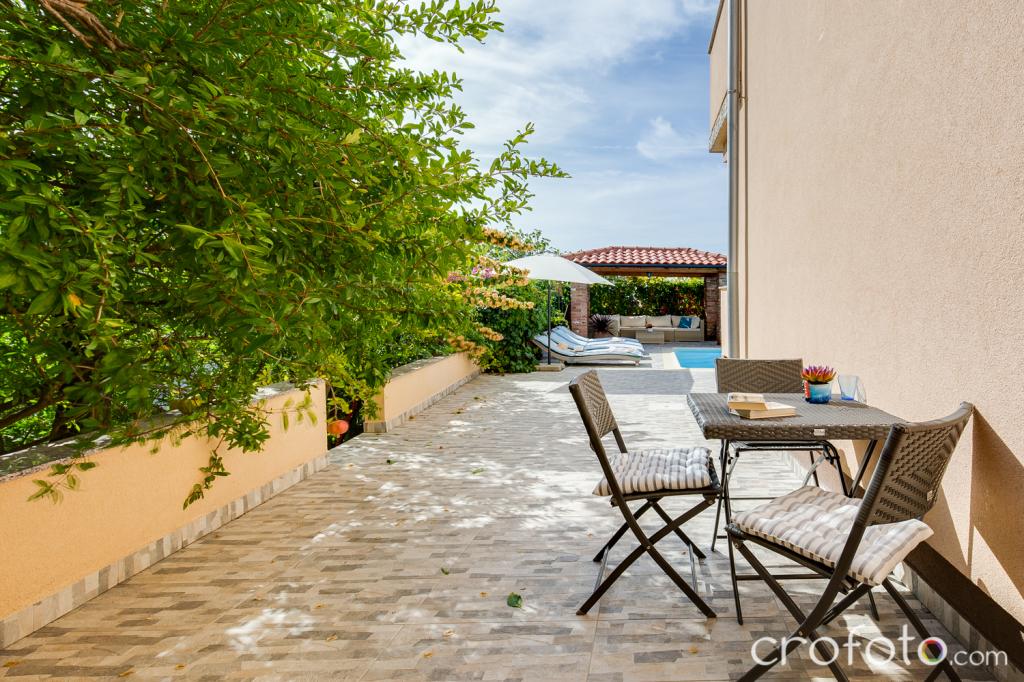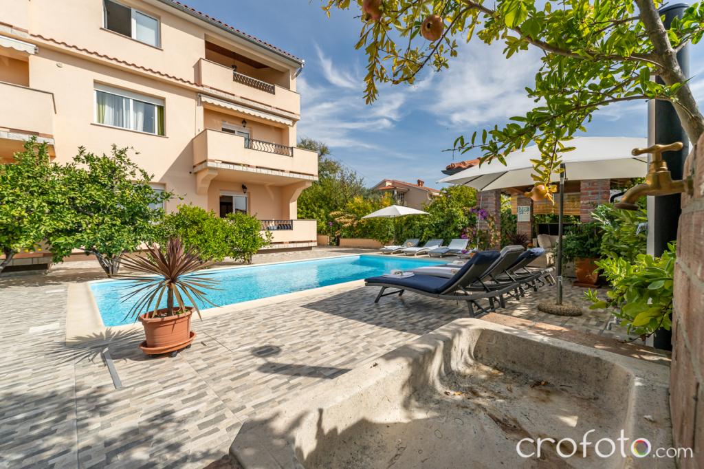 Kuća APARTMANI JURIĆ ima izvrsnu lokaciju, blizina centra i najeminentnijih restorana, blizina mora, blizina parka. Ono što uistinu osvaja, daleko od gužve, na mirnoj lokaciji , sa vlastitim bazenom i vrtom sa odvojenom sjenicom sa kaminom i velikim stolom , koje stavljamo na korištenje našim dragim gostima. Ugodno osmišljen i namješten prostor oko bazena, sa udobnom sjedećom garniturom u hladovini ugodne sjenice, udobne ležaljke, okružen visokim zelenilom. U vrtu masline, mediteransko bilje, ukrasne biljke i cvijeće daju posebni ugođaj. Atmosfera vrlo ugodna, pogodna za miran odmor i opuštanje.