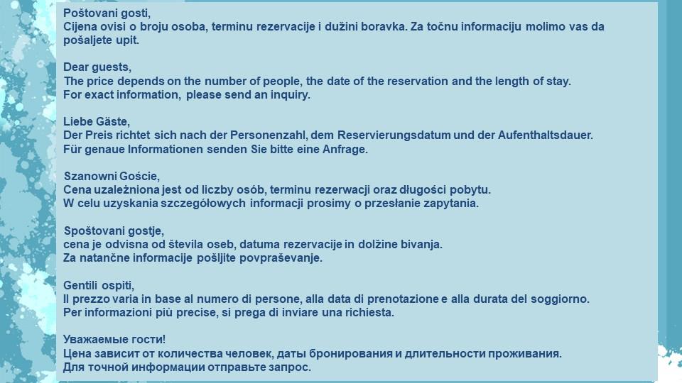 Turistička pristojba nije uključena u cijenu.Akontacija služi kao garancija rezervacije.