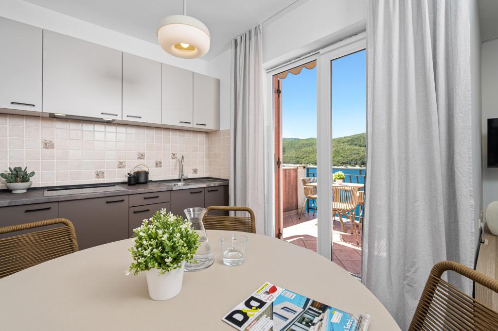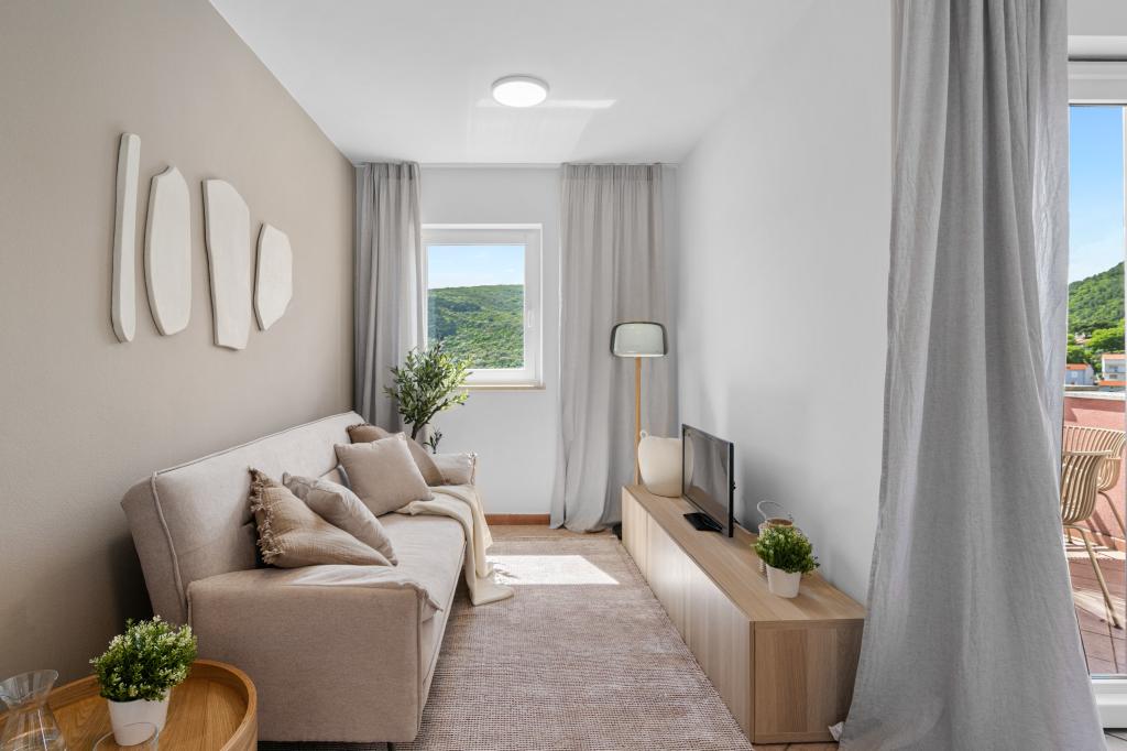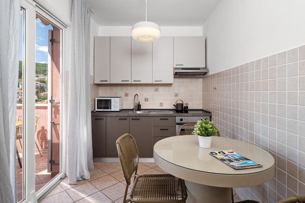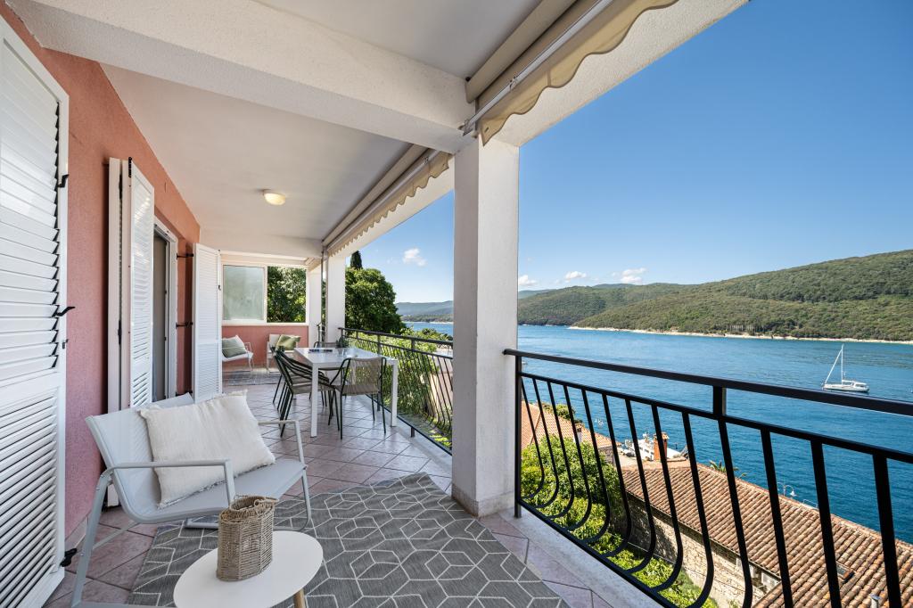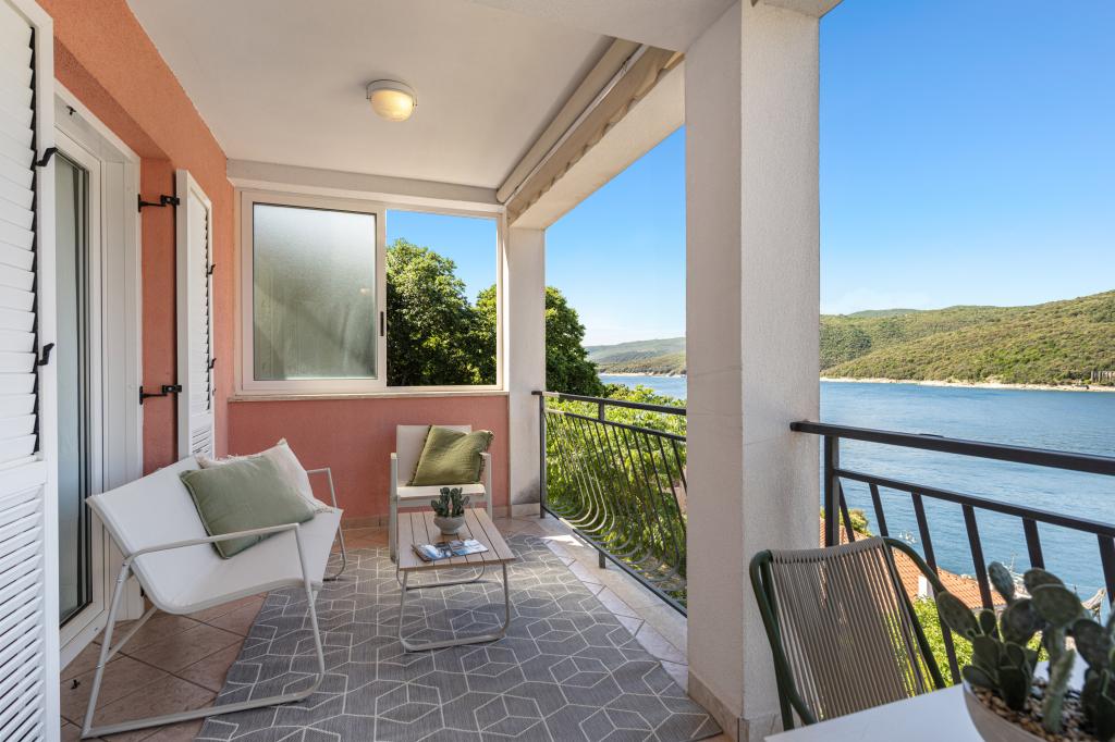 Lijep studio apartman za dvije osobe, standardno opremljen koji ima sve što trebate. Velika terasa, s prekrasnim pogledom na zaljev. Apartman ne preporučujem za osobe koje imaju problem s nogama, 110 stepenica od mora do apartmana, ali vrijedno je toga pogleda. Plaža cca 10 minuta. Rabac prekrasan. Nadam se da ćemo se vratiti.