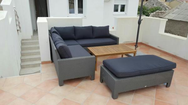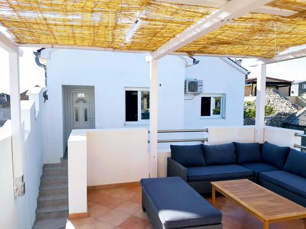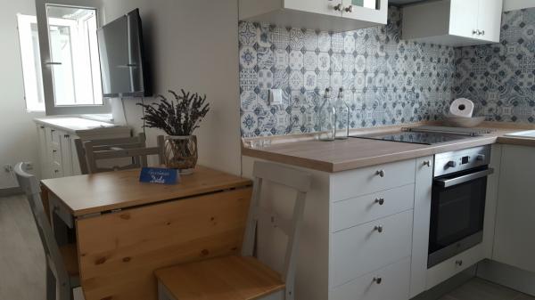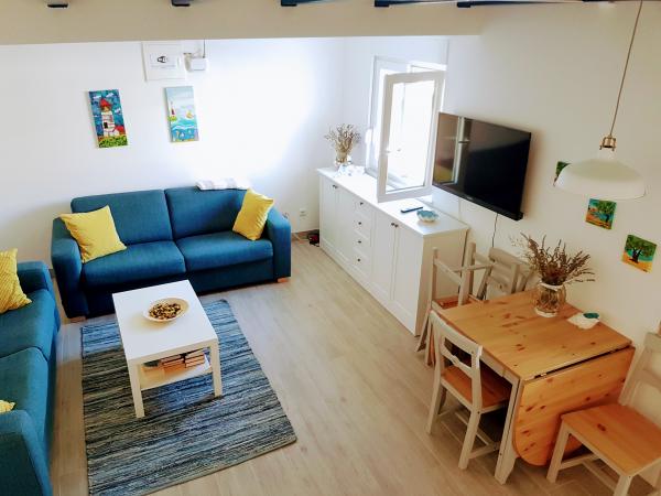 S puno ugrađene ljubavi, Apartman DIDA (2 2)je novoizgrađeni apartman u 2016. godini i prestavlja jedan intiman kutak za odmor u kojem će se vaša obitelj osjećati kao u vlastitom domu. Nalazi se na prvom katu obiteljske kuće i dvoetažnog je karaktera. Sastoji se od donje etaže sa dnevnim boravkom, kuhinjom i kupatilom i gornje galerije u potkrovlju u kojoj se nalazi bračni krevet 160 x 210 cm sa elementima za odlaganje odjeće. Iz gornje etaže se izlazi na balkon od 4 m2 na kojem je ugodna sjedeća garnitura. Kuhinja je u potpunosti namještena električnim aparatima za kuhanje sa kompletnim setom posuđa za kuhanje i priborom za objedovanje. U dnevnom boravku se nalaze dva trosjeda od kojih se jedan razvlači i služi za spavanje dviju osoba. Apartman također ima pomoćni krevetac za djecu kao i stolicu za hranjenje beba. Apartman je u potpunosti klimatiziran, internet je dostupan putem WI-FI, LED TV 102 cm sa satelitskim i domaćim kanalima. Uz apartman je velika vanjska terasa od 20 m2.