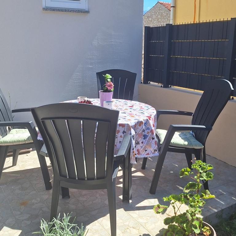 Kompletno uređena kuća od 45 m2 nalazi se u Ražancu, malom mjestu sa pogledom na Velebit, Apartman je ustvari zasebna kuća u kojoj nema vlasnika niti drugih apartmana. Kuća se nalazi par minuta hoda do samog centra Ražanca, restorana, ljekarne, trgovina, pošte., ribarnice, tržnice. Do prve trgovine minut hoda,, supermarket Tommy je udaljen 10 tak minuta hoda. U sklopu kuće se nalazi parking za jedan manji automobil. ( tipa ford cmax, apel astra karavan) Kuća se sastoji od kuhinje, kupaonice sa wc i tuš kabinom te dvije spavaće sobe. Ima klima uređaj, perilicu suđa, perilicu za rublje, aparat za kavu, kuhalo za vodu, pećnicu, hladnjak sa manjim zamrzivačem, fen ,sušilo za robu, peglu, dasku za peglanje, ručnike, posuđe za 6 osoba. Obje spavaće sobe imaju Tv uređaje sa max tv prijemnikom. Isto tako dostupan je besplatan Wi-Fi. Ispred kuće je terasa sa stolom i sjedalicama te suncobranom.