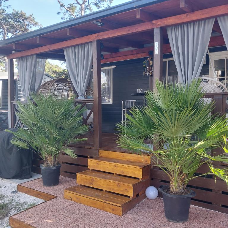 Mobilna kucica -Barbara 603 nalazi se u malom ribarskom mjestu Razanc, u kampu Planik na 700m od prekrasne plaze s pogledom na Velebit.U blizini je grad Zadar(17km),Pag (30km)i nacionalni park Paklenica( 35km)Kućica je potpuno opremljena i spremna za goste ima dvije sobe( 1 spavaca i 1 soba sa tri kreveta)Dnevni boravak sa kuhinjom i kauc na razvlacenje(2 osobe) zasebno kupatilo sa tus kabinom i wc.Kuca ima klimu, 2 led sat tv,-a,aparat za led i hladnu vodu,kafe aparat,pec na plin,frizider,mikrovalnu,toster, peglu,fen za kosu,komplet posuđe za 6 osoba,čista posteljina i rucnici.Kuca ima veliku terasu cjelom duzinom kuce(24m2).Na terasi se nalazi:stol sa 6 stolica,ljuljacka,,veliki i moderni grill na plin koji se moze koristiti na terasi ili pored A poseban doživljaj na terasi je mali mini bar što je svakako novo u ponudi..Kraj same terase se nalazi jedno parkirno mjesto.U blizini kampa je supermarket Tommy(100m)centar mjesta 400m,ljekarna,pošta,ugostiteljski objekti,ribarnica itd.