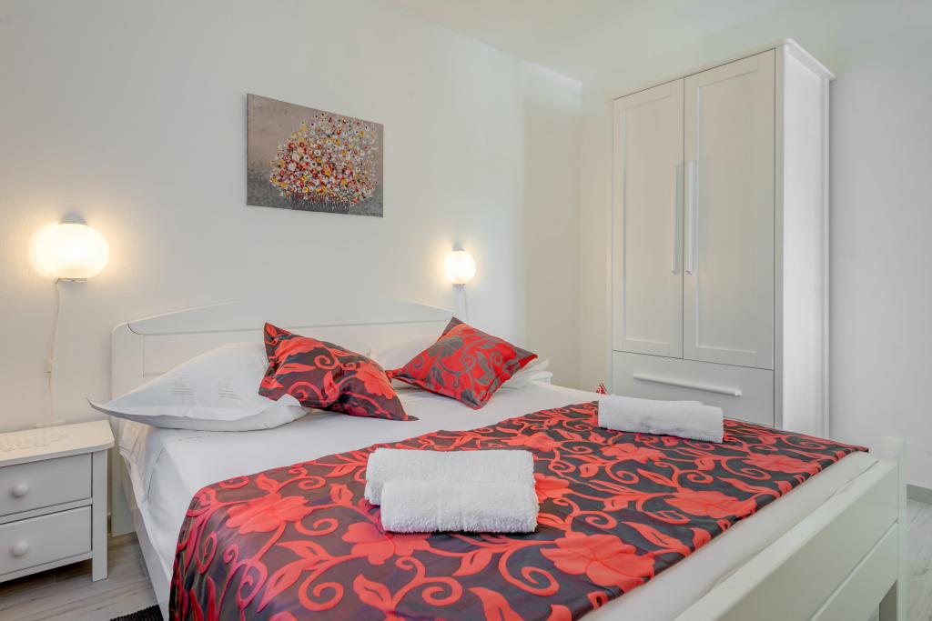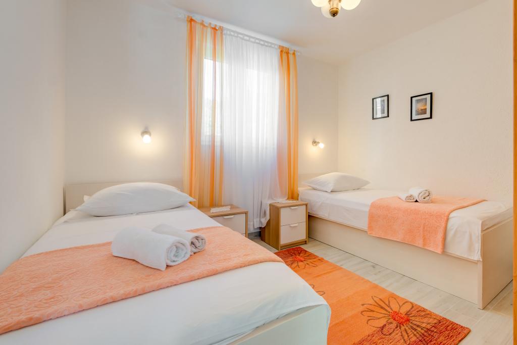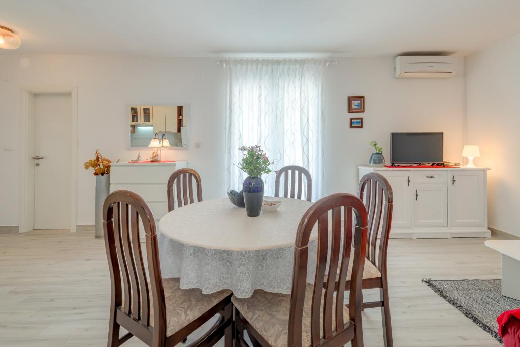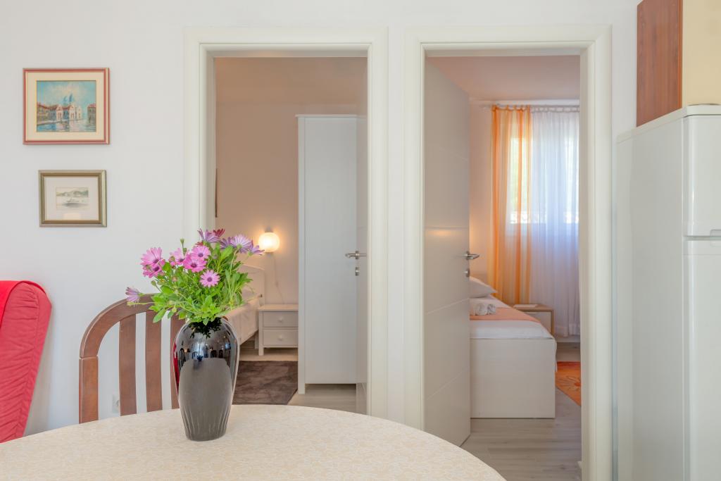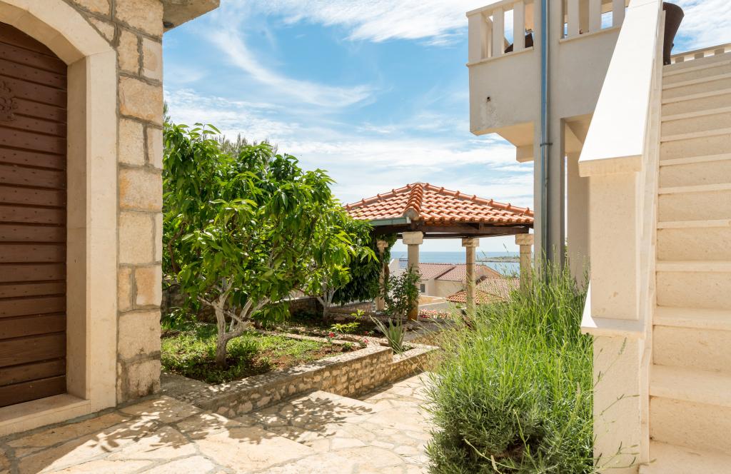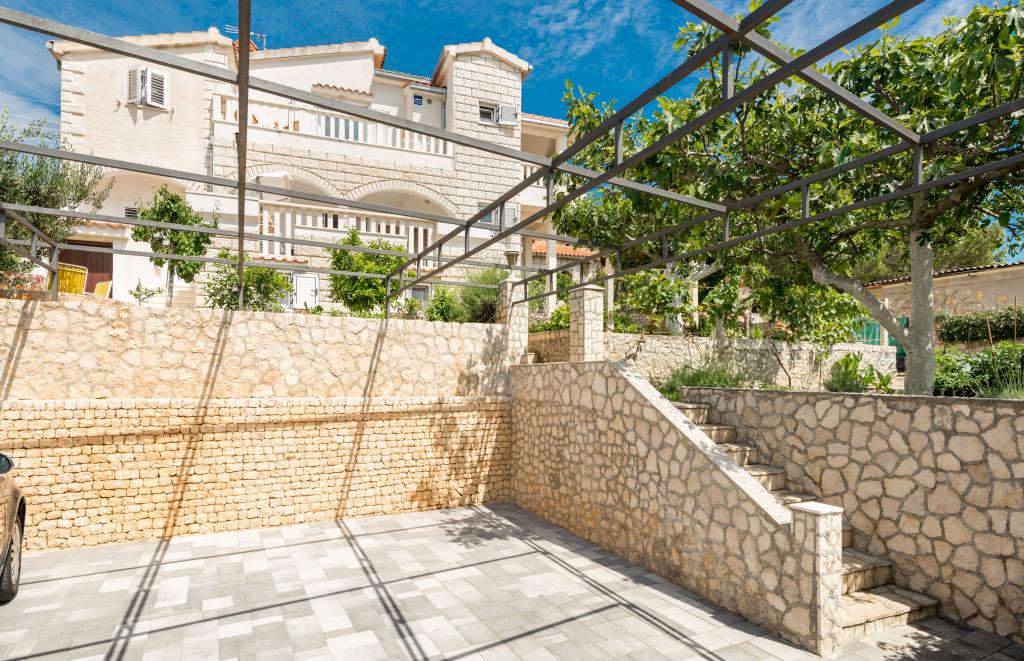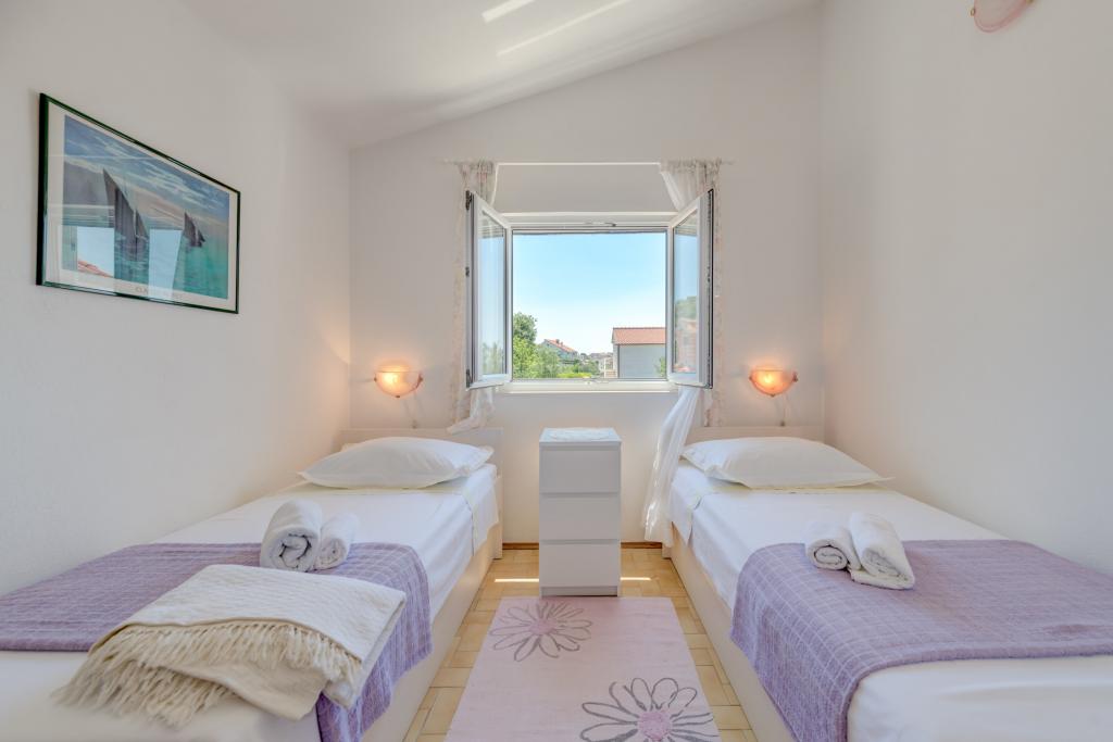 Prekrasna kuća na mirnom mjestu svega 70 metara udaljena od mora. Svega 2 apartmana u objektu omogučiti će intimnu i mrinu atmosferu idealnu za odmor. Apartmani su prostrani s dvije sobe, kuhinjom, dnevnim boravkom, toaletom te prostranim balkonima. Na raspolaganju je okućnica sa sjenicom, rustikalnom grill kućicom, osiguranim parking mjestom. Vrt je prepun zelanila idealnim za odmor u toplim ljetnim danima.