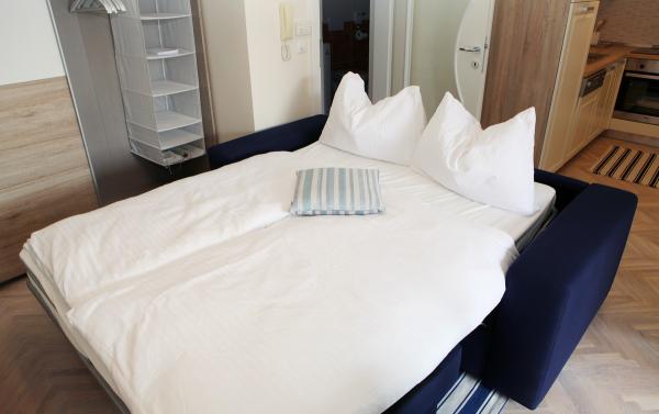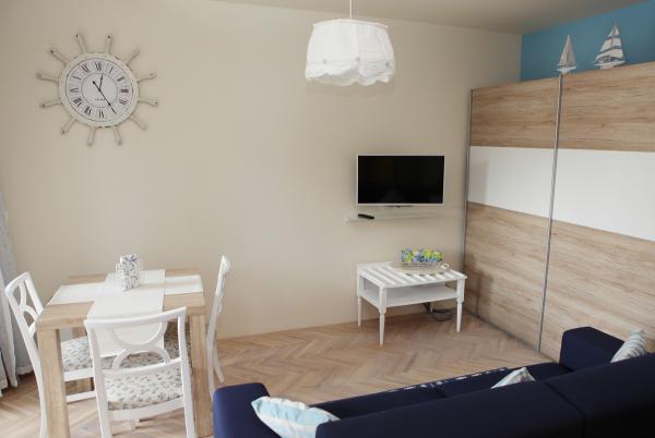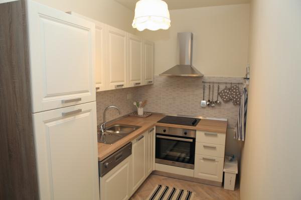 Mediteranski chic u strogom centru starog grada Rijeke, netom ispod katedrale Sv. Vida, u neposrednoj blizini živahnog Korza. Savršeno lociran za potpun doživljaj grada Rijeke i jednostavno istraživanje grada bez potrebe korištenja automobila. Spavaća soba s bračnim krevetom ( 180x200 cm ), dnevni boravak s kaučem na izvlačenje ( madrac s oprugama 140x195 cm tzv.francuski krevet ), kuhinja, kupaonica s kadom i wc-om, dodatni izdvojeni wc i ugodna balkonska lođa s garniturom za sjedenje. Suvremeno opremljen na način da se osjećate kao kod kuće: gratis WiFi internet, klimatiziran, LED Sat TV, kompletno opremljena kuhinja s perilicom posuđa, ventilacijskom pećnicom, staklokeramičkom pločom s četiri grijača, frižiderom sa zamrzivačem; perilica rublja, sušilo za kosu, turistički set za kupanje. Izmjena posteljine i ručnika tjedno; mogućnost izmjene ručnika dnevno na zahtjev gosta.