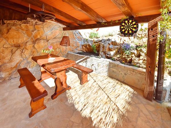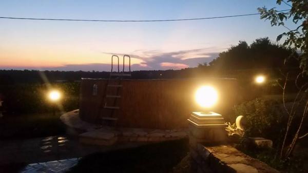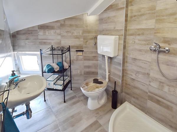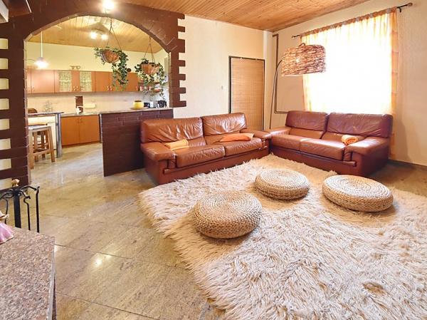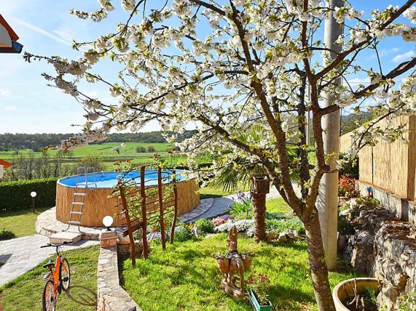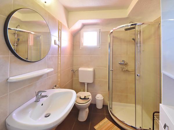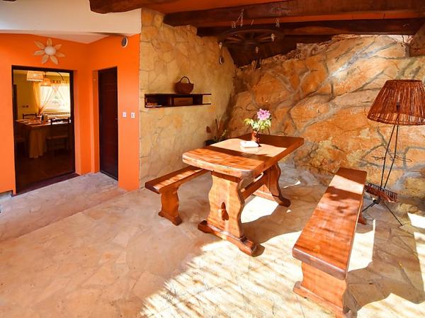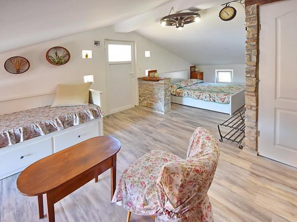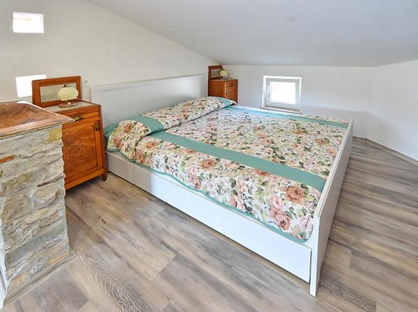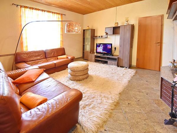 3 i pol sobna kuća na 2 etaže. 1. soba-francuski krevet, 2. soba- bračni krevet krevet za jednu osobu, 3. soba(na katu)- 2 bračna kreveta (soba ima klima uređaj). Kuća je opremljena sa svim stvarima koje su potrebne u kućanstvu. Veliki dnevni boravak s plosnatim tv-om i satelitskom antenom, wirelles internet, velika blagavaona sa još 2 kreveta, otvorena kuhinja sa 2 šanka, vanjski roštilj, kamin. Vrt iza kuće je natrkriven i uređen(pogodan za popodnevno druženje), bazen promjera 5. 5 metara i dubine 135 cm. Okućnica je zatvorena, izlaz na 2 strane. Vrt je moderno uređen. 4 ležaljke, bicikle, dodatni mali bazen za djecu, dječje igračke, dodatni krevetić za djecu. Klima uređaj se nalazi u sobi na katu.