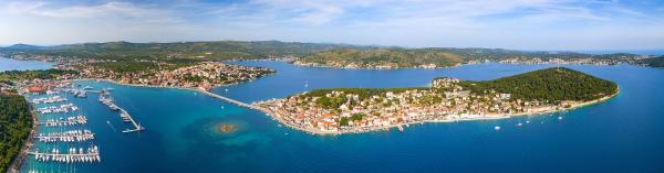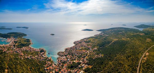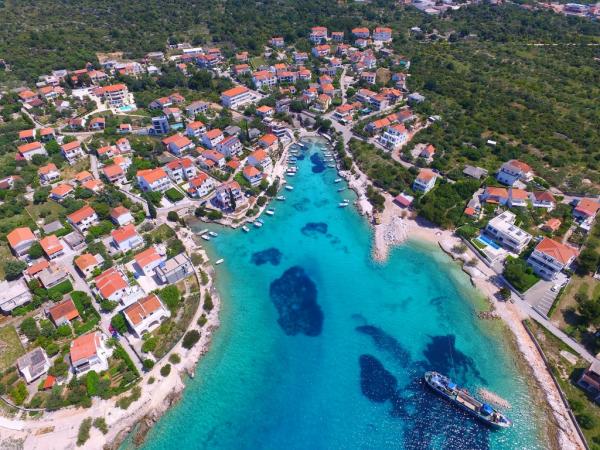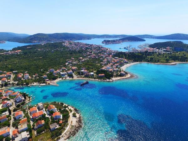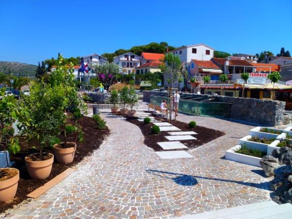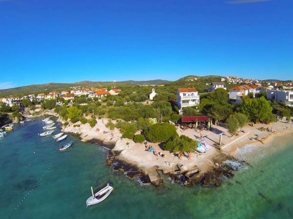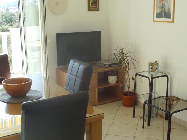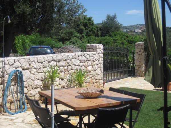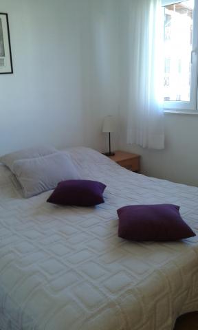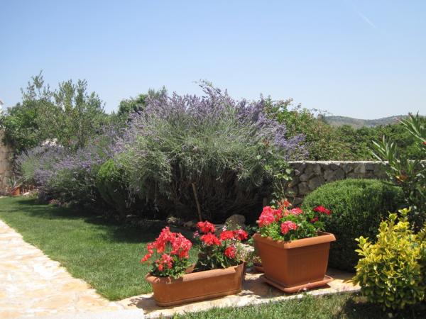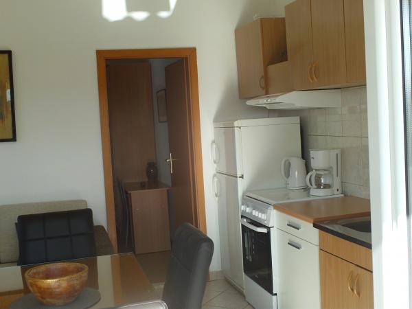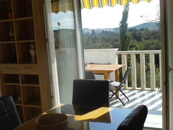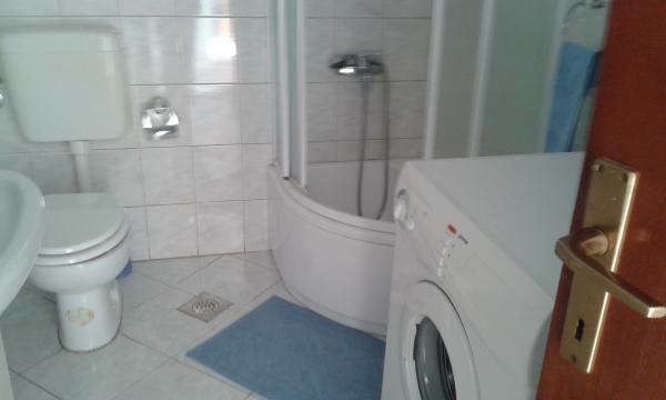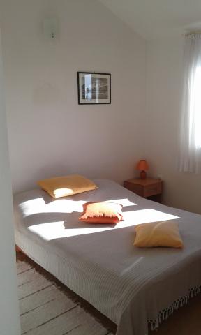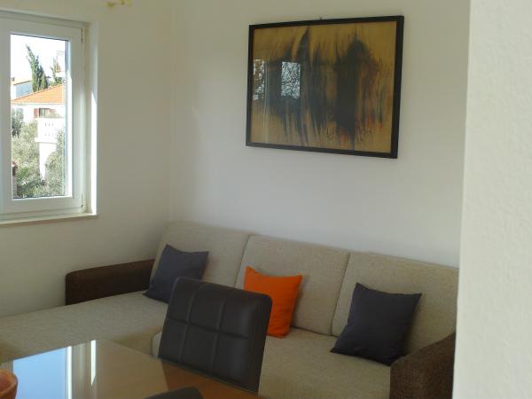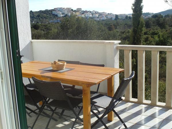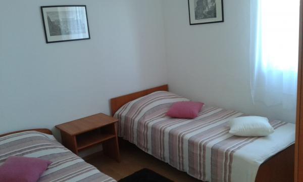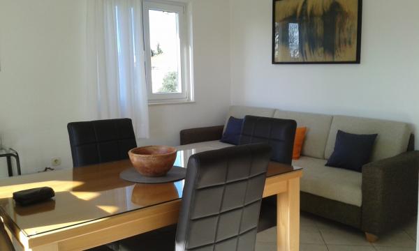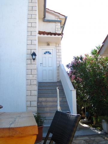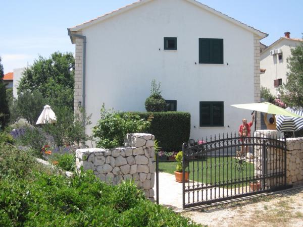 Apartman koji zauzima cijeli 1. kat obiteljske kuće, sa odvojenim ulazom. U prizemlju borave vlasnici. Oko kuće je ***veliki vrt s travnjakom*** od kojeg jedan dio koriste samo gosti. U to je uključen i veliki grill sa stolom i stolicama, vanjski tuš, te parkirno mjesto. Apartman ima 60 kvadratnih metara unutrašnje površine i terasu od 15 kvadratnih metara sa vrlo lijepim pogledom. Na raspolaganju su ***3 sobe (2 sobe sa po jednim većim krevetom za 2 osobe i 1 soba sa 2 pojedinačna kreveta)***, dnevni boravak, velika terasa sa tendom i stolom za 6 osoba, kuhinja, kupatilo sa tuš kabinom i veš mašinom. Kuhinja je opskrbljena kuhalom na plin i struju, kuhinjskim bojlerom, hladnjakom, pećnicom, kuhalom za vodu, te aparatom za kavu. U dnevnom boravku se nalazi trosjed koji se može pretvoriti u ležaj za dodatne dvije osobe, stol za objedovanje, TV i klima uređaj. Besplatni WiFi je također uključen!
