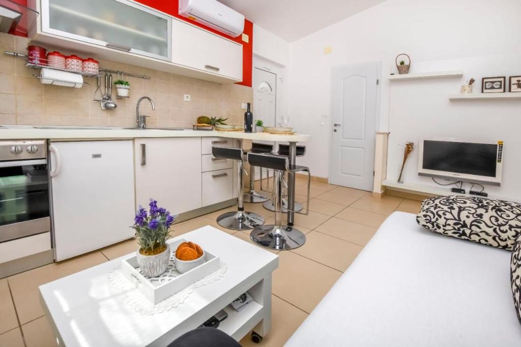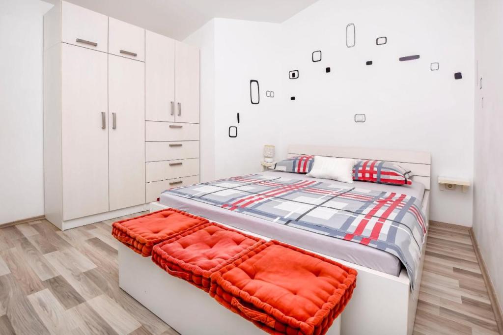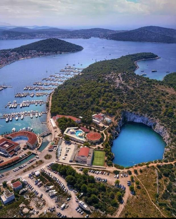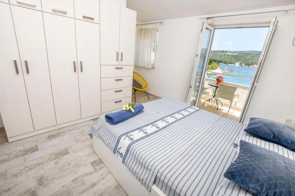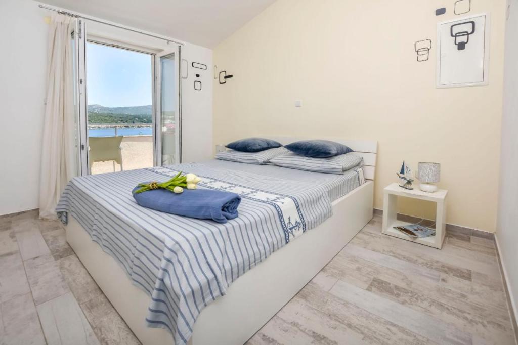 U ponudi izdvajamo 2Jednosobna apartmana, dva dvosobna i 1 put trosoban apartman u novogradnji na vrhunskoj i jedinstvenoj poziciji uređivani po zahtjevima za zvjezdice, kompletno luksuzno namješteni i opremljeni. U spavaćim sobamai kreveti 160200 za dvije osobe, u dnevnom boravku 180200 garnitura na razvlačenje sa ugrađenim anatomskim madracem plus dodatni ležaj na zahtjev. Ultra moderna kuhinja sa svim ugradbenim i ostalim potrebnim aparatima. Apartmani su također opremljeni sefom, klimom, LCD televizorom, internet usb priključak, perilicom rublja u vlasničkom apartmanu. Dječji krevetić na zahtjev. Osigurano parking mjesto i sidrište za brod. Nadamo se da ćete se ugodno osjećati u našim apartmanima, uz napomenu da je kompletan namještaj anatomski i po mjeri.