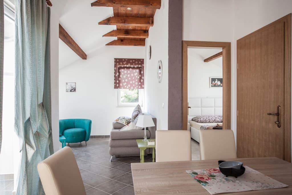 Lijepo uređen apartman u mirnom predjelu, udaljen svega 2min hoda od plaže te 10-15 minuta hoda od centra, idealno za obiteljski odmor, postoji plaža za djecu te hladovina, kafić na plaži udaljen cc 150m, u centru se nalazi dobar izbor restorana i kafića, također je u blizini (15min hoda) i jedna od najljepših europskih marina (Marina Frapa) u čijoj blizini se nalazi poznato jezero "Zmajevo oko" kao i brojne druge plaže, mogućnost izleta s autom u oližnji Primošten, Šibenik, Trogir, Split, nacionalni park Krka i Plitvice.
