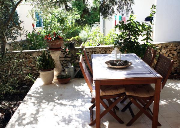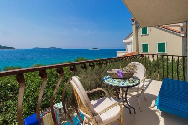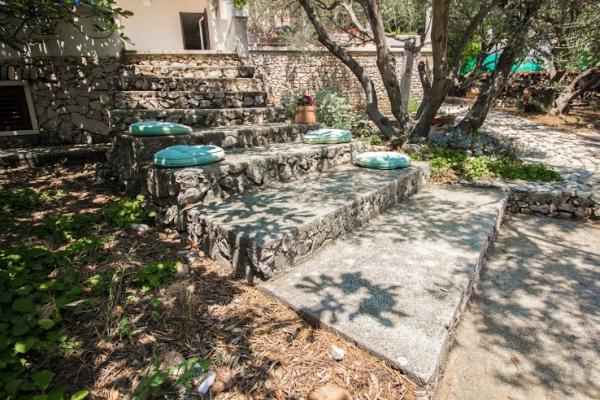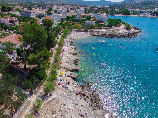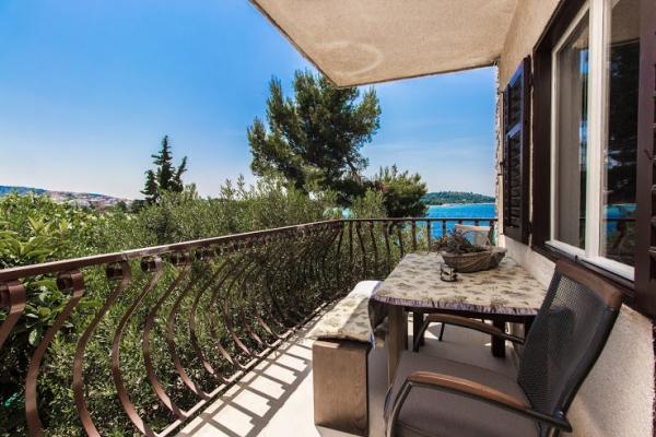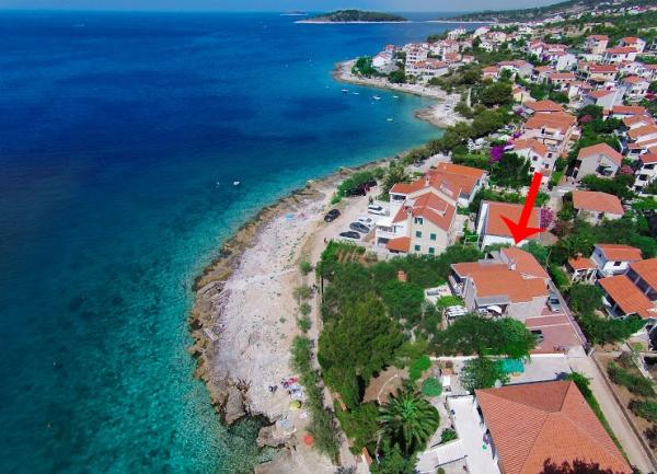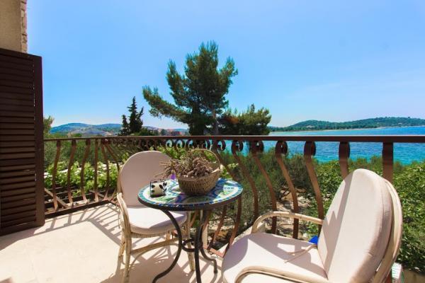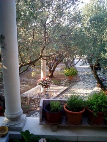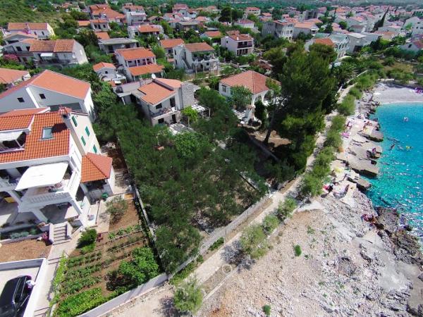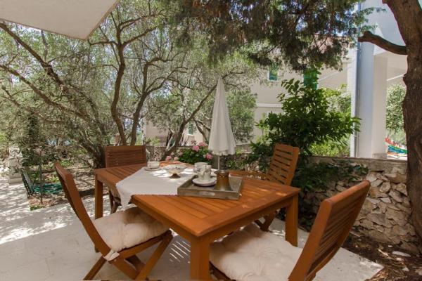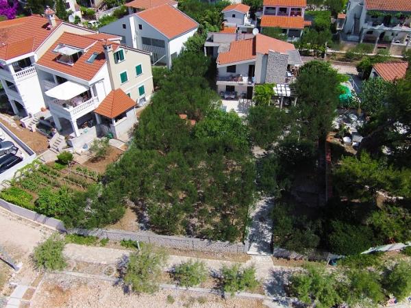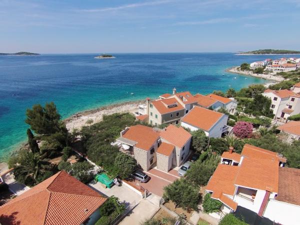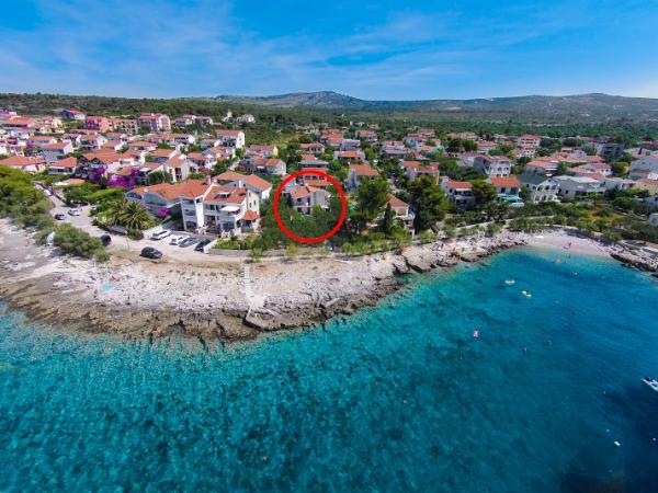 Apartmani se nalaze u kući prvi red do mora na parceli od 800m2. Ispred kuće je tipični dalmatinski vrt ( smokva, masline, lavanda, cvijeće). Sijena maslina daje ugodan hlad za vrijeme velikih vručina. U vrtu se nalazi roštilj, tuš, a kamenom stazom izlazi se na plažu gdje je vez za brod (besplatan).Iza kuće je veliki parking,do centra mjesta laganom šetnjom uz more za 20 min. U blizini kuće nalazi se lijepi bar, gdje pod hladom tamarisa možete uživati u ispijanju prve jutarnje kave ili u sutonu uz čašu pive.... U kući se nalaze tri apartmana i stan vlasnika koji vam u svakom trenutku diskretno stoji na raspolaganju. Služimo se engleskim, francuskim i taljanskim. Apartmani su opremljeni s kvalitetnim namještajem dijelom ručne izrade (zidni ormari), posteljina, ručnici, kuhinjske krpe, suđe, posuđe, mali kućanski aparati su sastavni dio. Na balkonima se nalaze stolovi, stolice, suncobrani, ležaljke. Podovi su obloženi mramorom, a stepenice i balkoni bijelim dalmatinskim kamenom.