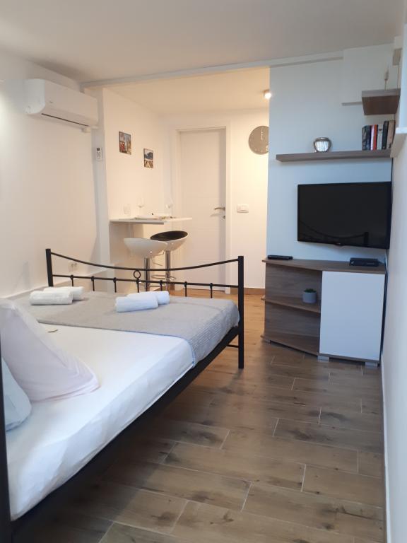 Kuća za odmor Vilson (6 + 2 osoba) se nalazi 5 m od mora i 30 m od centra u kojem se nalaze svi potrebni sadržaji za ugodan boravak. Prizemlje: - Garaža sa 2 parking mjesta - Soba No. 1 (studio apartman) sa bračnim krevetom, kompletno opremljenom kuhinjom i kupaonicom. (Sat. TV, Wifi, klima, perilica za rublje) 1. Kat: - Soba No. 2 (bračna soba) - Soba No. 3 (dječja soba, krevet na kat), kompletno opremljena kuhinja sa blagavaonicom i kupaonica. (Sat. TV, Wifi, klima, mašina za rublje) - Dnevni boravak sa trosjedom na razvlačenje (160×210cm) - Velika terasa sa pogledom na more Dječji krevetić dostupan na zahtjev.
