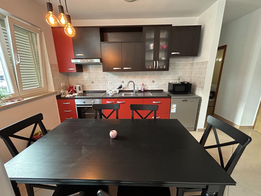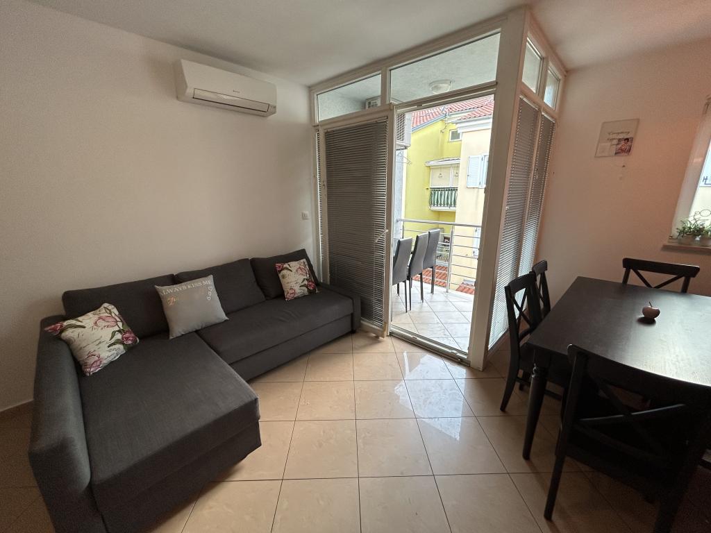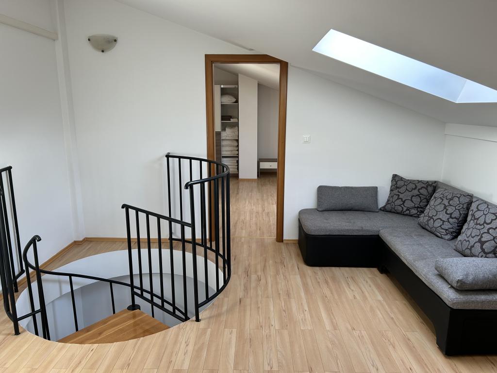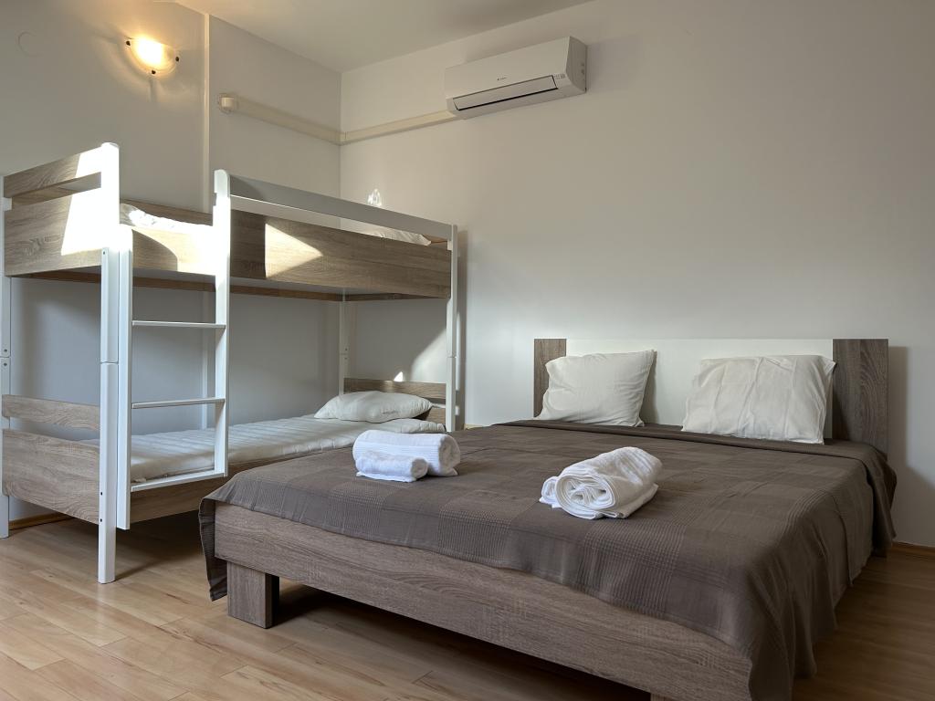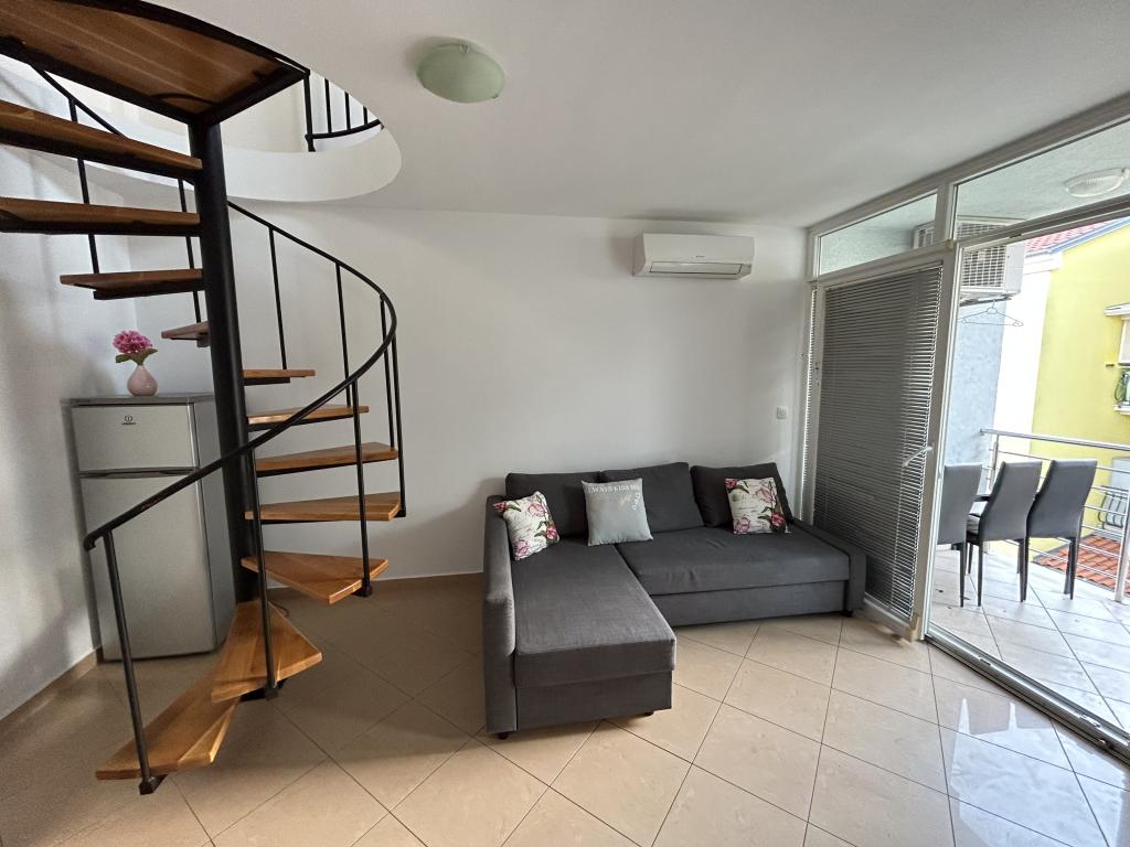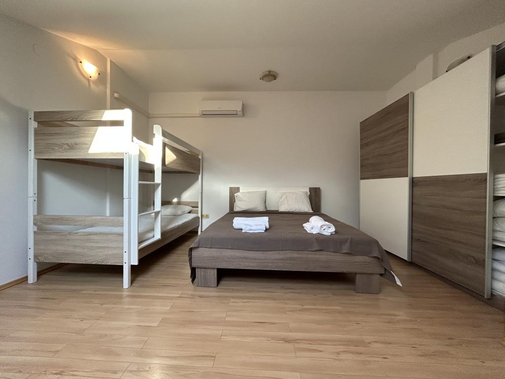 Apartman u Rovinju prostire se na dva kata. Na prvom katu nalazi se dnevna soba s kuhinjom, jedna spavaća soba za dvije osobe, jedna spavaća soba za jednu osobu te sofa u dnevnoj sobi. Također, na tom katu nalazi se i wc. Na drugom katu smještena je dodatna spavaća soba s dva kreveta, jedan sofa krevet te još jedan wc. Ukupno, apartman ima mogućnost smještaja za 6+3 osobe.