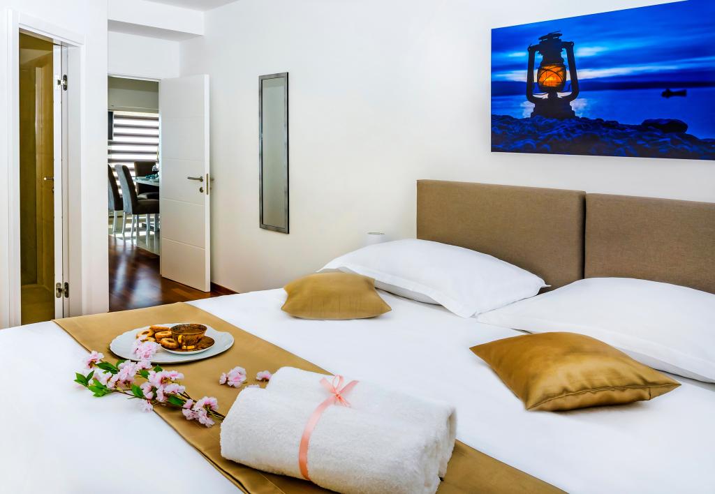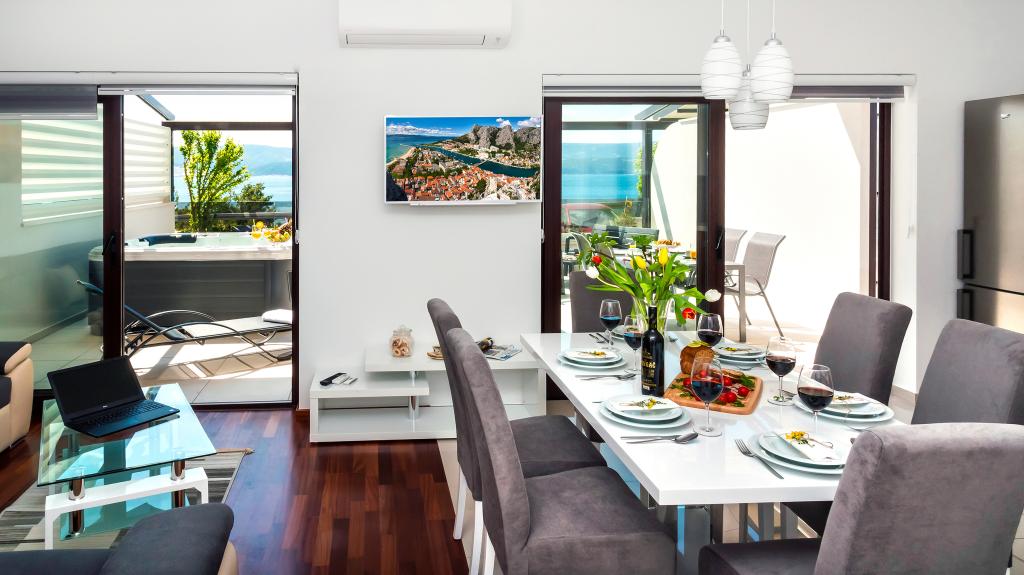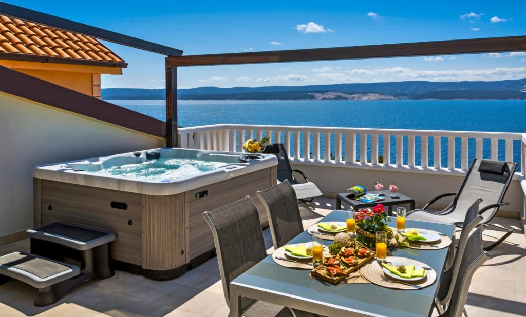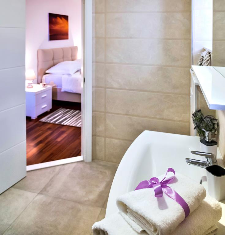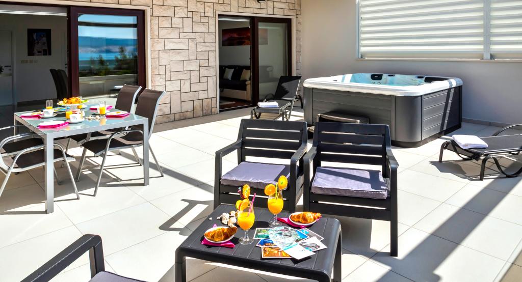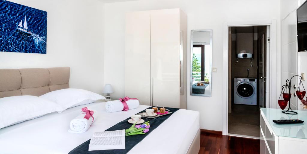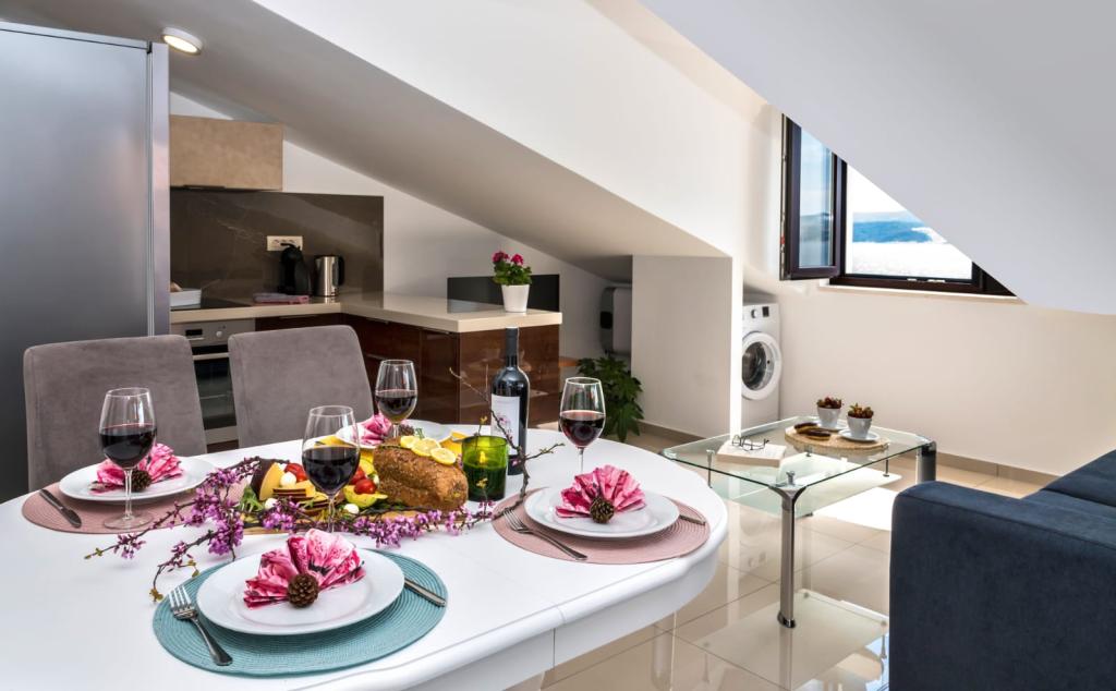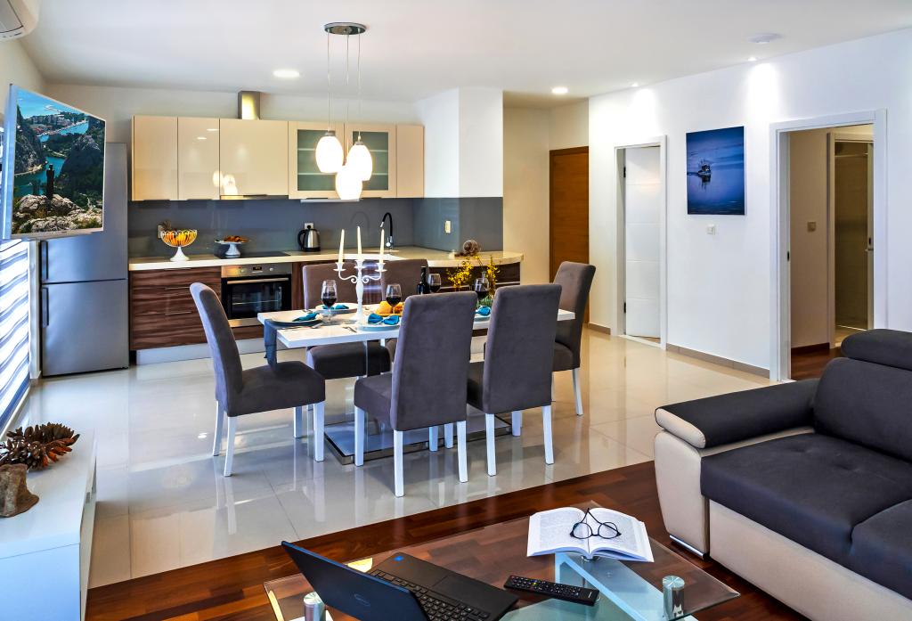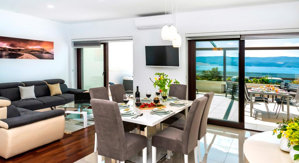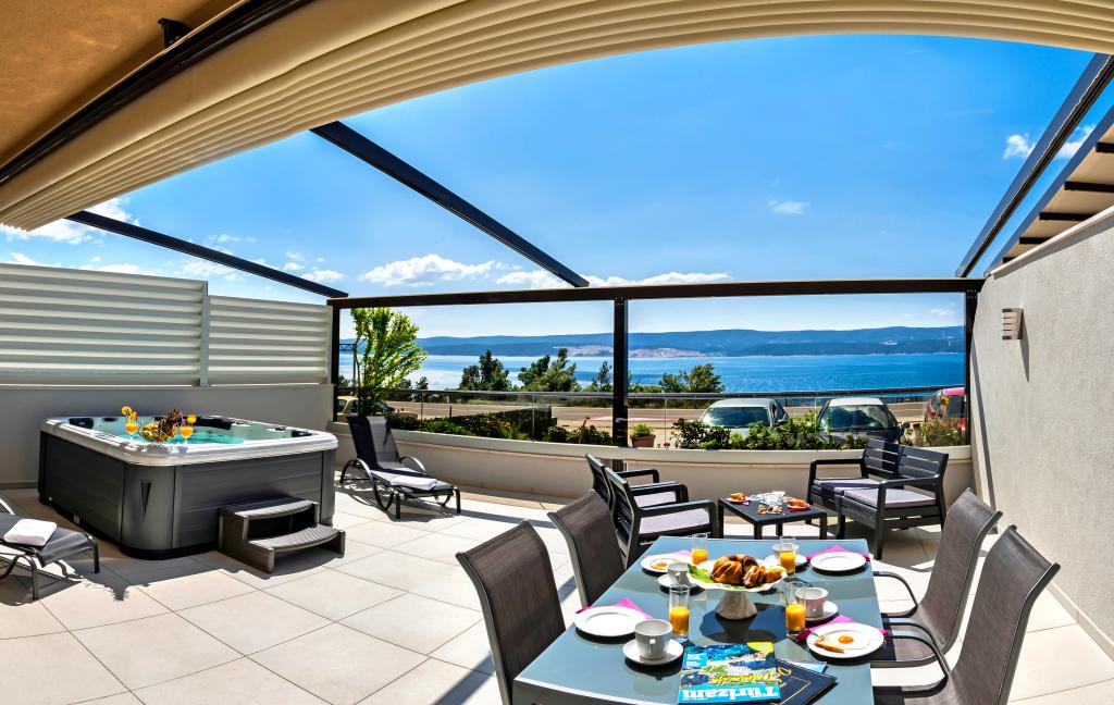 Objekt "Adria Croatica" ima 4 luksuzno opremljena apartmana s 4 zvjezdice, pogledom na more i besplatnim parkingom. Nalazi se 100 m od mora, a do plaže se ide pothodnikom koji se nalazi kraj objekta. Apartmani su kompletno i suvremeno opremljeni s kvalitetnim namještajem. Idealni su za duži boravak, dok ga hidromasažne kade ćine opuštajućim. Jedinice imaju 2 spavaće sobe, 2 kupaonice, kuhinju, dnevni boravak, blagavaonicu, terasu ili balkon. Opremljene su zvučno izoliranim sobama, klimom, besplatnim internetom, satelitskim programima,...