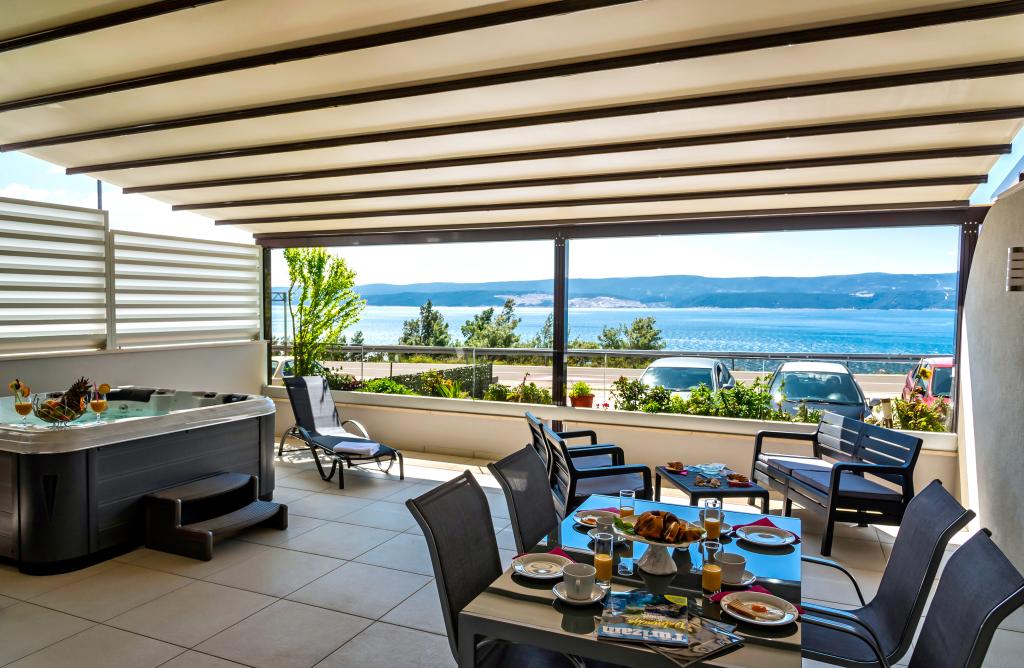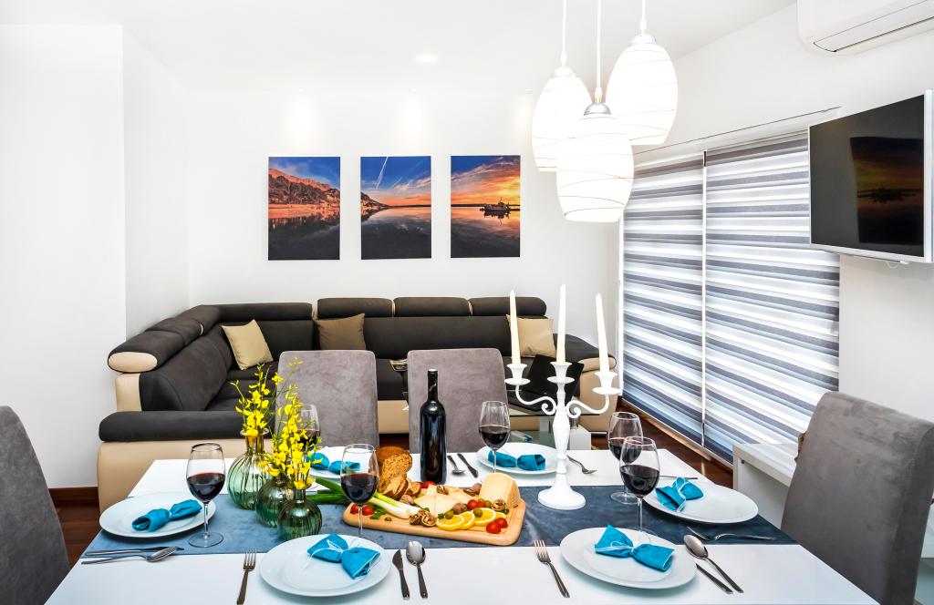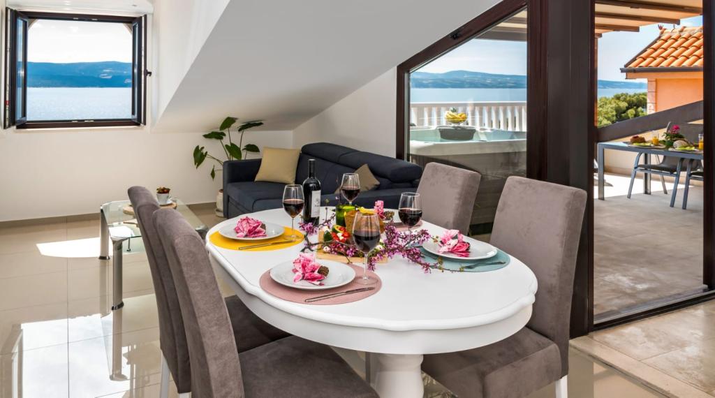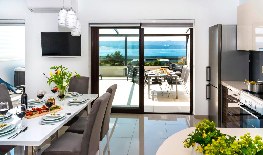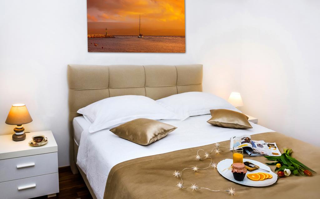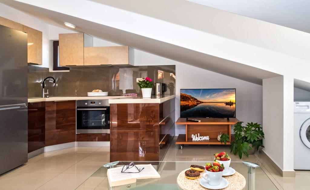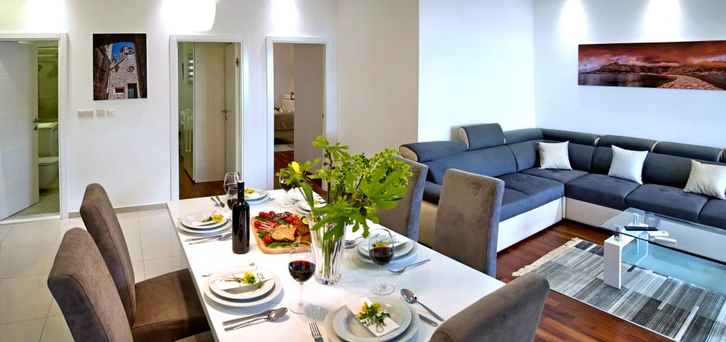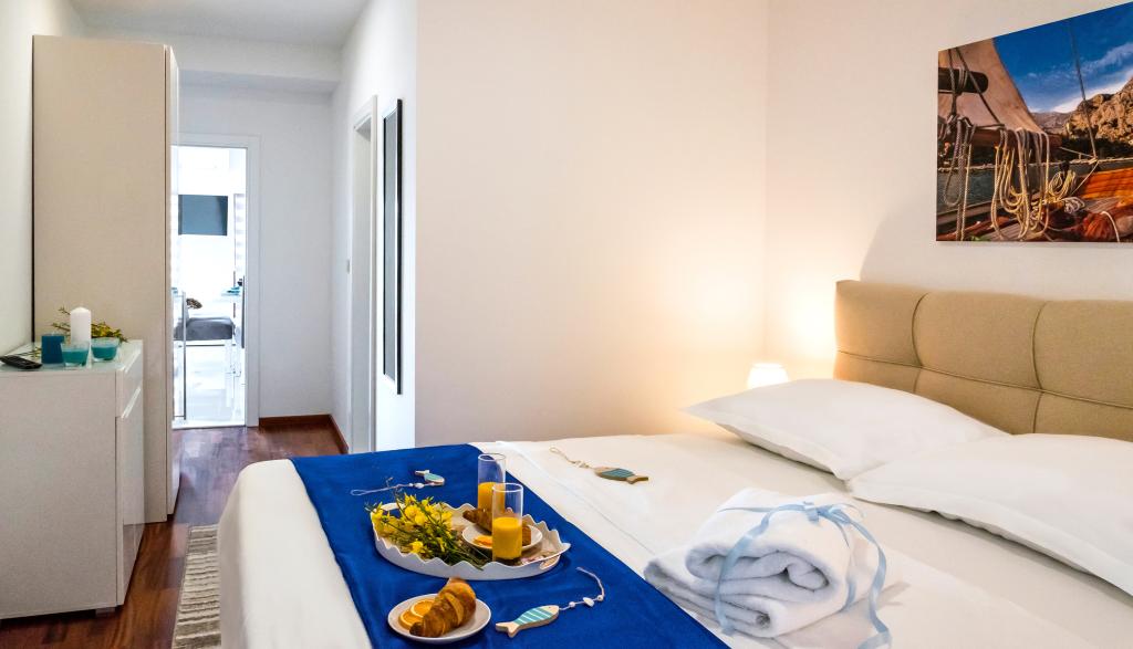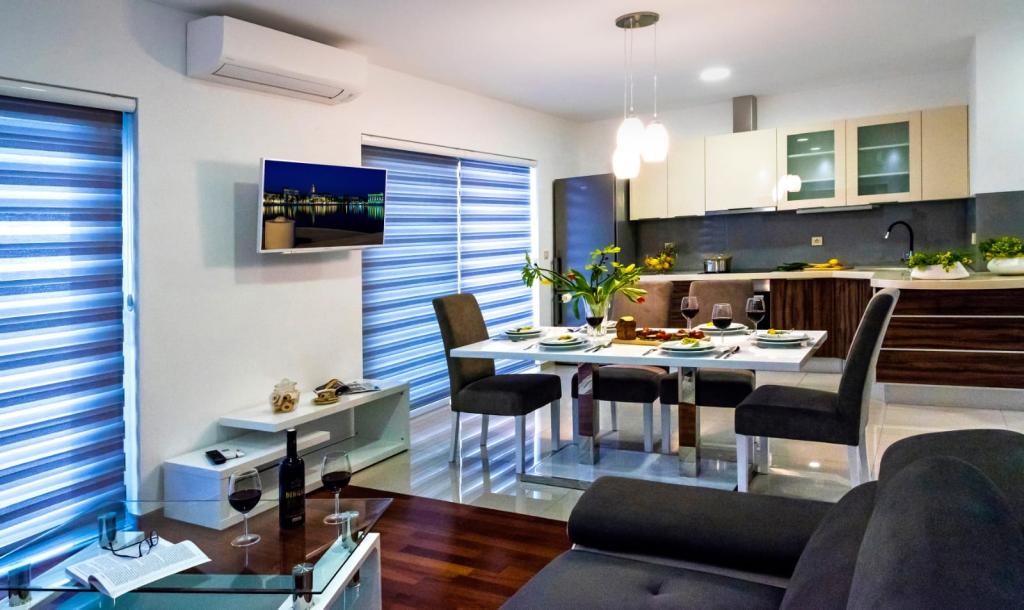 Objekt "Adria Croatica" ima 4 luksuzno opremljena apartmana s 4 zvjezdice, pogledom na more i besplatnim parkingom. Nalazi se 100 m od mora, a do plaže se ide pothodnikom koji se nalazi kraj objekta. Apartmani su kompletno i suvremeno opremljeni s kvalitetnim namještajem. Idealni su za duži boravak, dok ga hidromasažne kade ćine opuštajućim. Jedinice imaju 2 spavaće sobe, 2 kupaonice, kuhinju, dnevni boravak, blagavaonicu, terasu ili balkon. Opremljene su zvučno izoliranim sobama, klimom, besplatnim internetom, satelitskim programima,...