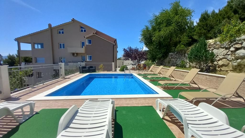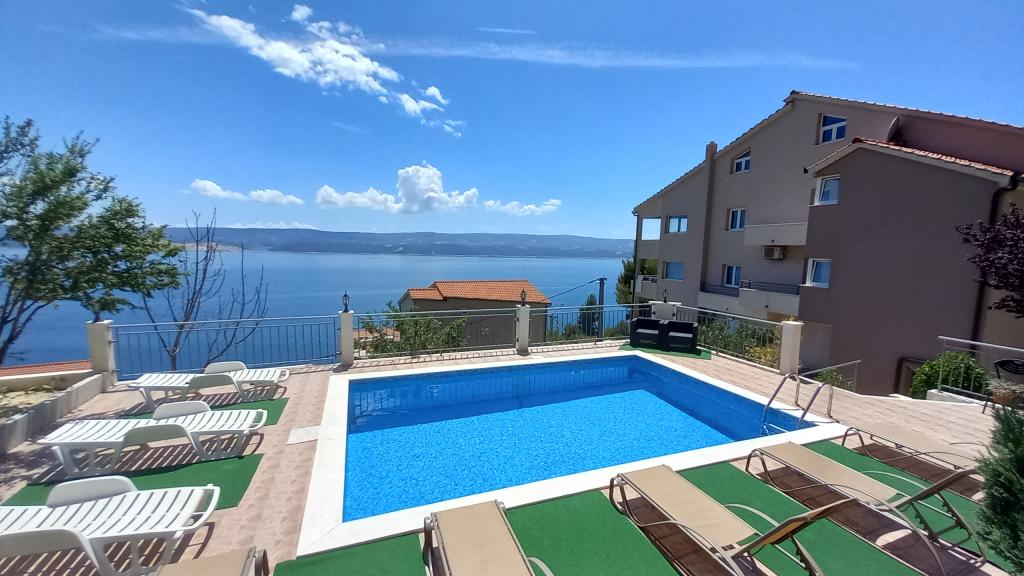 Moderni apartmani s bazenom u malom turističkom mjestu Čelina, 5 kilometara od glavnog grada Omiša. U ponudi imamo dva dvosobna luksuzna apartmana. Opis apartmana : Apartman A 5 +1 se nalazi na prvom katu i sastoji se od dvije spavaće sobe, potpuno opremljene kuhinje, dnevnog boravka, kupaonice i WC-a. Ima veliku terasu okrenutu prema jugu sa zadivljujućim pogledom na more i dva manja balkona okrenuta prema istoku i zapadu. A 4 +1 je na drugom katu i sastoji se od dvije spavaće sobe, potpuno opremljene kuhinje, dnevnog boravka, kupaonice. Ima veliku terasu okrenutu prema jugu s prekrasnim pogledom na more i malim balkonom okrenutim zapadu. U obje spavaće sobe nalazi se jedan bračni krevet. Gosti na raspolaganju imaju besplatni WiFi, besplatan parking (garaža), vanjski bazen s pogledom na more i otok Brač, besplatno korištenje klima uređaja (6 sati na dan, u svim apartmanima, svaki dodatni sat se plaća 2 euro (dobra izolacija na kući ).