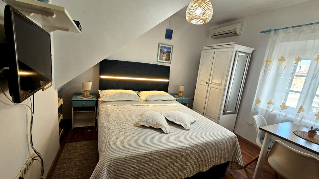 Apartmani «Viktorija» nalaze se u malom turističkom mjestu Seget Vranjica, 6 km od Togira - grad pod zaštitom UNESCO, 9 km od aerodroma Split, 30 km od Splita. Apartmani «Viktorija» uključuju 2 studiio apartmana i 1 apartman (4 1): Studio za 2 pax – 22 m2 balkon 5 m2, nalazi se na prvom katu, kuhinja, dnevni boravak i spavaća soba su smješteni u jednoj prostoriji, WC sa tušem, SAT TV, klima, besplatan Wi-FI. Studio (2 1) – 25 m2- balkon 5 m2, nalazi se na prvom katu, kuhinja, dnevni boravak i soba ( couch and double bed )su smješteni u jednoj prostoriji, WC sa tušem, SAT TV, klima, Wi-Fi Apartman (4 1) - 50 m2 balkon 10 m2, nalazi se na prvom katu, kuhinja, blagavaona, 2 dvokrevetne spavaće sobe, WC sa tušem, SAT TV, klima besplatan Wi-Fi Svi apartmani su potpuno opremljeni sa kuhinjskim posuđem, priborom za jelo, prekrivačima i ručnicima. Završno čišćenje uključeno u cijenu.