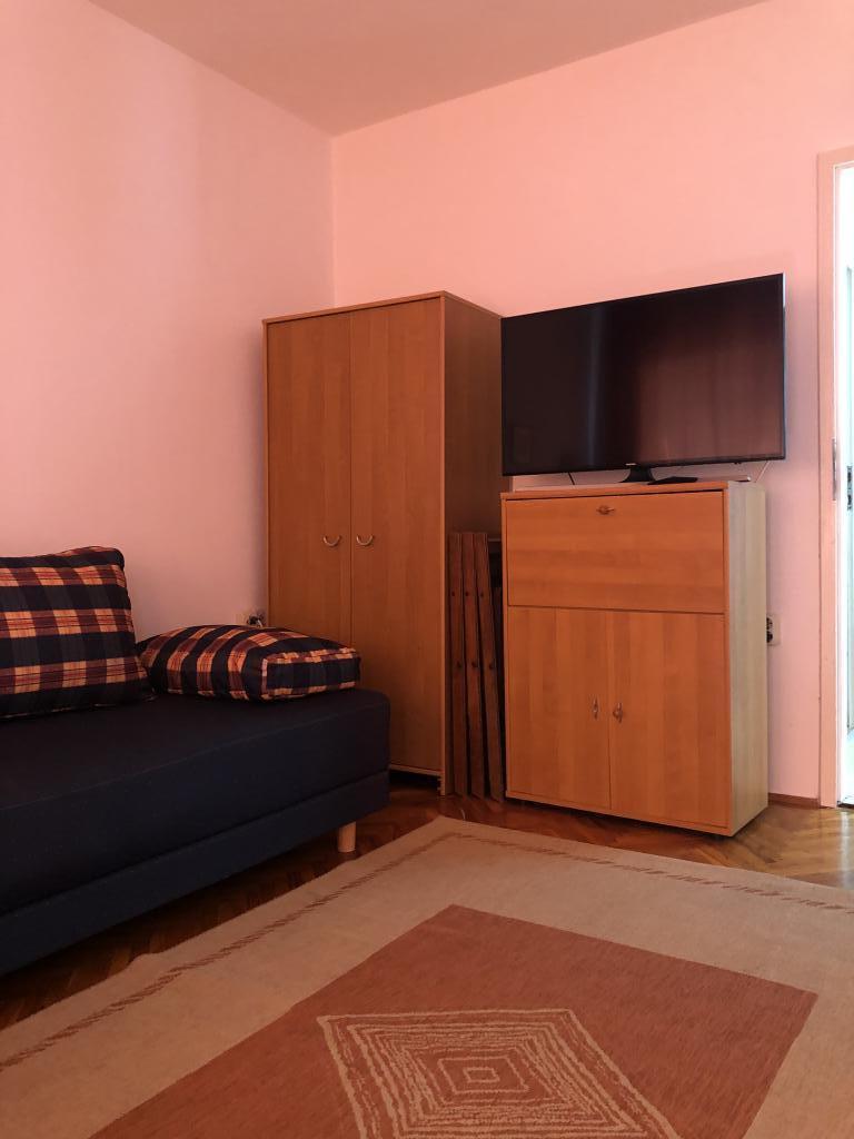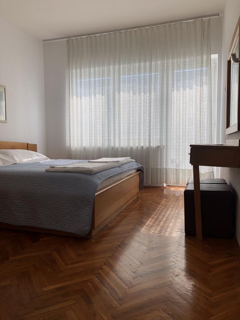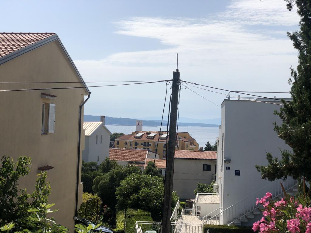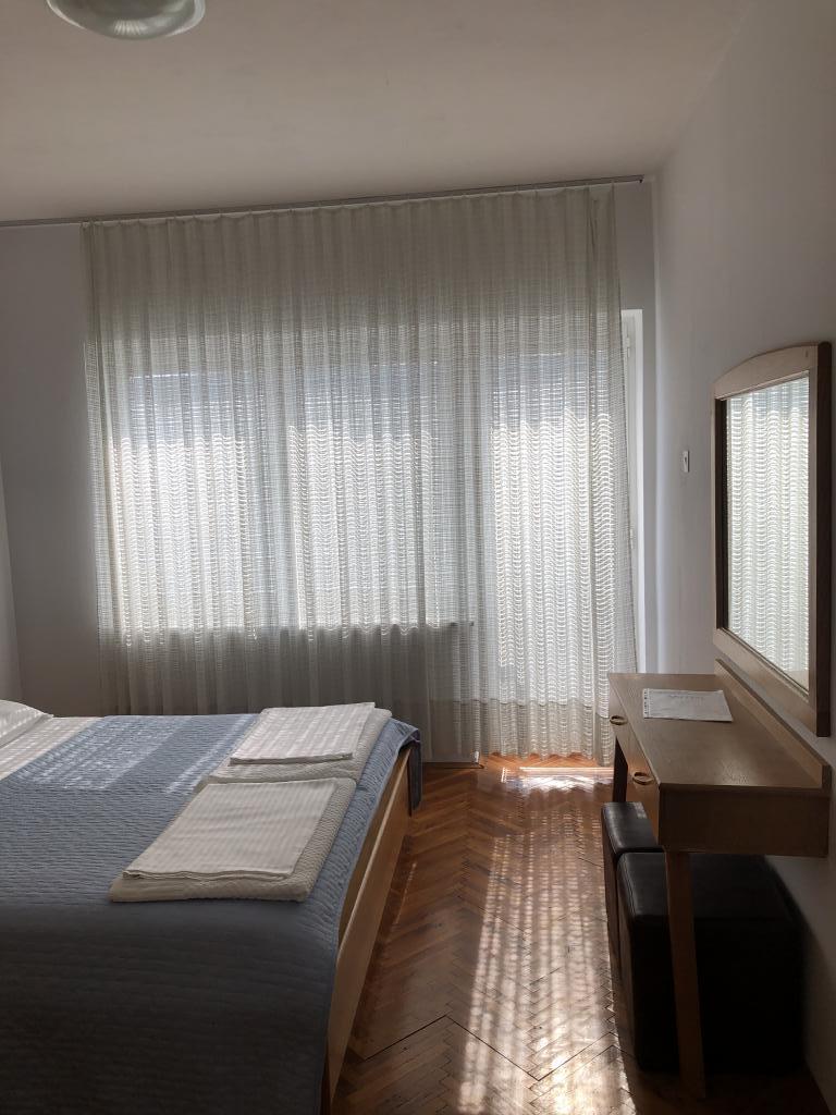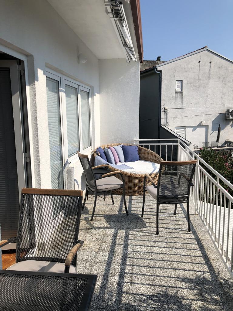 Moderno uređen apartman smješten na katu samostojeće kuće , zasebna etaža sa posebni ulazom i parkirnim mjestom. 5 minuta hoda od centra i deset od plaže. Sastoji se od ulaznog hodnika , kupaonice sa kadom, kompletno uređene kuhinje opremljene štednjakom, frižiderima, mikrovalnom pečnicom, kompletnim sudem i posuđem. Spavaće sobe sa bračnim krevetom i ugrađenim ormarom , manje spavaće sobe sa kaučem na razvlačenje i ugrađenim ormarom i dnevnog boravka sa televizorom i kutnom garniturom. Ispred spavaće sobe i dnevnog boravka nalazi se komotna terasa sa pogledom na more, natkrivena tendom i opremljena garniturom za blagovanje i ležaljkom . Prostor je klimatiziran i ima wifi.