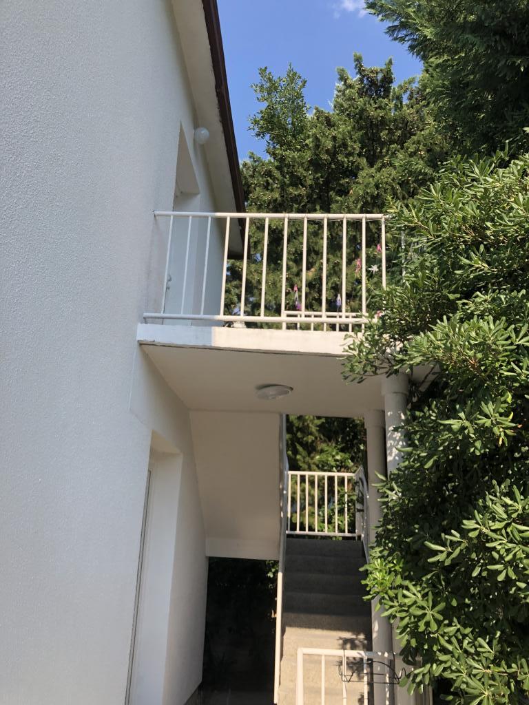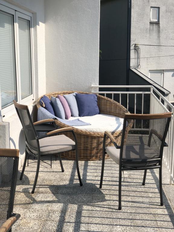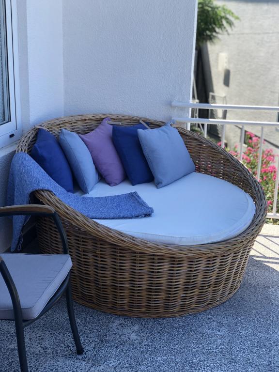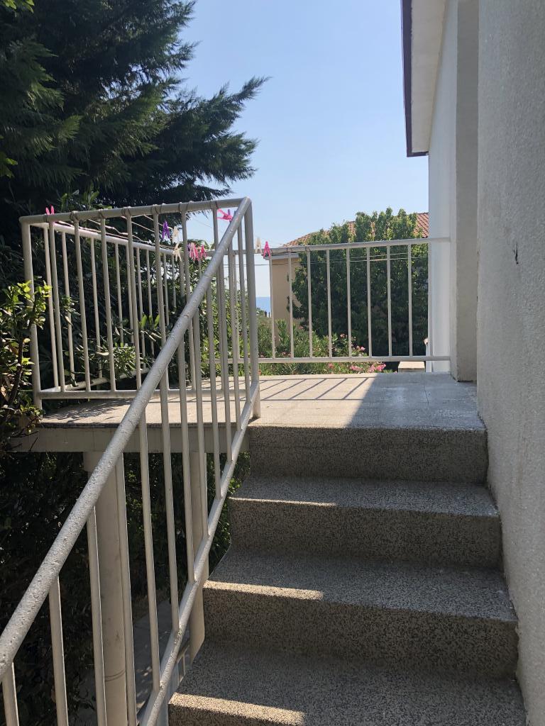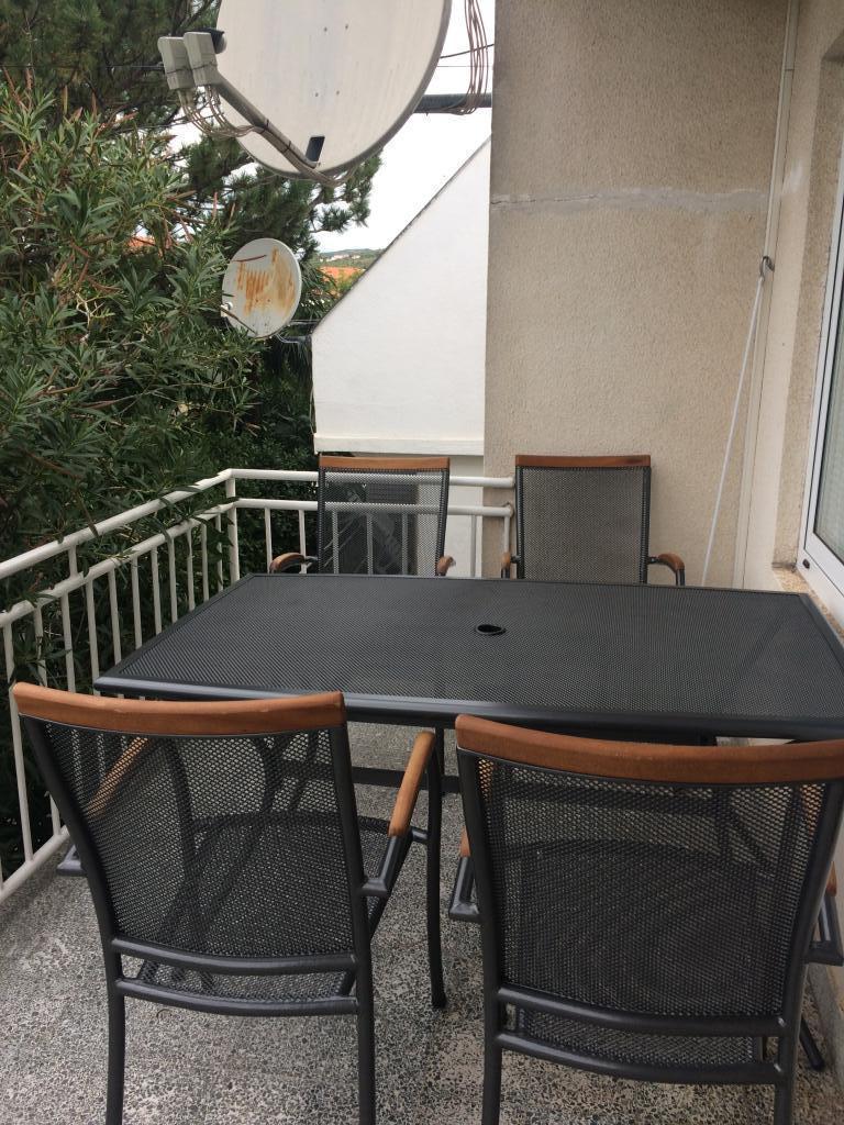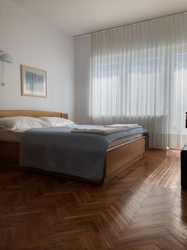 Moderno uređen apartman smješten na katu samostojeće kuće , zasebna etaža sa posebni ulazom i parkirnim mjestom. 5 minuta hoda od centra i deset od plaže. Sastoji se od ulaznog hodnika , kupaonice sa kadom, kompletno uređene kuhinje opremljene štednjakom, frižiderima, mikrovalnom pečnicom, kompletnim sudem i posuđem. Spavaće sobe sa bračnim krevetom i ugrađenim ormarom , manje spavaće sobe sa kaučem na razvlačenje i ugrađenim ormarom i dnevnog boravka sa televizorom i kutnom garniturom. Ispred spavaće sobe i dnevnog boravka nalazi se komotna terasa sa pogledom na more, natkrivena tendom i opremljena garniturom za blagovanje i ležaljkom . Prostor je klimatiziran i ima wifi.