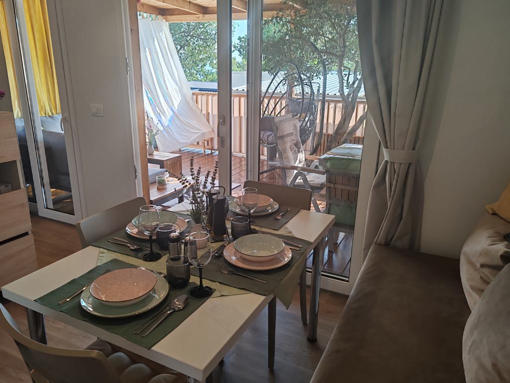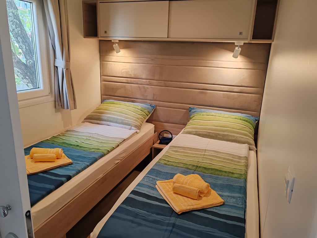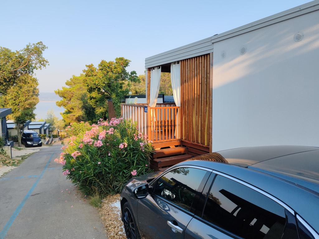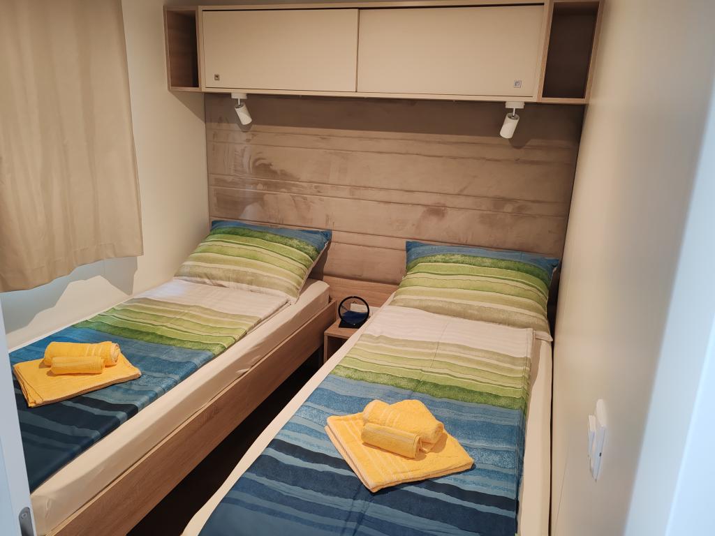 Kompletna i suvremeno opremljena mobilna kućica na izvrsnoj lokaciji u dobro poznatom i opremljenim kampu koji nudi obilje sadržaja pogotovo za obitelji s djecom. Kućica ima 32 m2, te se sastoji od 2 spavaće sobe, dnevnog boravka i kompletno opremljene kuhinje sa svime potrebnim, perilicom posuđa,mikrovalnom,toster,aparat za kavu Dolce gusto i kuhalo za vodu. Tu se nalaze i dva wc s tuš kabinama. U jednoj sobi je bračni krevet 140 × 200 cm i ona ima svoje kupatilo. U drugoj sobi su 2 odvojena kreveta 90 × 200 cm. U dnevnom boravku je trosjed koji se može razvući za dvoje. Terasa ima 29m2 na kojoj se smjestio grijani masažni jakuzi i sjedeće garniture.Objekt je potpuno opremljen sa svime što Vam je potrebno (od posteljine, ručnika, toaletnih potrepština itd.) Na raspolaganju je vanjski plinski roštilj. Na samo 100 m se nalazi kompleks bazena, kao i plaža udaljena cca 250 m. Do centra Selca svega 13 min hoda. Objekt nudi privatan parking i Internet bez dodatnog plaćanja sa smart TV.