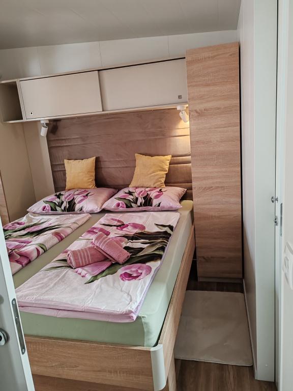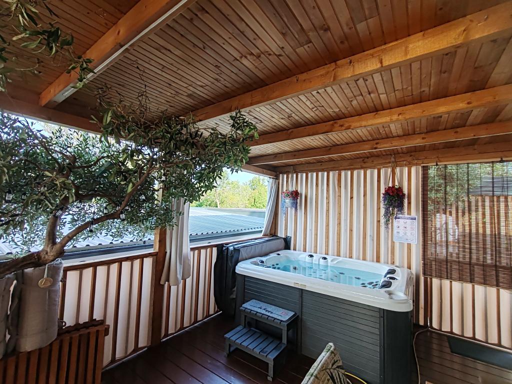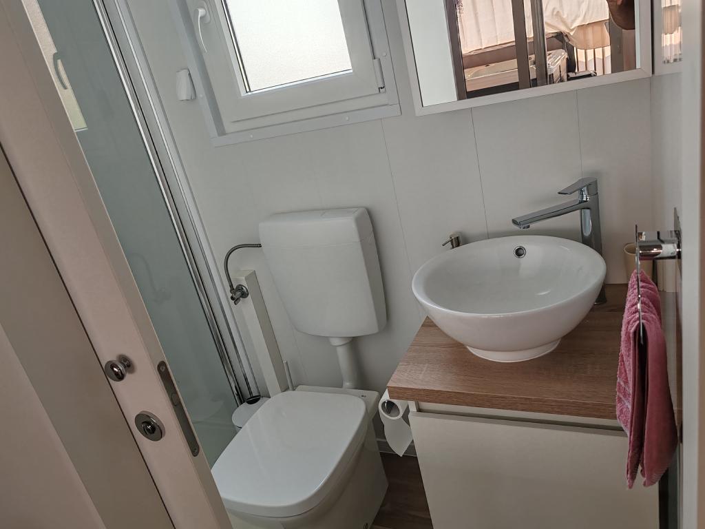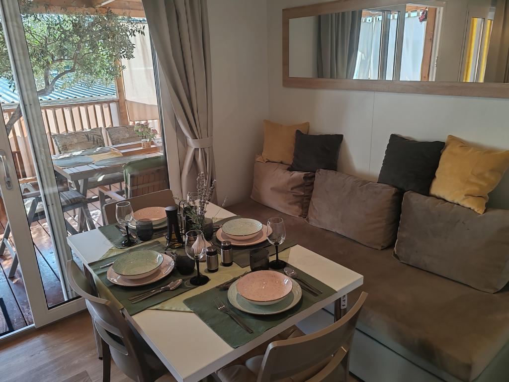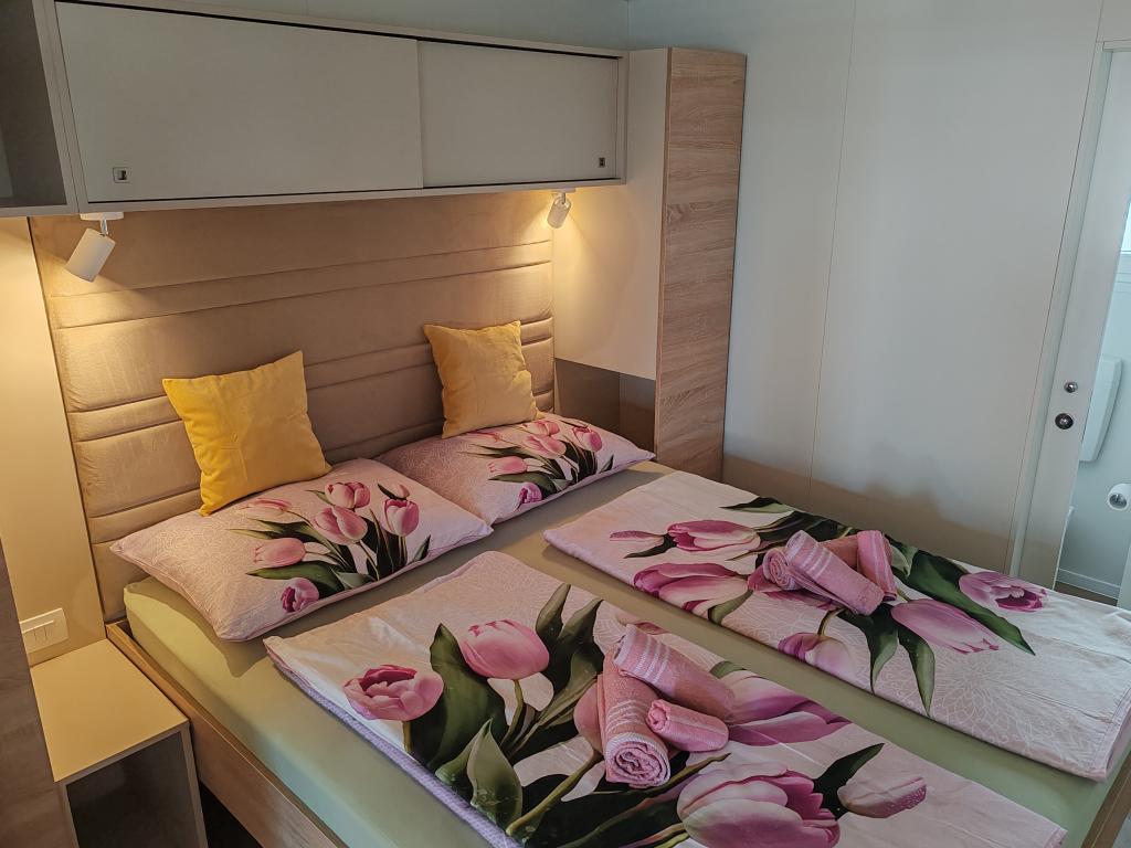Kompletna i suvremeno opremljena mobilna kućica na izvrsnoj lokaciji u dobro poznatom i opremljenim kampu koji nudi obilje sadržaja pogotovo za obitelji s djecom. Kućica ima 32 m2, te se sastoji od 2 spavaće sobe, dnevnog boravka i kompletno opremljene kuhinje sa svime potrebnim, perilicom posuđa,mikrovalnom,toster,aparat za kavu Dolce gusto i kuhalo za vodu. Tu se nalaze i dva wc s tuš kabinama. U jednoj sobi je bračni krevet 140 × 200 cm i ona ima svoje kupatilo. U drugoj sobi su 2 odvojena kreveta 90 × 200 cm. U dnevnom boravku je trosjed koji se može razvući za dvoje. Terasa ima 29m2 na kojoj se smjestio grijani masažni jakuzi i sjedeće garniture.Objekt je potpuno opremljen sa svime što Vam je potrebno (od posteljine, ručnika, toaletnih potrepština itd.) Na raspolaganju je vanjski plinski roštilj. Na samo 100 m se nalazi kompleks bazena, kao i plaža udaljena cca 250 m. Do centra Selca svega 13 min hoda. Objekt nudi privatan parking i Internet bez dodatnog plaćanja sa smart TV.