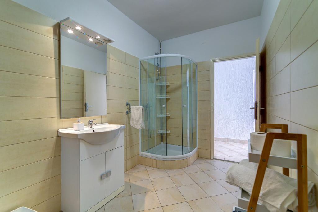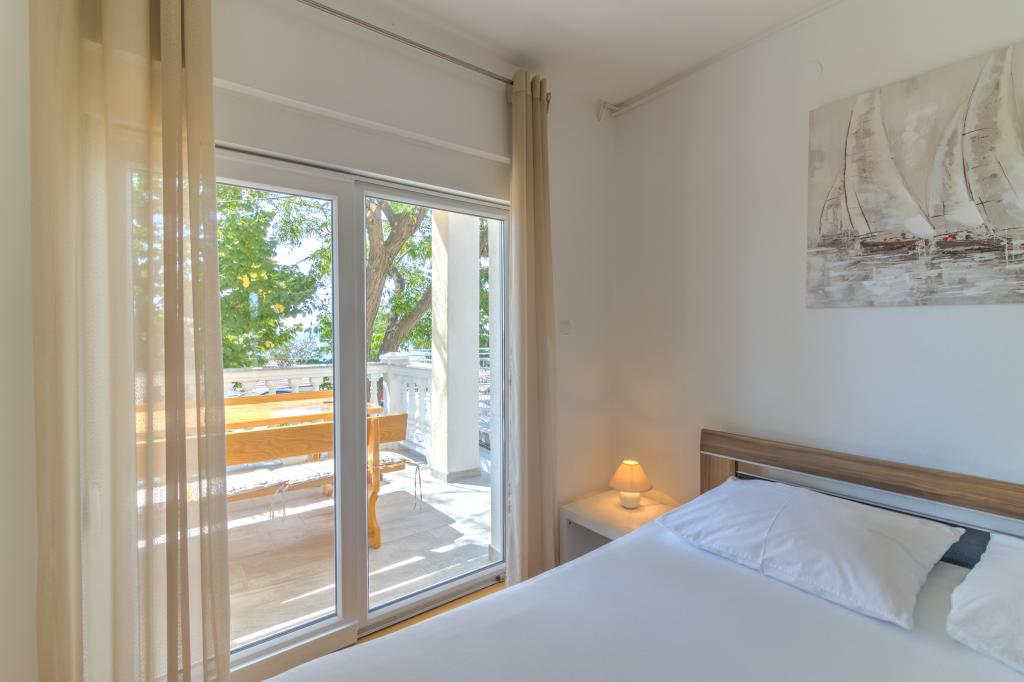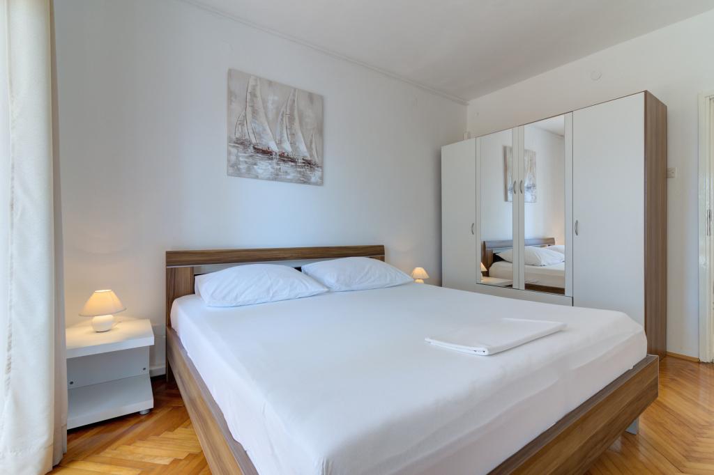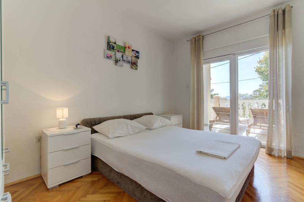 Suvremeno opremljeni Apartman Marta (površina 100 m2) za 6 osoba nalazi se u prizemlju obiteljske kuće okružene zelenilom i ima dvije velike sobe sa bračnim krevetima iz kojih se pruža prekrasan pogled prema moru, jednu prostranu sobu sa tri ležaja, dvije kupaone sa tuš kabinom i WC-om, prostrani dnevni boravak u kojemu se nalazi pomoćni ležaj, sa blagovaonom i kuhinjom koji su povezani sa natkrivenom sjenicom i roštiljem. Samo za goste ovog apartmana namjenjena je velika natkrivena sjenica (površina 40 m2) sa roštiljom i sjedećom garniturom za 8 osoba te dvije terase (površina 50 m2) sa pogledom na more opremljene sjedećom garniturom i dvijema ležaljkama . Ispred Apartmana se nalazi uređeni vrt sa dva velika stabla, travom i cvijećem i tri besplatna parkirna mjesta. Objekt se nalazi u mirnom predjelu grada 10 minuta hoda do prve plaže i do centra grada.