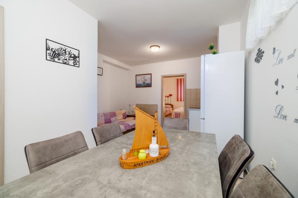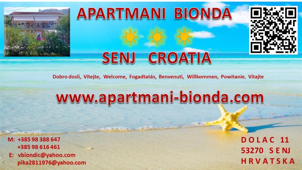 Apartmani BIONDA su novoizgrađeni, kompletno i moderno opremljeni u mirnom dijelu grada Senja. Nalaze se u odvojenom objektu tj. samostojećoj kući. Svaki apartman ima poseban ulaz, vlastiti balkon ili terasu, stol i stolice za balkon na raspolaganju, SAT- TV, bežićni internet, WI-FI, mini bar, klima uređaj, grijače ploče na struju, osiguran je i parking za vaš automobil. U neposrednoj blizini grada Senja nalaze se nacionalni park Plitvička jezera, parkovi prirode Velebit, Zavratnica, otoci Goli, Grgur, Prvić, Krk i Rab. Apartmani se iznajmljuju cijelu godinu.