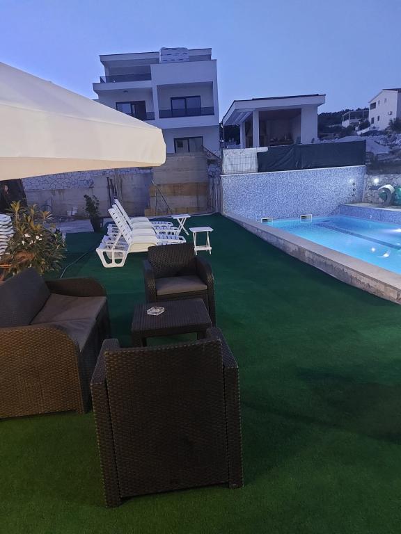 Apartmani Dinko Sevid (Apartmani s grijanim bazenom) sastoje se od 7 apartmana, 3 apartmana s dvije sobe i 4 apartmana s jednom sobom te u kuhinji klik klak ležaj. Svi apartmani imaju prekrasan pogled na more, klimu i wifi. Apartmani Dinko udaljeni su 100 metara od plaže, a svojim gostima nudimo 3 kajaka i 3 supa na besplatno korištenje. Također, naši gosti mogu uživati u kupanju u grijanom bazenu te dva vanjska roštilja. Sevid će Vas očarati kristalno čistim morem i netaknutom prirodom. Sevid je malo turističko mjesto (udaljen od Splita i Šibenika 45 km, 20 km od Trogira (grada pod zaštitom Unesco-a), 19 km od Primoštena, 12 km od Rogoznice, 55 km od Nacionalnog parka Krka). Apartmani Dinko odličan su izbor za sve koji žele miran odmor daleko od gradske buke i gužve. Ljubazni domaćini učinit će Vaš boravak još ugodnijim i ljepšim.
