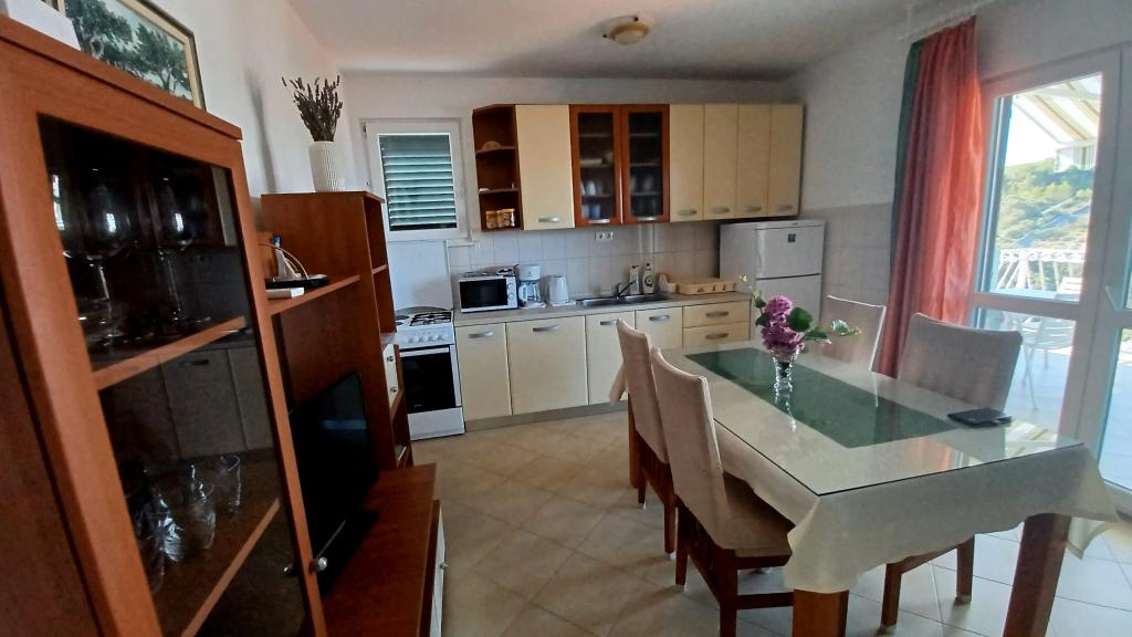 Odmor na kojem vas more prati svaki trenutak vašeg boravka. Prekrasan pogled na mirnu uvalu poziva vas da se osvježite u moru. Vlasnici su se pobrinuli da plaža bude i lijepo uređena. Detaljno očišćen, potpuno renoviran apartman nudi sve što je potrebno za kućanstvo. Ljubazni vlasnici također će se pobrinuti za sve informacije koje su vam potrebne tijekom vašeg boravka. Wifi, klima, TV, natkriveno parkiralište zaštićeno ogradom, sve to za vaš odmor bez stresa.