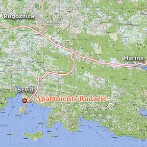 Apartmani Radačić smješteni su u malom mjestu Sevid. Daleko od svakodnevne buke gradskih područja, ovo malo mjesto nudi vam netaknutu prirodu, kristalno čisto more i tiho susjedstvo. U blizini je Unescom zaštićenih gradova bogate prošlosti i zanimljivih znamenitosti, Splita, Trogira i Šibenika te nacionalnih parkova Krka i Kornati. Našim gostima nudimo smještaj u dva apartmana. Apartman A4 opremljen je dvjema dvokrevetnim spavaćim sobama, kupatilom (tuš/ wc) i kuhinjom/ dnevnim boravkom s kaučem na razvlačenje za jednu osobu. Apartman A4+2 sadrži dvije dvokrevetne spavaće sobe, kuhinju/ dnevni boravak s kaučem na razvlačenje za dvije osobe, i dva kupatila (tuš/ wc). Svi apartmani imaju SAT/ TV, odvojenu terasu, pristup okućnici s roštiljom i osiguran besplatni parking. Plaža je udaljena manje od 20m od kuće, a sama je kuća u prvom redu do mora. U neposrednoj su blizini restorani, kafić i trgovina. Gosti mogu koristiti mali brod u dogovoru s vlasnikom (uz nadoplatu).