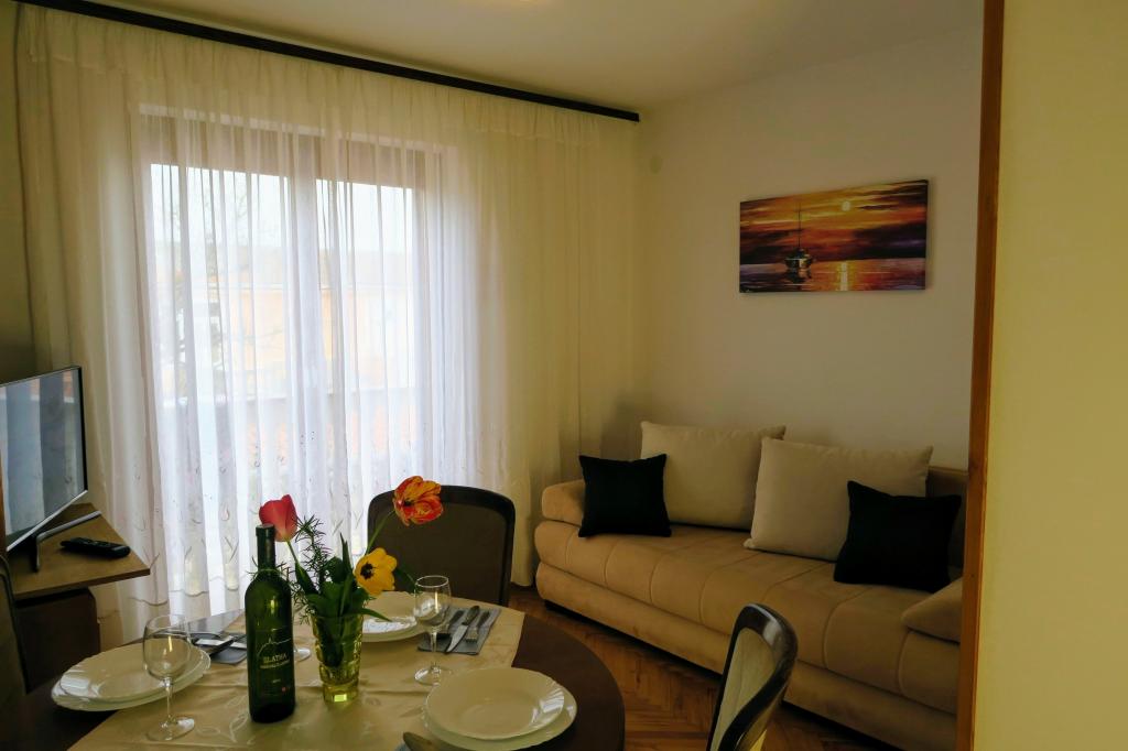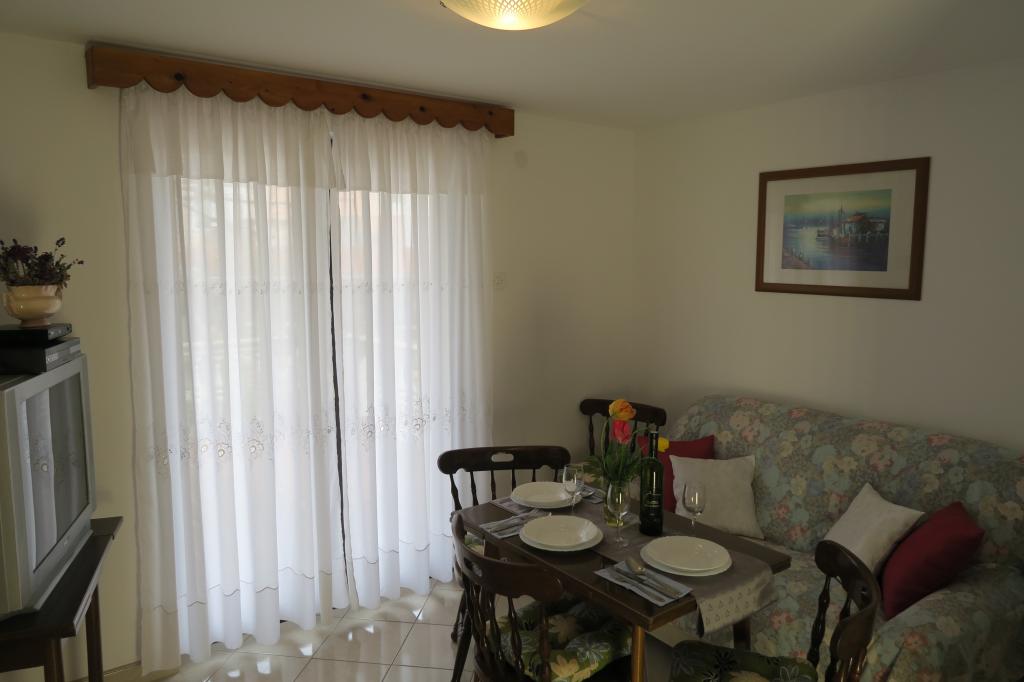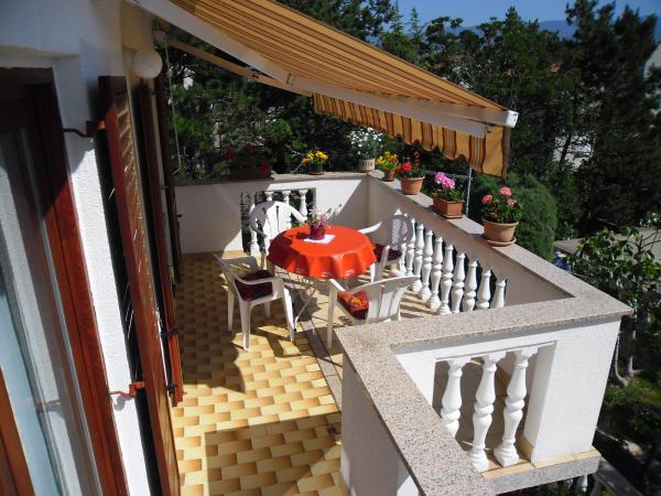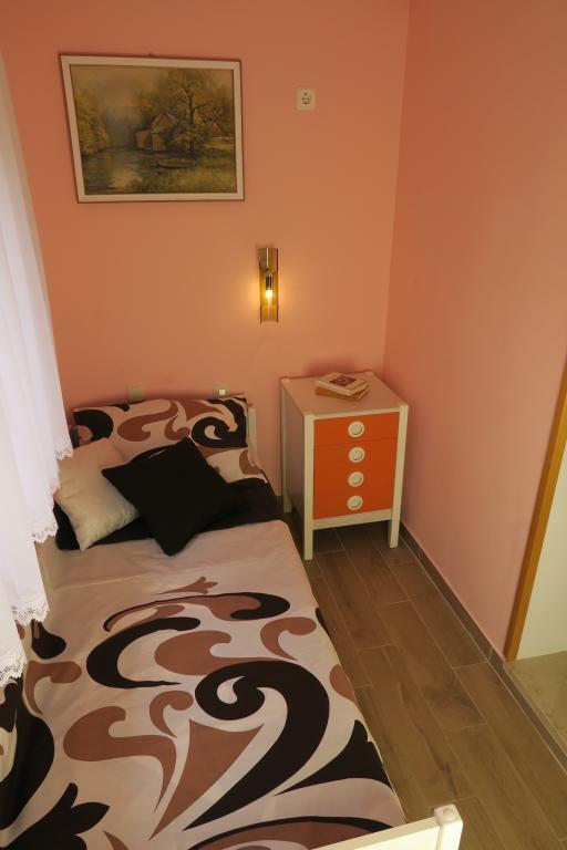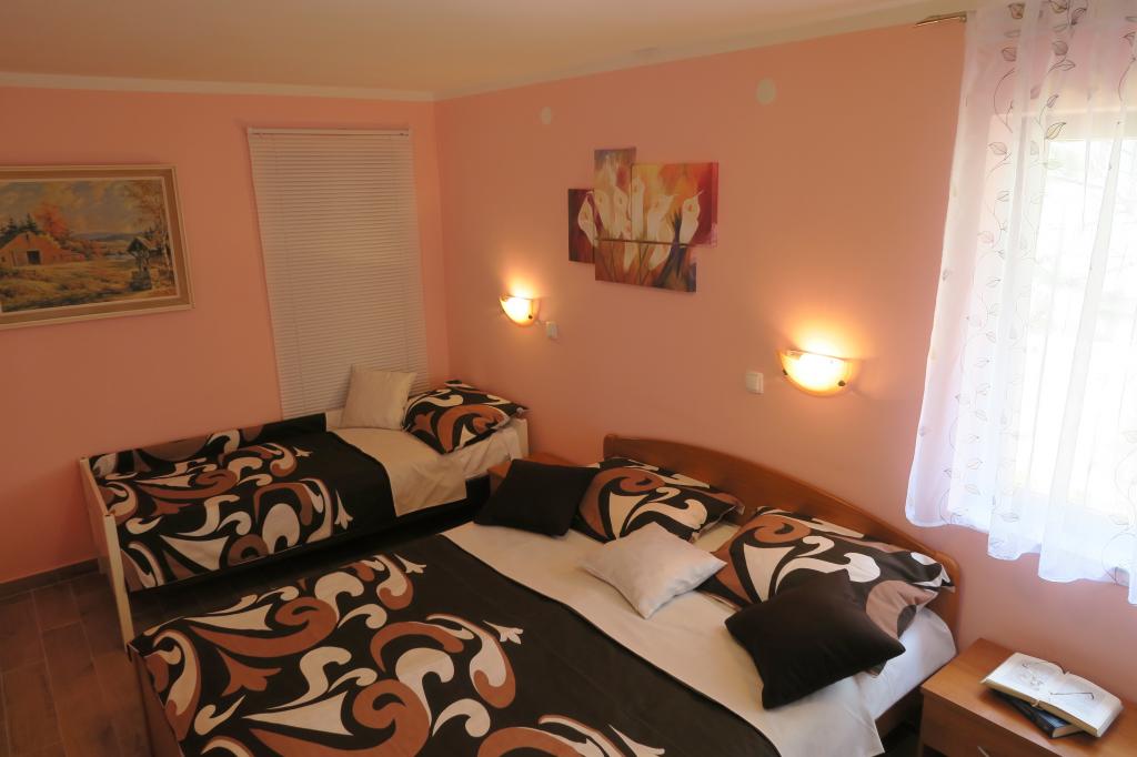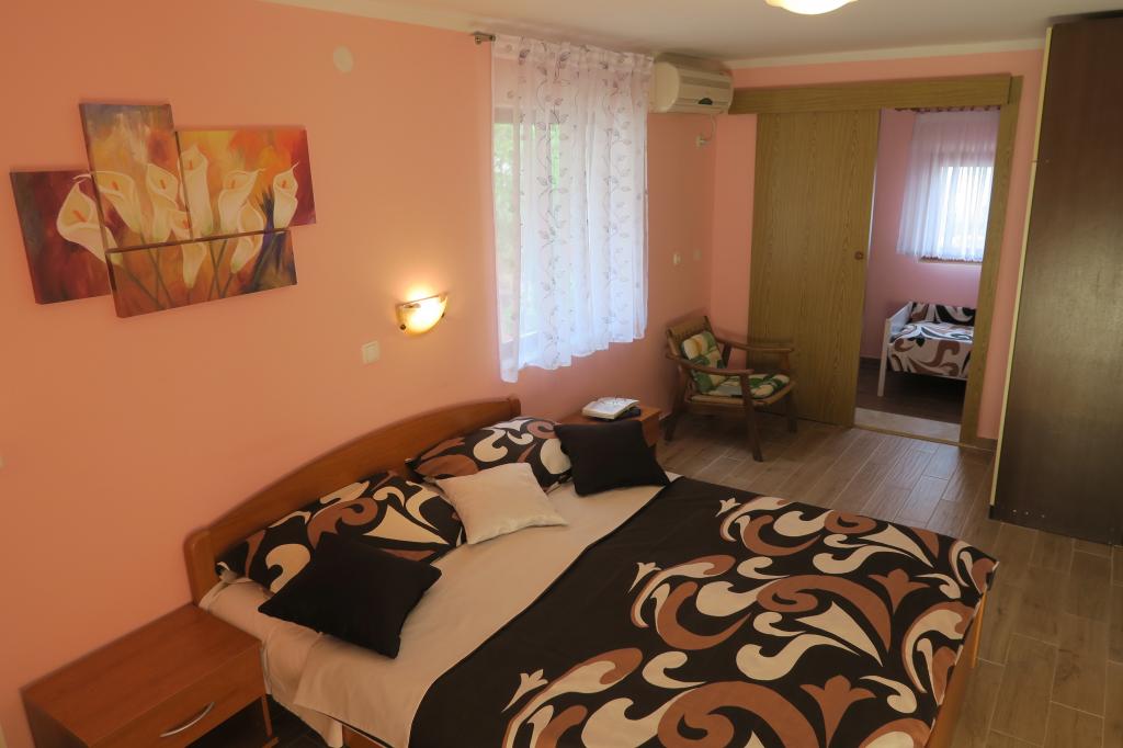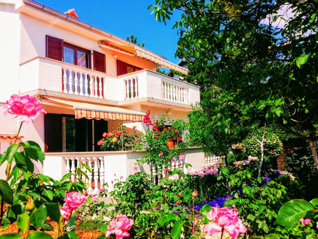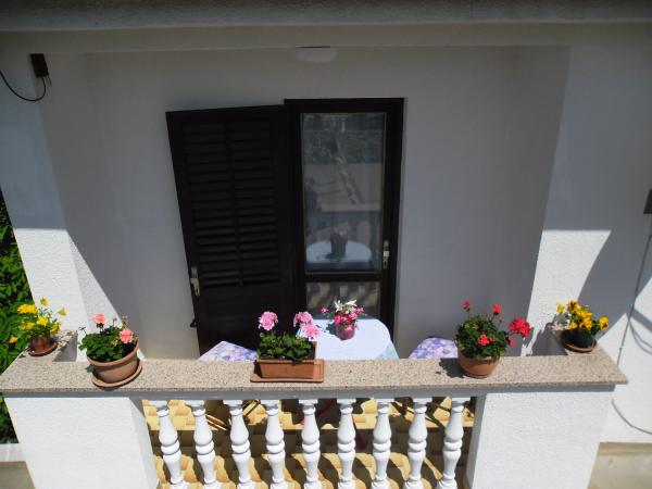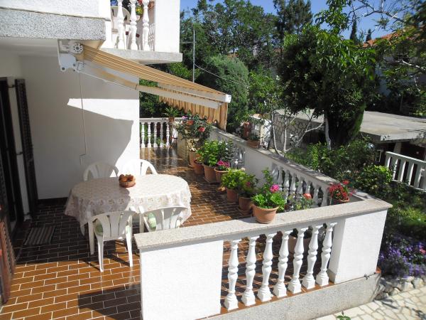 Kuća je smještena oko 350m od mora , ima lijepe balkone i velike terase , grill i veliki parking. Kuća ima dva apartmana za dvije i tri osobe s mogućnošću dodatnog ležaja u oba apartmana. Kuća je sva u zelenilu i udaljena je od mora oko 350m. U dvorištu je i roštilj koji stoji na raspolaganju. Apartmani imaju televiziju i satelitsku , klimu , internet , svu posteljinu i opremljene kuhinje i kupaonice. Oba apartmana imaju i terase te parkirno mjesto.