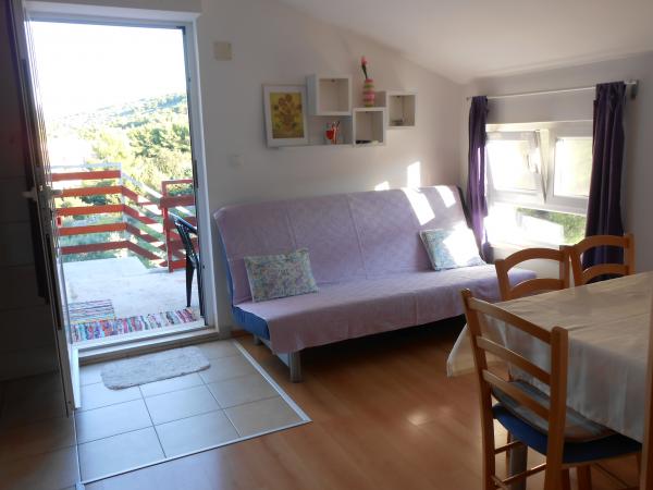 Apartmani su smjesteni u obiteljskoj kuci. U 3 apartmana može se smjestiti ukupno 16 osoba. 1. Apartman A1 (6 +2), 65 m2, 3 spavaće sobe (dvije sa duplim krevetom), u dnevnoj sobi kauč na razvlačenje za 2 osobe, kuhinja opremljena i mašinom za suđe, kupatilo sa kadom i WC, zaseban WC, velika orgadena terasa 40 m2 sa pogledom na more. Kompletno je opremljen i klimatiziran. Smjesten u prizemlju obiteljske kuce i okrenut prema moru. Pogodan za dvije obitelji sa djecom. 2. Apartmani A2 (2 + 2 ) a, 35 m2, Spavaća soba sa duplim krevetom, dnevna soba/kuhinja sa kutnim ležajem na razvlacenje za dvije osobe, kupatilo sa tus kabinom, , terasa. Kompletno opremljen i klimatiziran. Smjesten na drugom katu obiteljske kuce, okrenut moru. 3. Apartman A2 (2 +2) b, 24 m2. Spavaća soba sa duplim krevetom, dnevna soba sa kaučem na razvlačenje, kuhinja kompletno opremljena, kupatilo sa tuš kabinom, terasa sa pogledom na more i brežuljke, smješten na drugom katu. Identičan ap.a ali nešto manji.