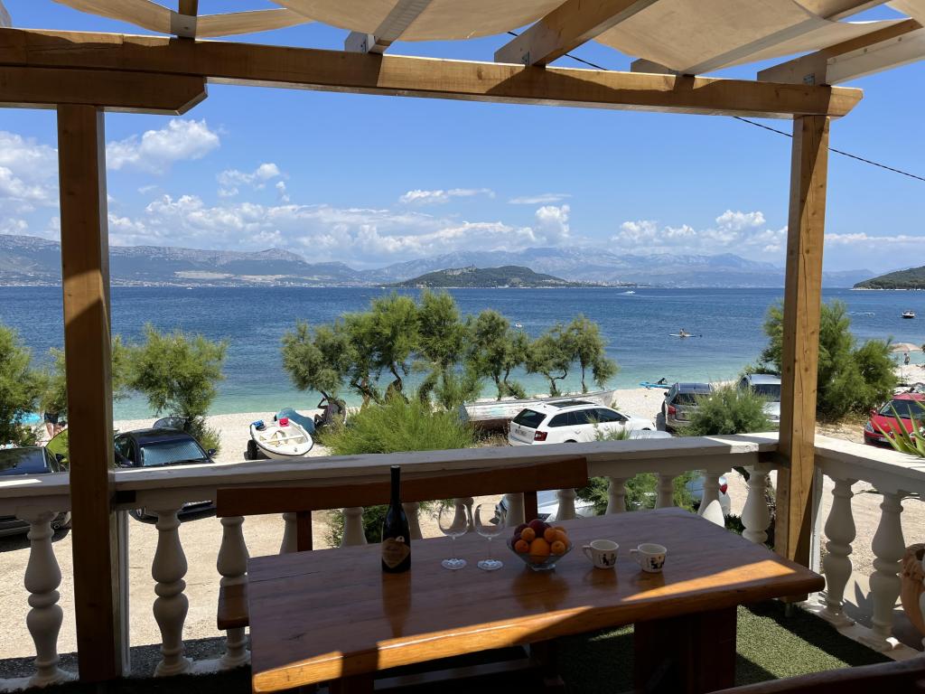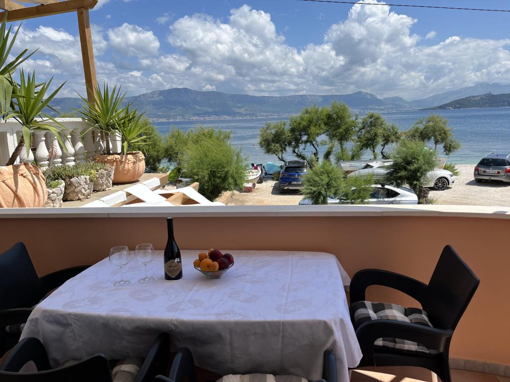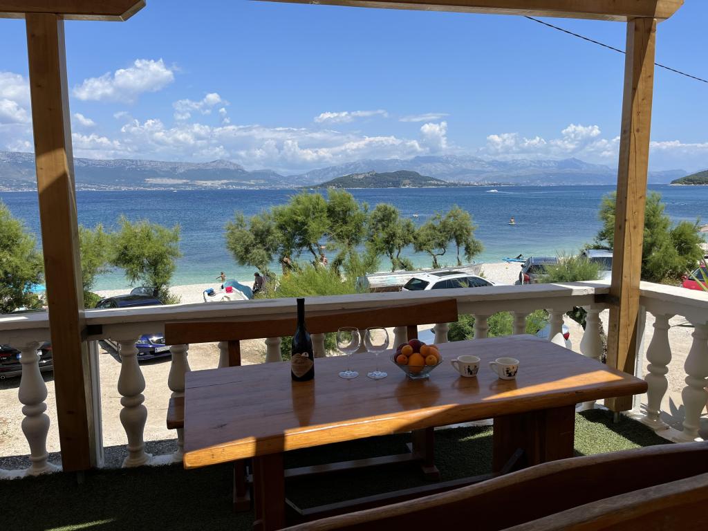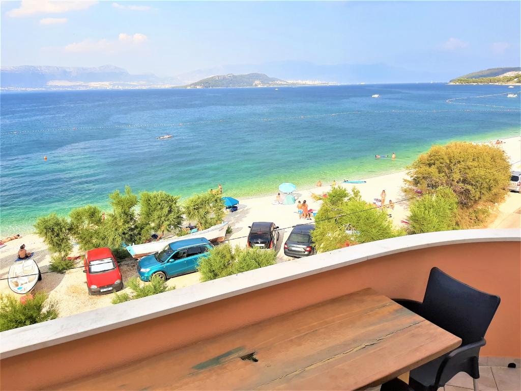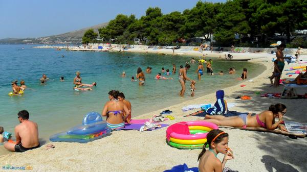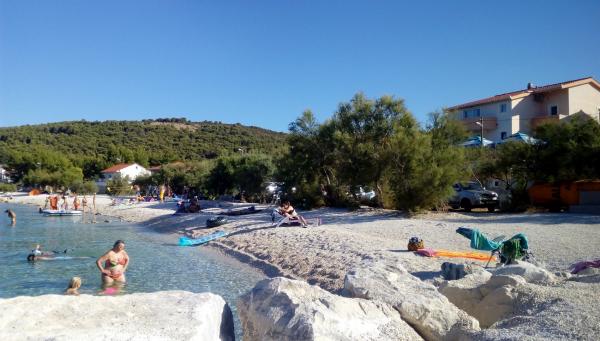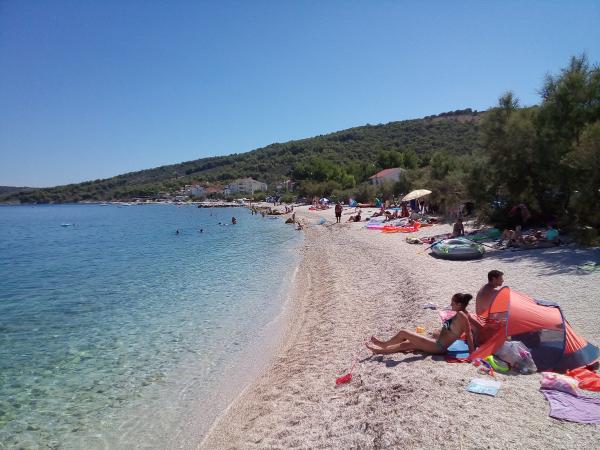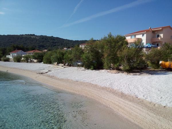 Apartmani se nalaze u neposrednoj blizini plaže, udaljeni samo 10 metara, s prekrasnim pogledom na more. Vrlo čisto, opremljeno svim potrebnim stvarima. Vlasnica je vrlo ljubazna, uslužna i brine se o svojim gostima. Uređena plaža sa sitnim šljunkom i vanjskim tušem. Mjesto je u mirnom području. Međutim, blizu je barova, restorana i vodenog igrališta. Blizu je izleta u Trogir i Split. Do tamo se može doći javnim prijevozom i trajektom.