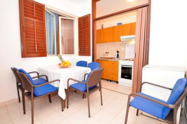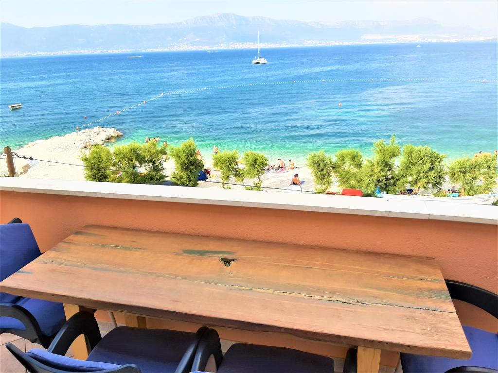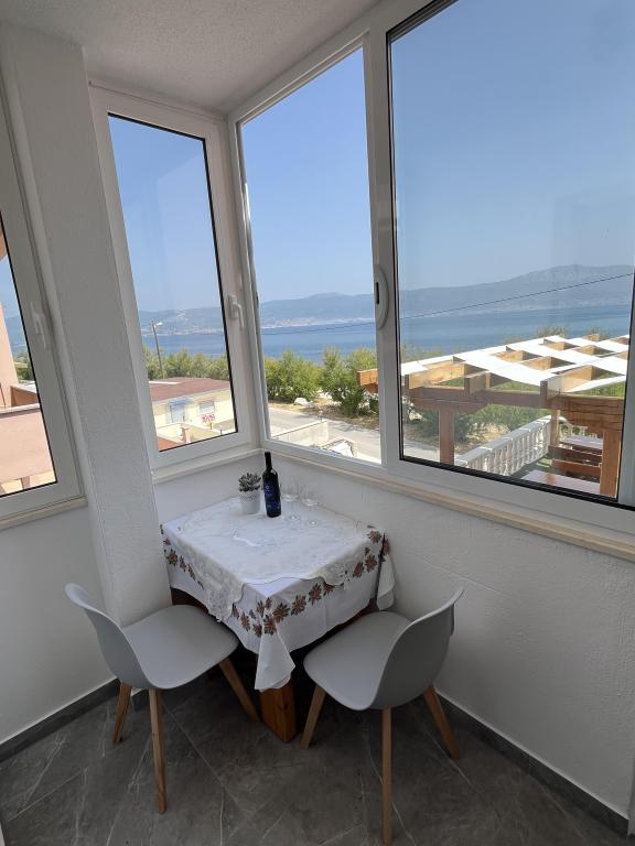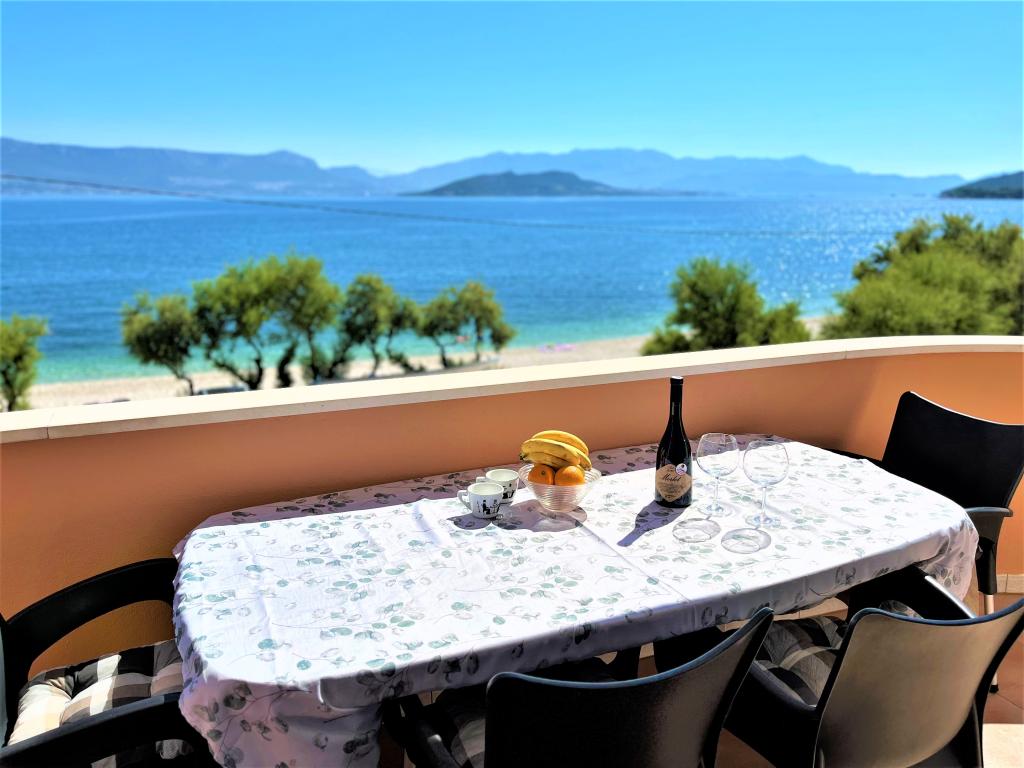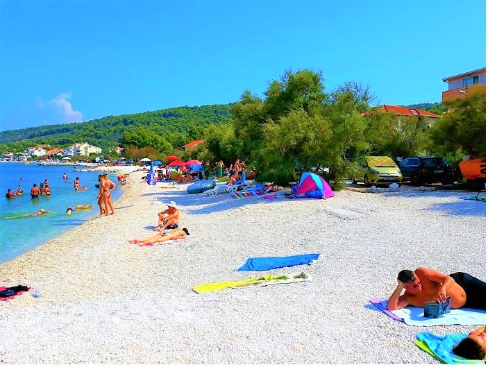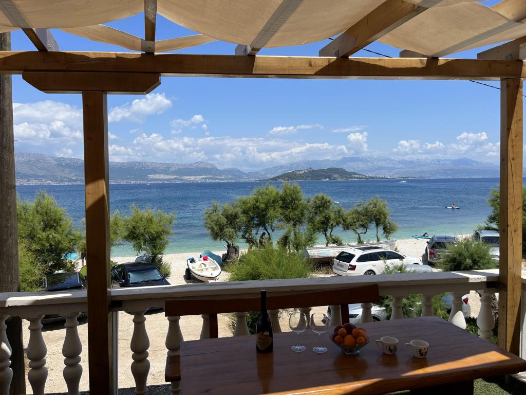 Apartmani se nalaze u neposrednoj blizini plaže, udaljeni samo 10 metara, s prekrasnim pogledom na more. Vrlo čisto, opremljeno svim potrebnim stvarima. Vlasnica je vrlo ljubazna, uslužna i brine se o svojim gostima. Uređena plaža sa sitnim šljunkom i vanjskim tušem. Mjesto je u mirnom području. Međutim, blizu je barova, restorana i vodenog igrališta. Blizu je izleta u Trogir i Split. Do tamo se može doći javnim prijevozom i trajektom.