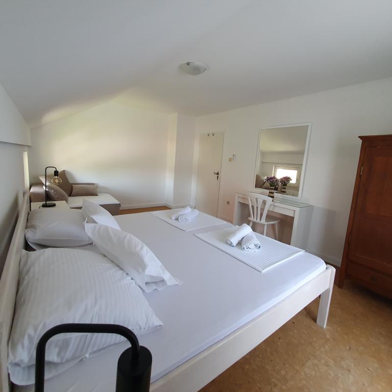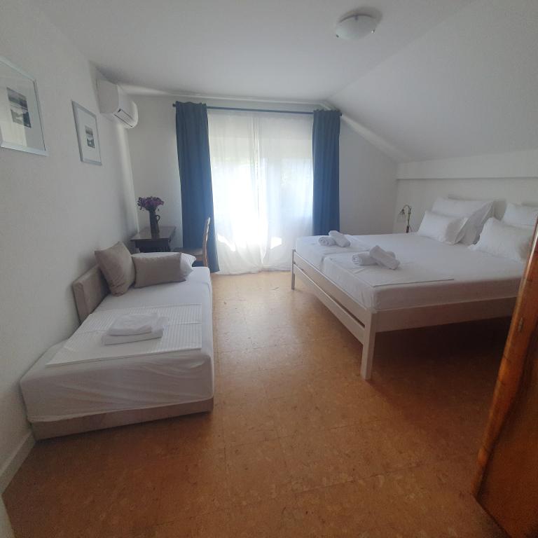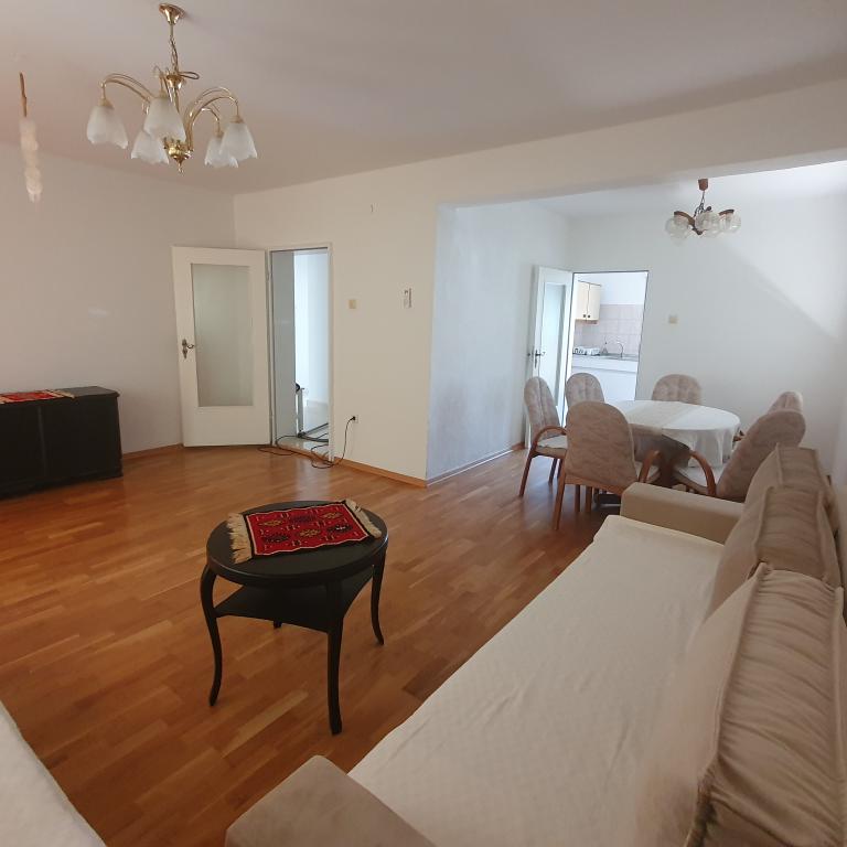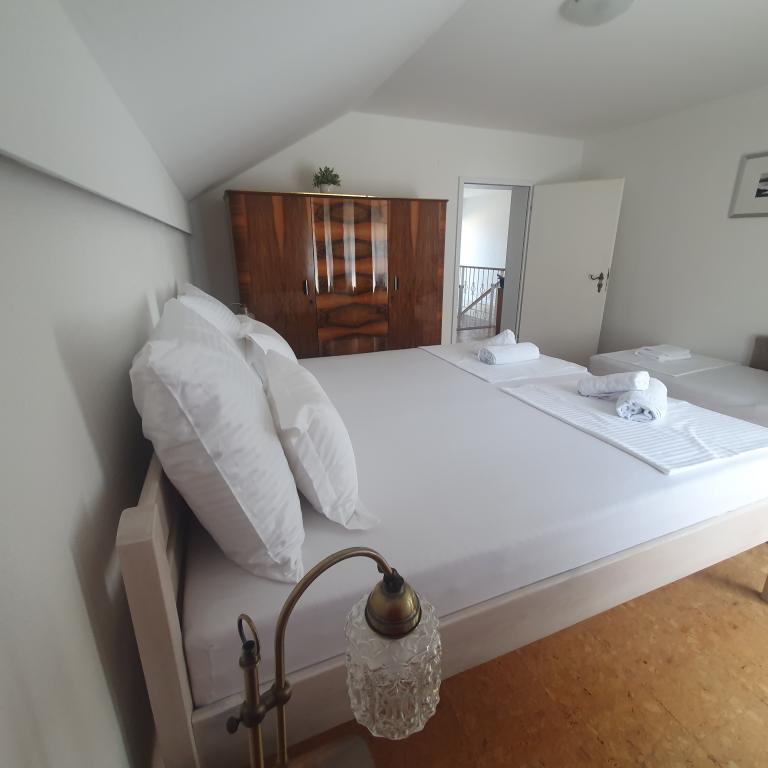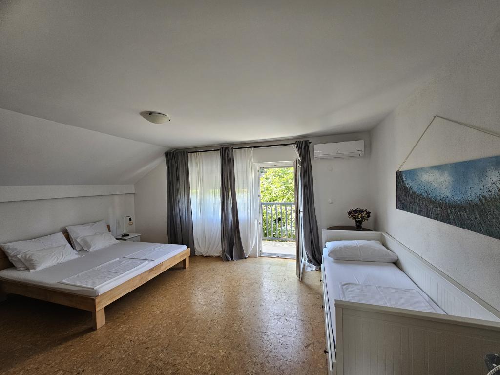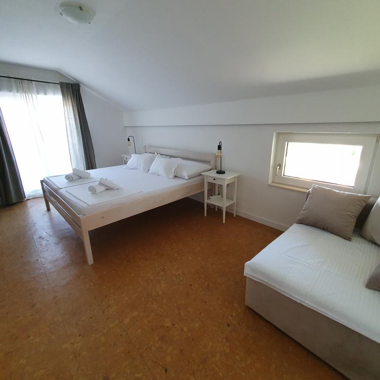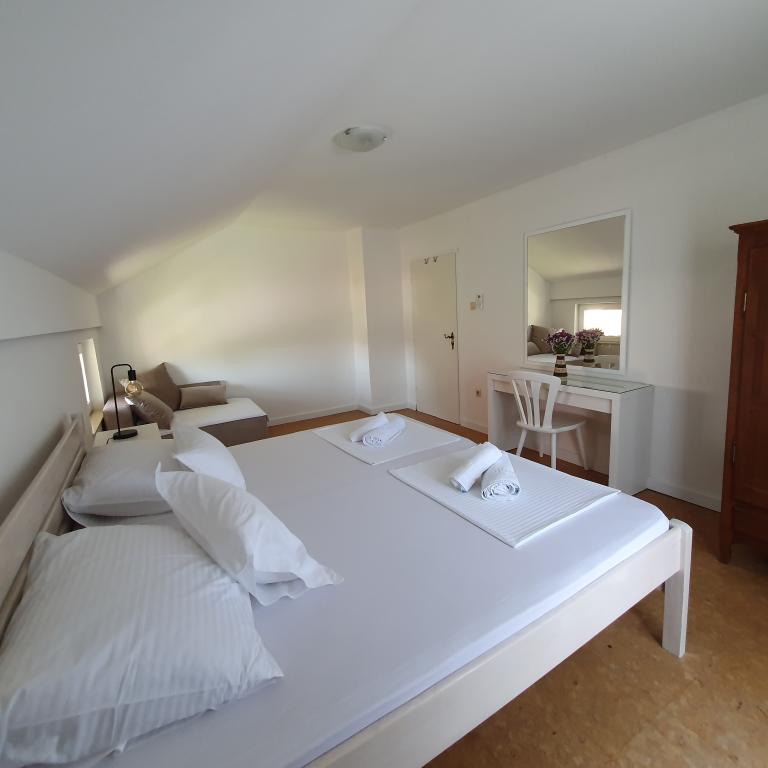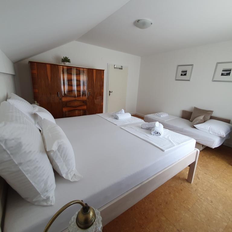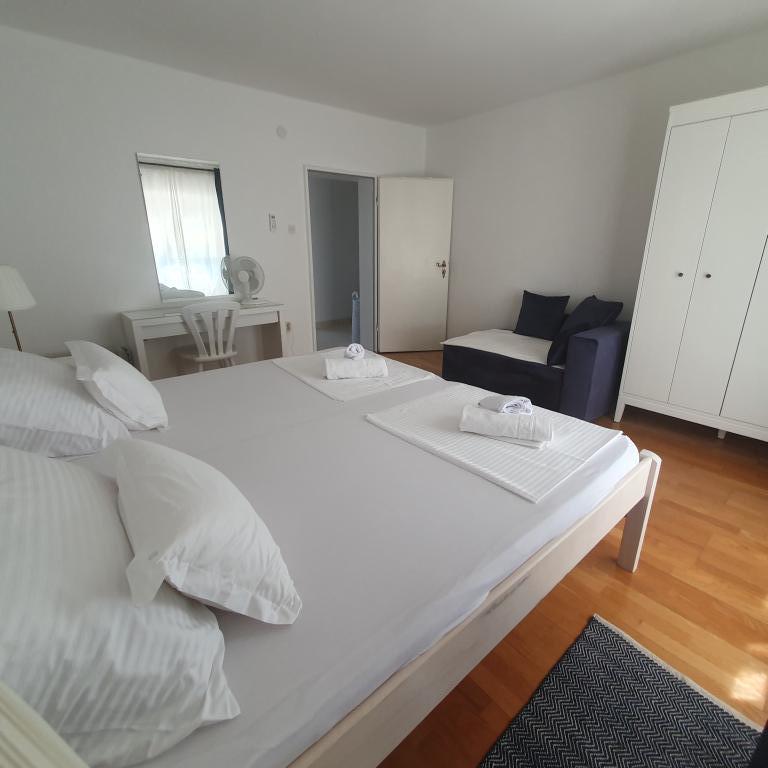 Apartman 4+4 105 m2 - 1. kat ima veliku terasu od 80 m2 na jednoj strani kuće u prekrasnoj hladovini možete boraviti cijelo vrijeme. S druge strane kuće imate i veliki balkon koji ima lijep pogled. Svaka soba je klimatizirana Soba br 1 - s velikim bračnim krevetom 200x200 te pomoćnim, udobnim krevetom 90 x200, Soba br. 2 - ima dva kreveta 90x200, Dnevni boravak ima 2 velika kreveta na razvlačenje 160 x200. - izlazak na veliku terasu. Kuhinja je odvojena i ima izlaz na veliki balkon. Kupatilo je prostrano. Apartman 6+4 -2. kat 105 m2 svaka soba ima klimu, kuhinja je odvojena, Kupatilo. 2 velika balkona. Soba br. 1 - veliki krevet 200x200 i pomoćni ležaj 90 x200 - izlazak na veliki balkon Soba br. 2. - veliki krevet 200x200 i krevet na razvlačenje 160 x200 - izlazak na mali balkon Soba br, 3 - veliki krevet 200x200 i pomoćni ležaj 90 x200 Hodnik prostrani - izlazak na veliki balkon