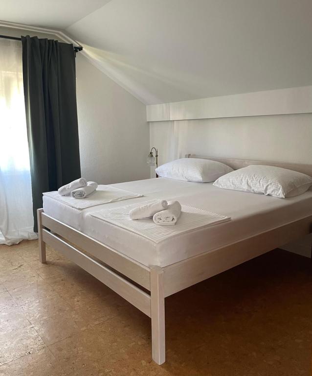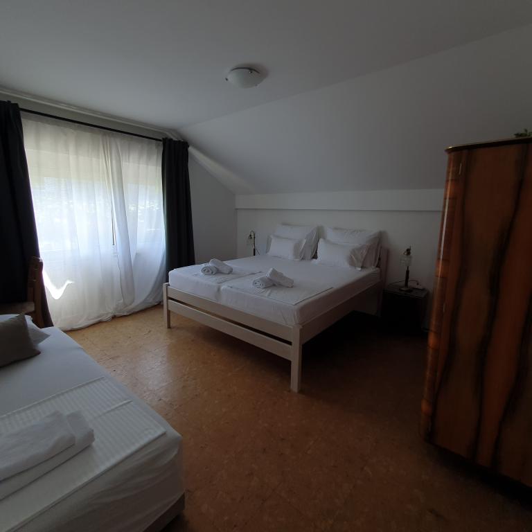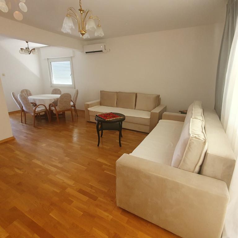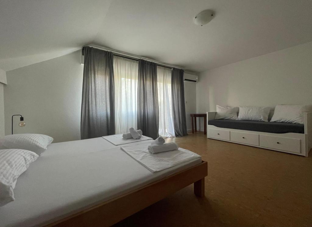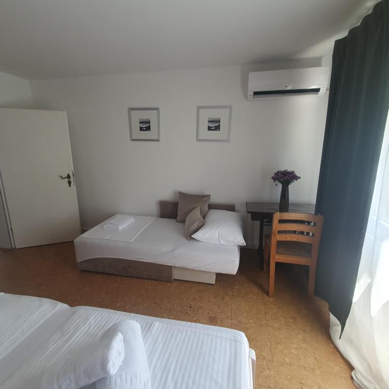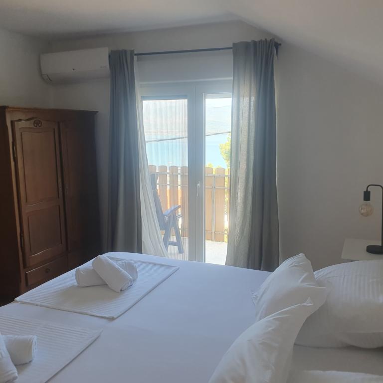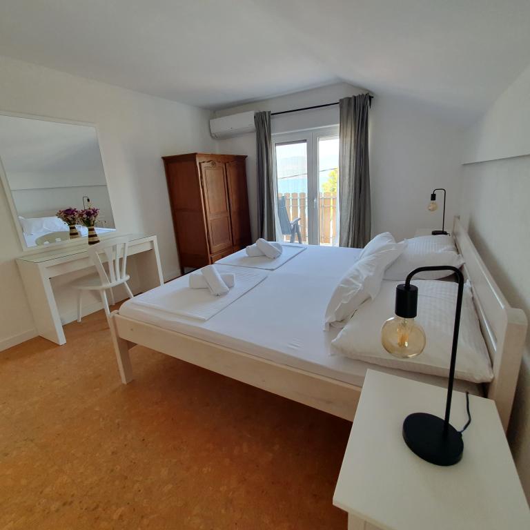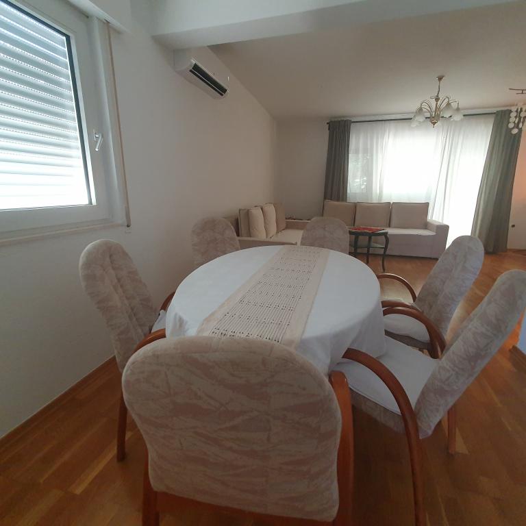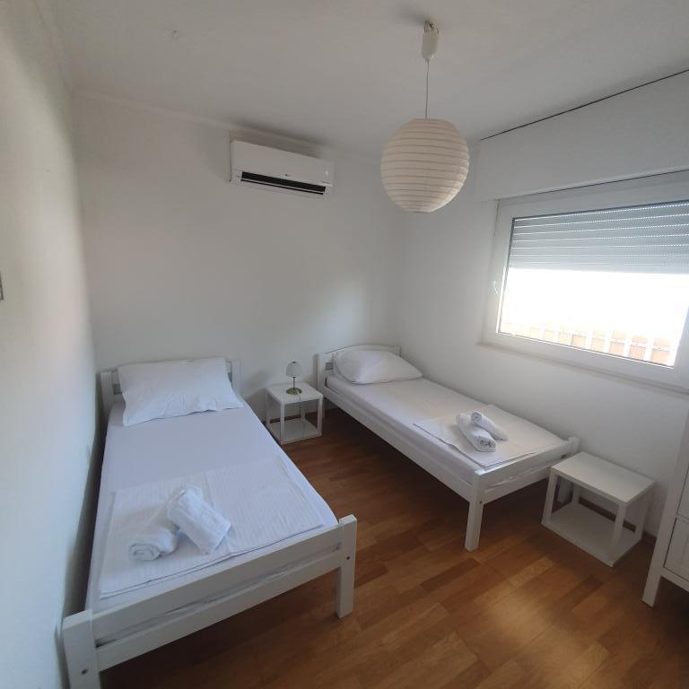 Apartman 4+4 105 m2 - 1. kat ima veliku terasu od 80 m2 na jednoj strani kuće u prekrasnoj hladovini možete boraviti cijelo vrijeme. S druge strane kuće imate i veliki balkon koji ima lijep pogled. Svaka soba je klimatizirana Soba br 1 - s velikim bračnim krevetom 200x200 te pomoćnim, udobnim krevetom 90 x200, Soba br. 2 - ima dva kreveta 90x200, Dnevni boravak ima 2 velika kreveta na razvlačenje 160 x200. - izlazak na veliku terasu. Kuhinja je odvojena i ima izlaz na veliki balkon. Kupatilo je prostrano. Apartman 6+4 -2. kat 105 m2 svaka soba ima klimu, kuhinja je odvojena, Kupatilo. 2 velika balkona. Soba br. 1 - veliki krevet 200x200 i pomoćni ležaj 90 x200 - izlazak na veliki balkon Soba br. 2. - veliki krevet 200x200 i krevet na razvlačenje 160 x200 - izlazak na mali balkon Soba br, 3 - veliki krevet 200x200 i pomoćni ležaj 90 x200 Hodnik prostrani - izlazak na veliki balkon