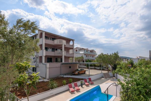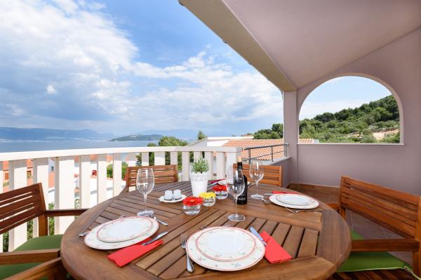 Kroz kratku priču slikovito bismo Vas upoznali sa Villom Maris; obiteljsko domaćinstvo savršeno za opušteni, ispunjeni obiteljski odmor. Nalazi se u Slatinama; 9 km od grada Trogira, 100m od plaže 1, 8 km od najljepše plaže (nenaseljene) na otoku, mi Vam nudimo 3 app, veliki bazen (9, 80x3, 50), vrt, parkirno mjesto Svaki app je opremljen sa wi fi, terasom s pogledom na more. Prvi je na visokoj razini u prizemlju, 3 spavaće sobe kapaciteta 6kreveta u ukupno, 35m2 terase, kuhinja sa svim kuhinjskim nužnostima, kupaonica. Drugi ap je je na prvom katu 3 sobe 6 mjesta ukupno, kuhinja s dnevnim boravkom, kupaonica i 25m2 terase treći je na drugom katu. , pogodan za 6 osoba, dnevni boravak, kuhinja, kupaonica, terasa 20m2. Sve tri ap su potpuno opremljeni sa ; mašina za pranje (kuhinja / kupaonica), WiFi priključak, SAT TV, klima uređaj, mikrovalna pećnica, parkirno mjesto.