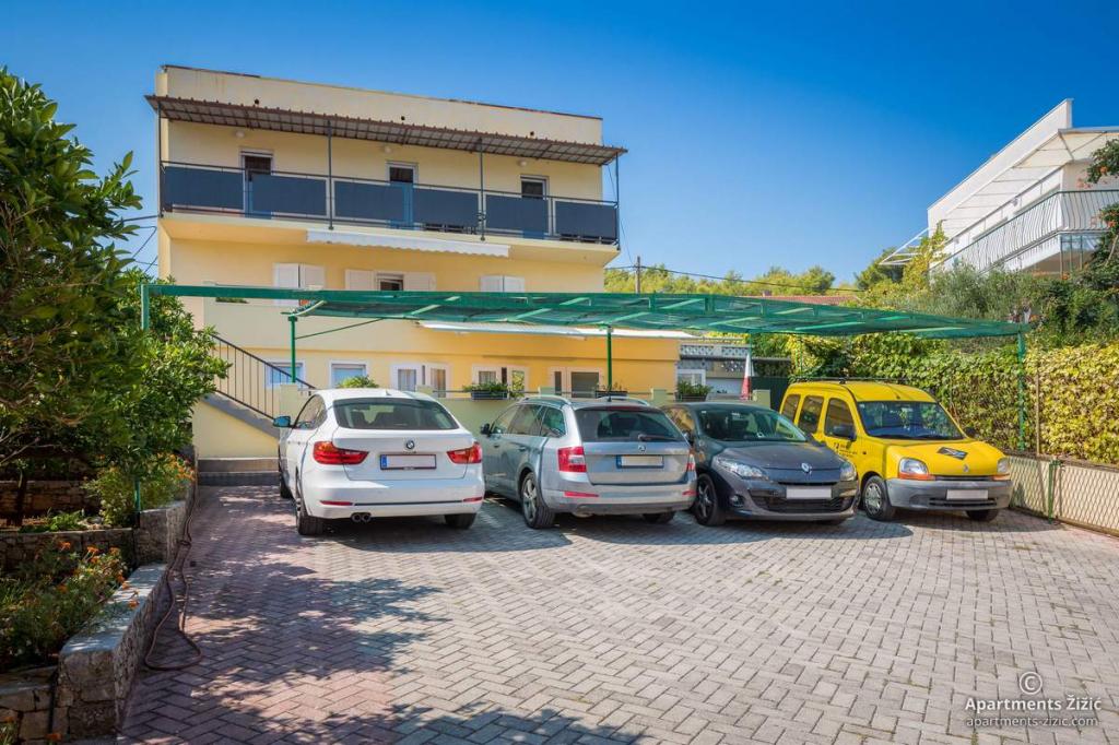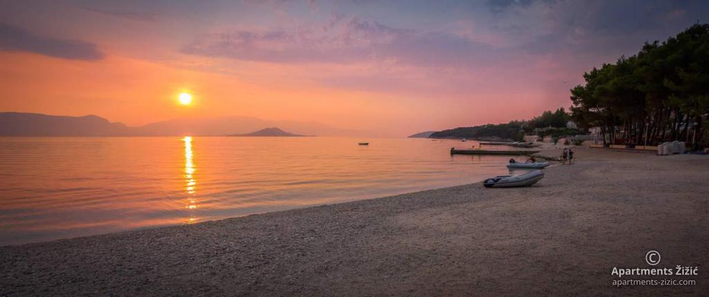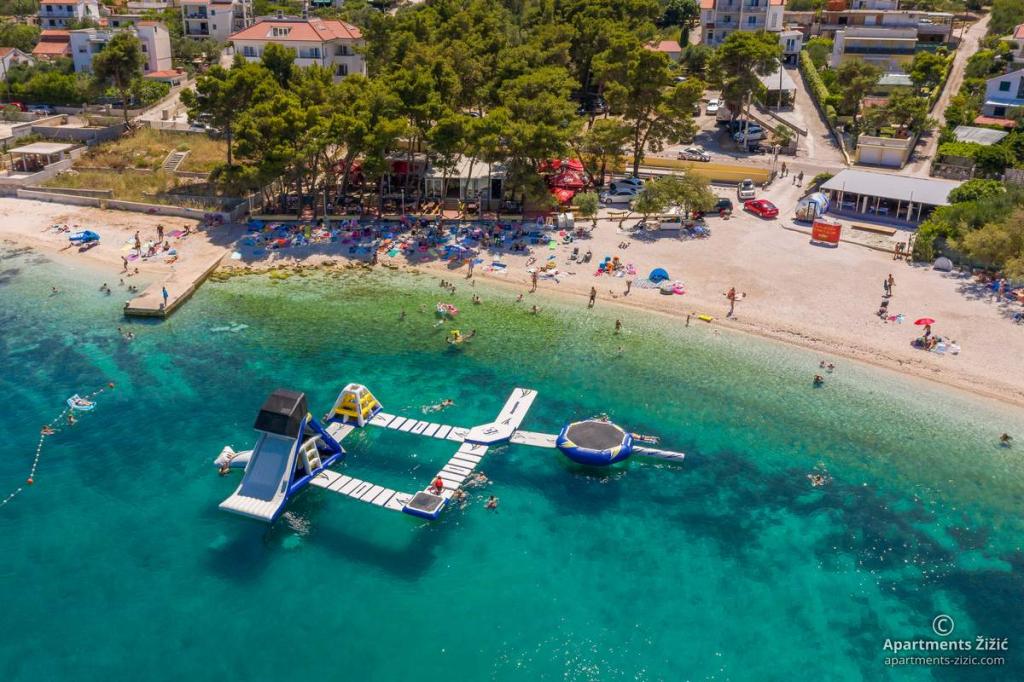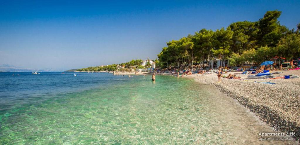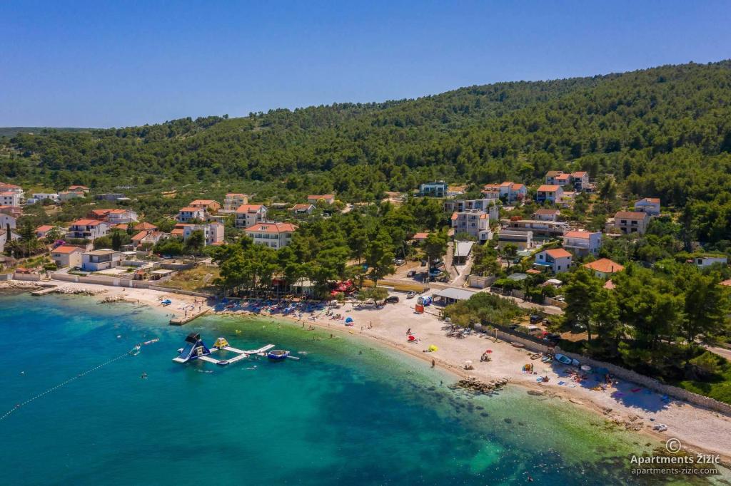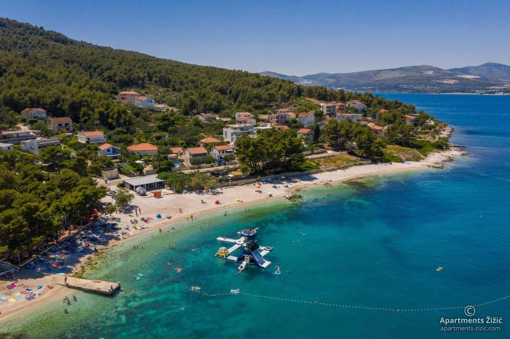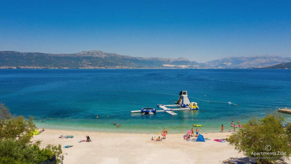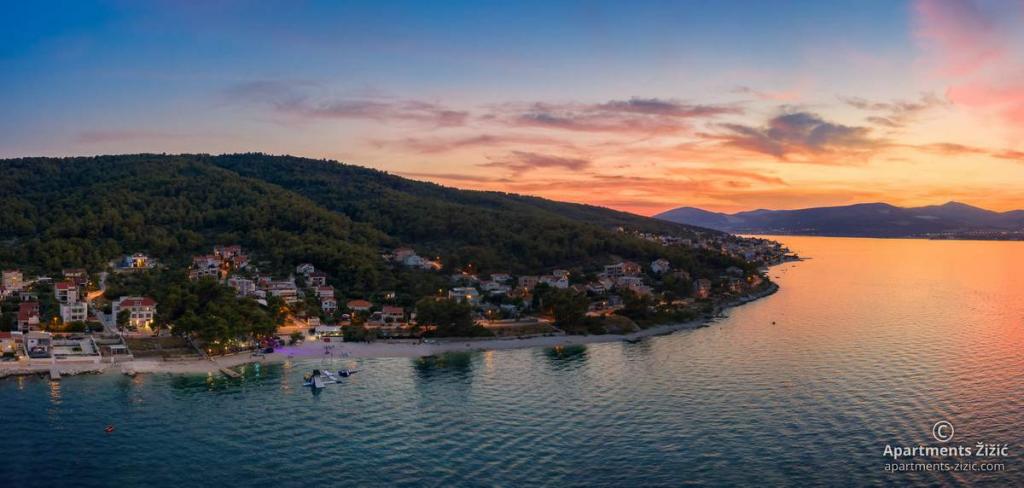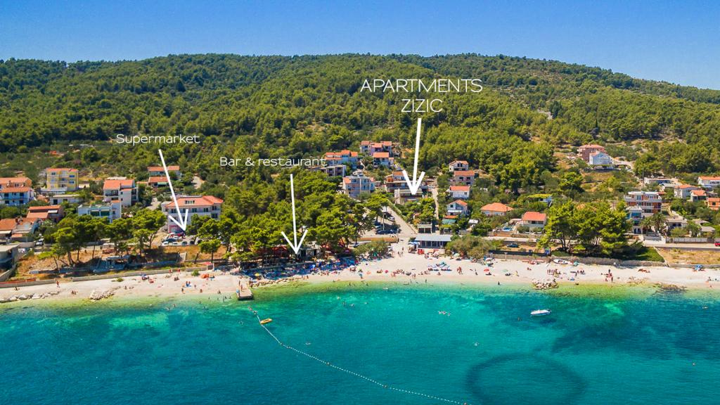 Apartmani Žižić se nalaze na otoku Čiovu u Hrvatskoj, udaljeni su 1 km od mjesta Slatine i 7 km od grada Trogira. Naši apartmani su idealan izbor za provesti miran i relaksirajuć odmor, okruženi prirodom i mediteranskim biljkama, udaljeni samo 20 metara od prekrasne plaže. Svaki apartman ima terasu, odvojene sobe, kuhinju sa pripadajućim aparatima, dnevnu sobu i kupaonicu. Također je za apartmane A4 i A5 osigurano jedno parkirno mjesto na natkrivenom i zatvorenom parkingu (ispred kuće), a za A6 apartman 2 parkirna mjesta. Na plaži ispred kuće se nalazi i ugostiteljski objekt sa caffe-barom i restoranom, uz mogućnost iznajmljivanja suncobrana i ležaljki, te korištenja tuša. Samo 80 m od kuće je supermarket i bankomat.